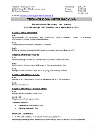 Wydział Politologii UMCS Zakład Stosunków Międzynarodowych Dr Damian Szacawa Konsultacje: Wtorek: Czwartek: pok. 210 7.30-8.00 7.30-8.00 13.00-15.00 Kontakt: [email protected] TECHNOLOGIA INFORMACYJNA Bezpieczeństwo Narodowe, I rok, I stopień Wydział Politologii UMCS Lublin – rok akademicki 2014 / 2015 CZĘŚĆ 1. WPROWADZENIE CA 1. Wprowadzenie do przedmiotu (cykl analityczny, sformułowania tematu i problemu badawczego) analiza naukowa, zasady prawidłowego CA 2. Zasady sporządzania fiszek, przypisów i bibliografii CA 3. Źródła (wyszukiwanie pozycji do bibliografii, prezentacja wybranych baz danych) CZĘŚĆ 2. MICROSOFT WORD CA 4. Ogólne zasady pisania tekstu, formatowanie dokumentu przed wydrukiem CA 5. Pakiet biurowy Worda (szablony i formularze, korespondencja seryjna) CA 6. Porządkowanie dokumentu (spis treści, przypisy, spis ilustracji, indeksy) CZĘŚĆ 3. MICROSOFT EXCEL CA 7. Obliczania w Excelu (pisanie formuł, projektowanie arkuszy obliczeniowych) CA 8. Rysowanie wykresów CZĘŚĆ 4. MICROSOFT POWER POINT CA 9. Przygotowanie prezentacji (case study) CA 10 – 15. Wygłoszenie referatu z prezentacją Zaliczenie ćwiczeń: Prezentacja case-study – 50% Udział w dyskusji – 50% WYBRANA LITERATURA 1. E. Dyka, M. Mończyk, Technologia Informacyjna, Łódź 2011. Prowadzący zastrzega sobie możliwość uzupełnienia listy literatury do zajęć w trakcie semestru. 1 Wydział Politologii UMCS Zakład Stosunków Międzynarodowych Dr Damian Szacawa Konsultacje: Wtorek: Czwartek: pok. 210 7.30-8.00 7.30-8.00 13.00-15.00 Kontakt: [email protected] ZASADY OPRACOWYWANIA CASE STUDY W analizie powinny zostać ujęte następujące zagadnienia: motywy – mile widziane hipotezy badawcze, czyli wyjaśnienie DLACZEGO? dokładne wprowadzenie – w zależności od tematu, np. wyjaśnienie pojęć i terminów, tło sytuacji geopolitycznej, społecznej, ekonomicznej w danym regionie analiza poszczególnych części składowych wystąpienia (np. podstawy prawne, cele, instrumentarium działań, źródło finansowania) wnioski !!! bibliografia niezbędne są mapy, zdjęcia, tabele, wykresy itp. (wraz z przywołaniem źródła) ZASADY PREZENTACJI Ogólne zasady przygotowywania oraz głoszenia referatu (prezentacji multimedialnej). Przed przystąpieniem do pracy skonsultuje się z prowadzącym zajęcia w celu ustalenia zakresu materiału (patrz wyżej), tematu (zgodnego z kierunkiem studiów), formy i czasu trwania referatu itp. Dokładnie przeczytaj podaną oraz samodzielnie znalezioną literaturę/materiały z danego zakresu; przygotuj się – to Ty masz być ekspertem i to Tobie będą zadawane pytania; zastanów się, które informacje są naprawdę ważne, ciekawe, warte zapamiętania Przygotuj plan wypowiedzi (wstęp – powiedz o czym powiesz, pamiętaj o podaniu źródeł; rozwinięcie – powiedz TO; zakończenie – powiedz o czym powiedziałeś); Opracuj stronę graficzną. Pamiętaj, iż tworząc prezentację należy brać pod uwagę następujące warunki gwarantujące jej powodzenie: o Prostota i właściwa wizualność przekazu o Mała ilość słów o Używanie kluczowych słów i znaków o Stosowanie map, wykresów lub zdjęć o Unikanie przesytu prezentacji o Pokazywanie obrazów z objaśnieniami o Właściwy dobór kolorystyczny (umiar w ilości kolorów i czcionek) Koniecznie sprawdź czy nie przekroczysz wyznaczonego czasu, np. zrób próbę w domu !!! BEZWARUNKOWO, NAJPÓŹNIEJ DO SOBOTY NAJBLIŻSZEJ PRZED TERMINEM PREZENTACJI REFERATU, PRZEŚLIJ JEGO TREŚĆ ORAZ SLAJDY DO AKCEPTACJI PROWADZĄCEGO ZAJĘCIA: [email protected] (plik w wersji: Prezentacja programu Power Point 972003 (.ppt) Wygłaszając referat i przedstawiając prezentację multimedialną możesz korzystać z notatek, ale staraj się nie czytać! Pamiętaj o właściwych zachowaniach niewerbalnych (kontakt wzrokowy, postawa ciała, mimika, intonacja) i werbalnych (wyraźna artykulacja, gramatyczna poprawność, krótkie zdania); Koleżanki i koledzy nie obrażą się za najważniejsze dane i tezy z Twojego referatu do odbicia na ksero lub dostęp do elektronicznej jego wersji 2