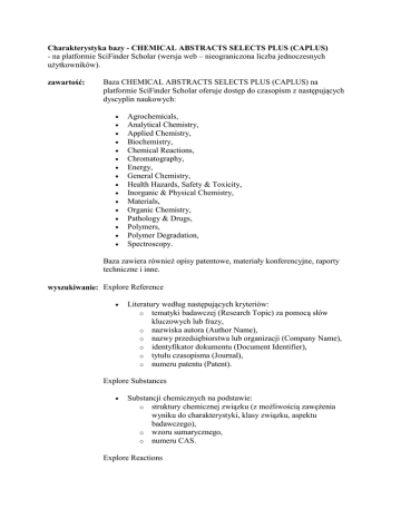 Charakterystyka bazy - CHEMICAL ABSTRACTS SELECTS PLUS (CAPLUS) - na platformie SciFinder Scholar (wersja web – nieograniczona liczba jednoczesnych użytkowników). zawartość: Baza CHEMICAL ABSTRACTS SELECTS PLUS (CAPLUS) na platformie SciFinder Scholar oferuje dostęp do czasopism z następujących dyscyplin naukowych: Agrochemicals, Analytical Chemistry, Applied Chemistry, Biochemistry, Chemical Reactions, Chromatography, Energy, General Chemistry, Health Hazards, Safety & Toxicity, Inorganic & Physical Chemistry, Materials, Organic Chemistry, Pathology & Drugs, Polymers, Polymer Degradation, Spectroscopy. Baza zawiera również opisy patentowe, materiały konferencyjne, raporty techniczne i inne. wyszukiwanie: Explore Reference Literatury według następujących kryteriów: o tematyki badawczej (Research Topic) za pomocą słów kluczowych lub frazy, o nazwiska autora (Author Name), o nazwy przedsiębiorstwa lub organizacji (Company Name), o identyfikator dokumentu (Document Identifier), o tytułu czasopisma (Journal), o numeru patentu (Patent). Explore Substances Substancji chemicznych na podstawie: o struktury chemicznej związku (z możliwością zawężenia wyniku do charakterystyki, klasy związku, aspektu badawczego), o wzoru sumarycznego, o numeru CAS. Explore Reactions Reakcji chemicznych (z możliwością zawężenia wyniku do typu reakcji, źródła, roku publikacji). Ważne!!! Rejestracja musi być dokonana z komputera w sieci uczelnianej!. Ważne: adres email z domeny put.poznan.pl Ważne: hasło musi składać się z co najmniej 7 znaków i zawierać kombinację małych, dużych liter oraz cyfr) Ważne: Podczas rejestracji należy obowiązkowo wypełnić wszystkie pola oznaczone * Aktualizacja: 21-05-2013 Pracownia E-biblioteki Beata Korzystka