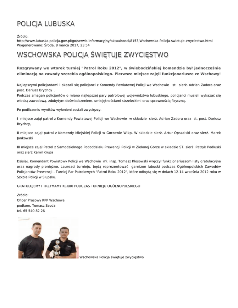 POLICJA LUBUSKA Źródło: http://www.lubuska.policja.gov.pl/go/serwis-informacyjny/aktualnosci/8153,Wschowska-Policja-swietuje-zwyciestwo.html Wygenerowano: Środa, 8 marca 2017, 23:54 WSCHOWSKA POLICJA ŚWIĘTUJE ZWYCIĘSTWO Rozgrywany we wtorek turniej "Patrol Roku 2012", w świebodzińskiej komendzie był jednocześnie eliminacją na zawody szczebla ogólnopolskiego. Pierwsze miejsce zajęli funkcjonariusze ze Wschowy! Najlepszymi policjantami i okazali się policjanci z Komendy Powiatowej Policji we Wschowie st. sierż. Adrian Zadora oraz post. Dariusz Brychcy . Podczas zmagań policjantów o miano najlepszej pary patrolowej województwa lubuskiego, policjanci musieli wykazać się wiedzą zawodową, zdobytym doświadczeniem, umiejętnościami strzeleckimi oraz sprawnością fizyczną. Po podliczeniu wyników wyłonieni zostali zwycięzcy. I miejsce zajął patrol z Komendy Powiatowej Policji we Wschowie w składzie sierż. Adrian Zadora oraz st. post. Dariusz Brychcy, II miejsce zajął patrol z Komendy Miejskiej Policji w Gorzowie Wlkp. W składzie sierż. Artur Opszalski oraz sierż. Marek Jankowski III miejsce zajął Patrol z Samodzielnego Pododdziału Prewencji Policji w Zielonej Górze w składzie ST. sierż. Patryk Podłuski oraz sierż Kamil Krupa Dzisiaj, Komendant Powiatowy Policji we Wschowie mł. insp. Tomasz Kłosowski wręczył funkcjonariuszom listy gratulacyjne oraz nagrody pieniężne. Laureaci turnieju, będą reprezentować garnizon lubuski podczas Ogólnopolskich Zawodów Policjantów Prewencji - Turniej Par Patrolowych "Patrol Roku 2012", które odbędą się w dniach 12-14 września 2012 roku w Szkole Policji w Słupsku. GRATULUJEMY I TRZYMAMY KCIUKI PODCZAS TURNIEJU OGÓLNOPOLSKIEGO Źródło: Oficer Prasowy KPP Wschowa podkom. Tomasz Szuda tel. 65 540 82 26 Wschowska Policja świętuje zwycięstwo Wschowska Policja świętuje zwycięstwo Wschowska Policja świętuje zwycięstwo Ocena: 0/5 (0) Tweetnij