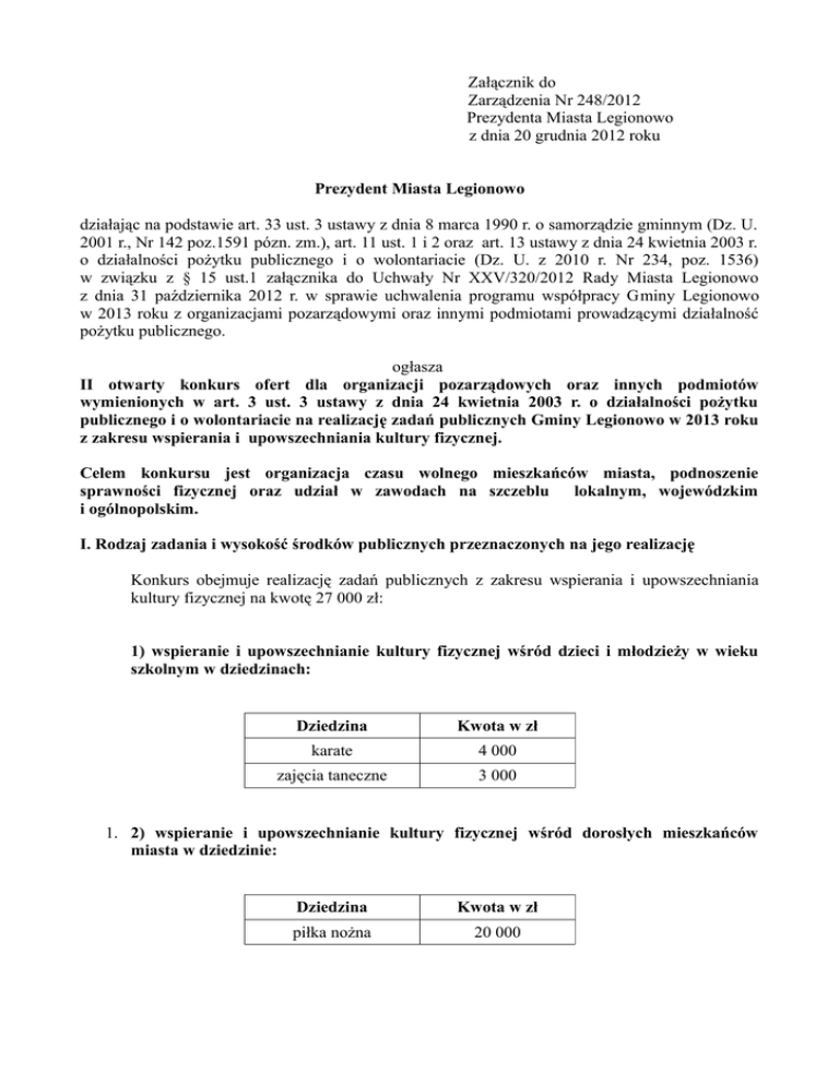 Załącznik do Zarządzenia Nr 248/2012 Prezydenta Miasta Legionowo z dnia 20 grudnia 2012 roku Prezydent Miasta Legionowo działając na podstawie art. 33 ust. 3 ustawy z dnia 8 marca 1990 r. o samorządzie gminnym (Dz. U. 2001 r., Nr 142 poz.1591 pózn. zm.), art. 11 ust. 1 i 2 oraz art. 13 ustawy z dnia 24 kwietnia 2003 r. o działalności pożytku publicznego i o wolontariacie (Dz. U. z 2010 r. Nr 234, poz. 1536) w związku z § 15 ust.1 załącznika do Uchwały Nr XXV/320/2012 Rady Miasta Legionowo z dnia 31 października 2012 r. w sprawie uchwalenia programu współpracy Gminy Legionowo w 2013 roku z organizacjami pozarządowymi oraz innymi podmiotami prowadzącymi działalność pożytku publicznego. ogłasza II otwarty konkurs ofert dla organizacji pozarządowych oraz innych podmiotów wymienionych w art. 3 ust. 3 ustawy z dnia 24 kwietnia 2003 r. o działalności pożytku publicznego i o wolontariacie na realizację zadań publicznych Gminy Legionowo w 2013 roku z zakresu wspierania i upowszechniania kultury fizycznej. Celem konkursu jest organizacja czasu wolnego mieszkańców miasta, podnoszenie sprawności fizycznej oraz udział w zawodach na szczeblu lokalnym, wojewódzkim i ogólnopolskim. I. Rodzaj zadania i wysokość środków publicznych przeznaczonych na jego realizację Konkurs obejmuje realizację zadań publicznych z zakresu wspierania i upowszechniania kultury fizycznej na kwotę 27 000 zł: 1) wspieranie i upowszechnianie kultury fizycznej wśród dzieci i młodzieży w wieku szkolnym w dziedzinach: Dziedzina Kwota w zł karate 4 000 zajęcia taneczne 3 000 1. 2) wspieranie i upowszechnianie kultury fizycznej wśród dorosłych mieszkańców miasta w dziedzinie: Dziedzina Kwota w zł piłka nożna 20 000 II. Zasady przyznawania dotacji 2. Zasady przyznawania dotacji zostały określone w art. 5 ust. 3 ustawy z dnia 24 kwietnia 2003 r o działalności pożytku publicznego i wolontariacie (Dz. U. z 2010 r Nr 234, poz. 1536). 3. Dofinansowanie nie może przekraczać 80 % całkowitych kosztów zadania. 4. Organizacja pozarządowa i podmiot ubiegający się o wsparcie finansowe gminy wykazują w swojej ofercie udział środków własnych. 5. Organizacja pozarządowa i podmiot ubiegający się o wsparcie finansowe gminy zobowiązany jest do prowadzenia wyodrębnionej dokumentacji finansowo-księgowej i ewidencji księgowej zadania publicznego, zgodnie z zasadami wynikającymi z ustawy z dnia 29 września 1994 r. o rachunkowości (Dz. U. z 2009 r. Nr 152, poz. 1223, z późn. zm.), w sposób umożliwiający identyfikację poszczególnych operacji księgowych. 6. Koszty administracyjne nie mogą przekroczyć 20 % wnioskowanej kwoty dotacji. 7. Złożenie oferty nie jest równoznaczne z przyznaniem dotacji. 8. Przyjęcie oferty nie jest równoznaczne z przyznaniem dotacji w wysokości wnioskowanej w kosztorysie. III. Termin i warunki realizacji zadania 1. Zadania powinny być realizowane na rzecz mieszkańców Legionowa. 2. Termin realizacji zadań: od dnia ogłoszenia wyników do 31 grudnia 2013 roku z zastrzeżeniem, że terminy realizacji zadań w poszczególnych dyscyplinach zostaną ściśle określone w umowach. 3. Dotacja może być przeznaczona w szczególności na: - realizację programów szkolenia sportowego, - zakup sprzętu sportowego, - pokrycie kosztów organizowania zawodów sportowych lub uczestnictwa w tych zawodach, - pokrycie kosztów korzystania z obiektów sportowych dla celów szkolenia sportowego, - pokrycie kosztów osobowych merytorycznych. IV. Termin i warunki składania ofert 1. Termin składania ofert wyznacza się do 14 stycznia 2013 roku do godz. 10.00. 2. Oferty należy składać osobiście w Biurze Obsługi Klienta: Urząd Miasta Legionowo, ul. marsz. J. Piłsudskiego 41, 05-120 Legionowo w poniedziałki w godzinach: 8.00-18.00; od wtorku do piątku w godzinach 8.00-16.00, lub za pośrednictwem poczty (decyduje data wpływu do Urzędu Miasta Legionowo) na adres: Urząd Miasta Legionowo ul. marsz. J. Piłsudskiego 41, 05-120 Legionowo. Oferty należy złożyć w zapieczętowanej kopercie. Na kopercie należy umieścić: pełną nazwę wnioskodawcy i jego adres, tytuł zadania oraz adnotację „nie otwierać przed posiedzeniem komisji konkursowej”. 3. Oferty należy składać, na formularzu zgodnym z załącznikiem nr 1 do Rozporządzenia Ministra Pracy i Polityki Społecznej z dnia 15 grudnia 2010 r. w sprawie wzoru oferty realizacji zadania publicznego, ramowego wzoru umowy o wykonanie zadania publicznego i wzoru sprawozdania z wykonania tego zadania (Dz. U. Z 2011 Nr 6, poz. 25). Formularz można pobrać ze strony www.bip.legionowo.pl w zakładce ,,Konkursy ofert”. 4. Do wypełnionego czytelnie formularza oferty, o którym mowa w pkt 3, podpisanego przez osoby upoważnione do składania oświadczeń woli, należy dołączyć: a) kopię aktualnego odpisu z KRS lub innego rejestru lub ewidencji, potwierdzone za zgodność z oryginałem opatrzone aktualną datą, pieczęcią oraz podpisem osoby upoważnionej do składania oświadczeń woli w imieniu organizacji pozarządowej lub podmiotu. Odpis musi być zgodny z aktualnym stanem faktycznym i prawnym, niezależnie od tego, kiedy został wydany. b) oświadczenie o prowadzeniu wyodrębnionej dokumentacji finansowo-księgowej i ewidencji księgowej zadania publicznego, zgodnie z zasadami wynikającymi z ustawy z dnia 29 września 1994 r. o rachunkowości (Dz. U. z 2009 r. Nr 152, poz. 1223, z późn. zm.). 5. Oferty niespełniające wymagań o których mowa w pkt 2 - 4 nie będą brały udziału w konkursie. V. Termin i tryb wyboru ofert 1. Oceny formalnej i merytorycznej ofert dokona Komisja Konkursowa powołana przez Prezydenta Miasta Legionowo, która opiniując oferty będzie kierowała się kryteriami podanymi w punkcie VI ogłoszenia. 2. Konkurs rozstrzyga Prezydent Miasta Legionowo, po zapoznaniu się z opinią Komisji Konkursowej. 3. Ogłoszenie o rozstrzygnięciu konkursu zostanie 