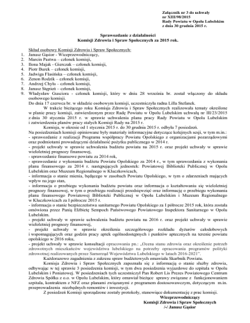 Załącznik nr 3 do uchwały nr XIII/98/2015 Rady Powiatu w Opolu Lubelskim z dnia 30 grudnia 2015 r. Sprawozdanie z działalności Komisji Zdrowia i Spraw Społecznych za 2015 rok. 1. 2. 3. 4. 5. 6. 7. 8. 9. Skład osobowy Komisji Zdrowia i Spraw Społecznych: Janusz Gąsior - Wiceprzewodniczący, Marcin Pastwa – członek komisji, Ilona Majak - Gierczak – członek komisji, Piotr Burek – członek komisji, Jadwiga Flasińska – członek komisji, Zenon Rodzik – członek komisji, Andrzej Chyła – członek komisji, Janusz Stępień – członek komisji, Władysław Gusciora - członek komisji, który w dniu 28 września br. został włączony do składu osobowego komisji. Do dnia 17 czerwca br. w składzie osobowym komisji, uczestniczyła radna Lilla Stefanek. W trakcie bieżącego roku Komisja Zdrowia i Spraw Społecznych realizowała tematy określone w planie pracy komisji, zatwierdzonym przez Radę Powiatu w Opolu Lubelskim uchwałą nr III/23/2015 z dnia 30 stycznia 2015 r. w sprawie uchwalenia planu pracy Rady Powiatu w Opolu Lubelskim i zatwierdzenia planów pracy stałych Komisji Rady na 2015 r. Komisja, w okresie od 1 stycznia 2015 r. do 30 grudnia 2015 r. odbyła 7 posiedzeń. Na posiedzeniach komisji opiniowane były materiały informacyjne dotyczące kolejnych sesji, w tym m.in.: - sprawozdanie z realizacji Programu współpracy Powiatu Opolskiego z organizacjami pozarządowymi oraz podmiotami prowadzącymi działalność pożytku publicznego w 2014 r. - projekt uchwały w sprawie uchwalenia budżetu powiatu na 2015 r. oraz projekt uchwały w sprawie wieloletniej prognozy finansowej, - sprawozdanie finansowe powiatu za 2014 rok, - sprawozdanie z wykonania budżetu Powiatu Opolskiego za 2014 r., w tym sprawozdania z wykonania planu finansowego za 2014 r. następujących jednostek: Powiatowej Biblioteki Publicznej w Opolu Lubelskim oraz Muzeum Regionalnego w Kluczkowicach, - informacja o stanie mienia, będącego w zasobach Powiatu Opolskiego, w tym o zdarzeniach mających wpływ na jego stan, - informacja o przebiegu wykonania budżetu powiatu oraz informacja o kształtowaniu się wieloletniej prognozy finansowej, w tym o przebiegu realizacji przedsięwzięć oraz informację o przebiegu wykonania planu finansowego Powiatowej Biblioteki Publicznej w Opolu Lubelskim i Muzeum Regionalnego w Kluczkowicach za I półrocze 2015 r. - informacja o stanie bezpieczeństwa sanitarnego Powiatu Opolskiego za I półrocze 2015 rok, która została omówiona przez Panią Elżbietę Sempoch Państwowego Powiatowego Inspektora Sanitarnego w Opolu Lubelskim. - projekt uchwały w sprawie uchwalenia budżetu powiatu na 2016 r. oraz projekt uchwały w sprawie wieloletniej prognozy finansowej, - projekt uchwały w sprawie określenia szczegółowego rozkładu dyżurów całodobowych i wspomagających oraz godzin pracy aptek ogólnodostępnych i punktów aptecznych na terenie powiatu opolskiego w 2016 roku, - projekt uchwały w sprawie konsultacji opracowania pn.: „Ocena stanu zdrowia oraz określenie potrzeb zdrowotnych mieszkańców województwa lubelskiego na potrzeby opracowania programów polityki zdrowotnej realizowanych przez Samorząd Województwa Lubelskiego w latach 2016-2021”. Każdorazowo zagadnienia z zakresu spraw budżetowych omawiała Skarbnik Powiatu. Komisja Zdrowia i Spraw Społecznych zapoznała się z informacją o stanie służby zdrowia, odbywając w tej sprawie 3 posiedzenia komisji, w tym dwa posiedzenia wyjazdowe do szpitala w Opolu Lubelskim i Poniatowej. W posiedzeniach tych uczestniczył Pan Robert Lis Prezes Powiatowego Centrum Zdrowia Spółka z o.o. w Opolu Lubelskim, który omawiał bieżące sprawy związane z funkcjonowaniem szpitala, kontraktem z NFZ oraz planami związanymi z programem dostosowawczym, dotyczącym m.in. przeprowadzenia niezbędnych remontów i inwestycji. Z posiedzeń Komisji sporządzone zostały protokoły, stanowiące dokumentację z prac komisji. Wiceprzewodniczący Komisji Zdrowia i Spraw Społecznych /-/ Janusz Gąsior