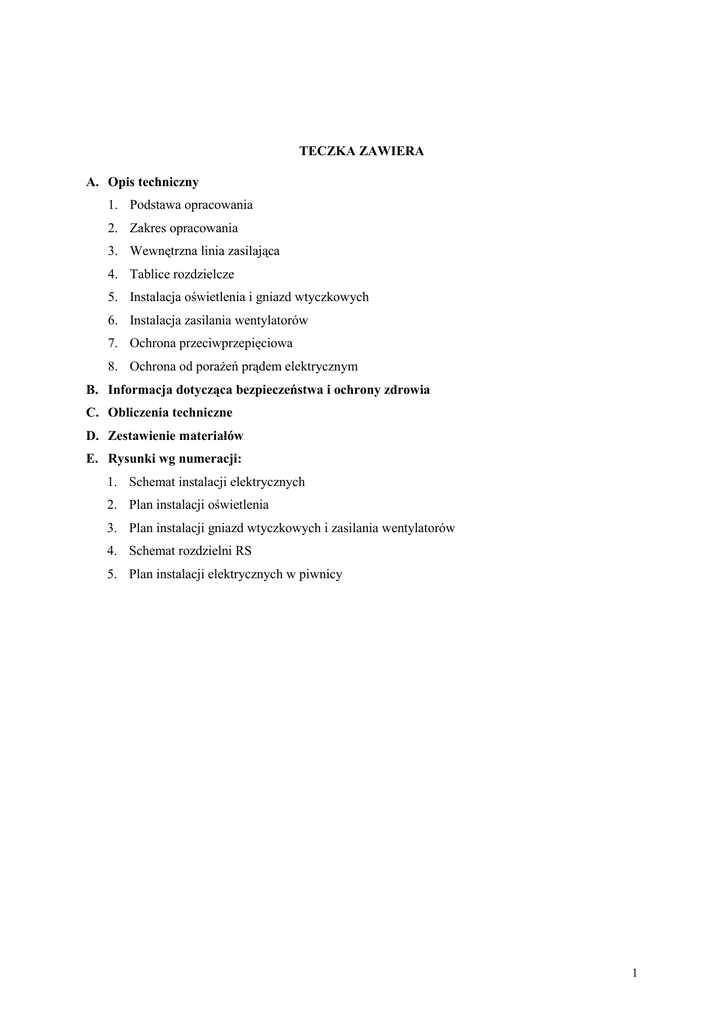 TECZKA ZAWIERA A. Opis techniczny 1. Podstawa opracowania 2. Zakres opracowania 3. Wewnętrzna linia zasilająca 4. Tablice rozdzielcze 5. Instalacja oświetlenia i gniazd wtyczkowych 6. Instalacja zasilania wentylatorów 7. Ochrona przeciwprzepięciowa 8. Ochrona od poraŜeń prądem elektrycznym B. Informacja dotycząca bezpieczeństwa i ochrony zdrowia C. Obliczenia techniczne D. Zestawienie materiałów E. Rysunki wg numeracji: 1. Schemat instalacji elektrycznych 2. Plan instalacji oświetlenia 3. Plan instalacji gniazd wtyczkowych i zasilania wentylatorów 4. Schemat rozdzielni RS 5. Plan instalacji elektrycznych w piwnicy 1 OPIS TECHNICZNY projekt instalacji elektrycznych adaptacji pomieszczeń po byłej pralni na szatnie dla pracowników w Wojewódzkim Szpitalu Specjalistycznym nr 1 w Tychach 1. Podstawa opracowania Projekt wykonany został na podstawie: - Rozporządzenia Ministra Infrastruktury z dnia 12 kwietnia 2002r. w sprawie warunków technicznych, jakim powinny odpowiadać budynki i ich usytuowanie - PN-IEC 60364 Instalacje elektryczne w obiektach budowlanych - inwentaryzacji budowlanej 2. Zakres opracowania Niniejszy projekt przewiduje instalację elektryczną w zakresie : - wymiany wewnętrznej linii zasilającej - wymiany tablic rozdzielczych - wymiany instalacji oświetlenia i gniazd wtyczkowych - instalacji zasilania wentylatorów 3. Wewnętrzna linia zasilająca Wewnętrzną linie zasilającą z rozdzielni głównej w piwnicy do rozdzielnicy szatni w wykonać przewodem kabelkowym typu YDYpŜo 5 x 10 mm. Przewód podłączyć do rezerwowego rozłącznika bezpiecznikowego R303 w szafie nr 4 rozdzielni głównej. 4. Tablice rozdzielcze Rozdzielnica zabudowana będzie na parterze w pomieszczeniach szatni. Zaprojektowano rozdzielnicę z tworzyw RNN 3 x 18 IP 55 z wyposaŜeniem modułowym jak na schemacie. Na poziomie piwnic zaprojektowano rozdzielnicę RNN 1 x 11 IP 55, z której wyprowadzone będą obwody zasilające pompownie i pompę cyrkulacyjną c.o. . 5. Instalacja oświetlenia i gniazd wtyczkowych Instalacja oświetlenia podstawowego i do gniazd wtyczkowych zasilana będzie z projektowanej rozdzielnicy szatni. 2 Instalację oświetlenia wykonać przewodem YDYp 3 x 1,5 mm2 pod tynkiem oraz na uchwytach paskowych na stropie betonowym w pomieszczeniach gdzie będzie strop podwieszony. Instalację do gniazd wtyczkowych wykonać przewodem YDYp 3 x 3,5 mm2 pod tynkiem. Instalować osprzęt podtynkowy na klatce schodowej oraz szczelny w piwnicach i na strychu. Łączniki i przyciski „światło” instalować na wys. 1,15 m od podłogi. 6. Instalacja zasilania wentylatorów Wentylatory dachowe zasilane będą z rozdzielnicy szatni i załączane wyłącznikiem z lampką na rozdzielni, pracują całodobowo. Centrala klimatyzacyjna w piwnicy zasilana będzie z w/w rozdzielni i sterowana z sterownicy dostarczanej razem z centralą. Dla pompowni i pompy cyrkulacyjnej w piwnicy projektuje się rozdzielnicę z zabezpieczeniami zasilaną z istniejącej rozdzielni Ŝeliwnej. 7. Ochrona przeciwprzepięciowa Obiekt zasilany jest naraŜony bezpośrednio na przepięcia i wymaga stosowania ochrony przeciwprzepięciowej, zgodnie z prawem budowlanym. W związku z powyŜszym przewiduje się zainstalowanie w rozdzielnicy szatni ograniczników przepięć typu II, C dla ochrony przeciwprzepięciowej instalacji . 8. Ochrona od poraŜeń prądem elektrycznym Jako system ochrony przed dotykiem pośrednim (ochrona dodatkowa) występuje . W instalacji odbiorczej do przewodu ochronnego PE przyłączyć naleŜy kołki ochronne gniazd wtyczkowych, obudowy tablic i urządzeń oraz zaciski ochronne opraw oświetleniowych. Ochroną przeciwporaŜeniową naleŜy objąć wszystkie urządzenia posiadające zacisk ochronny (tj. nie zaliczane do II klasy ochronności). Wykonać pomiar rezystancji , którego wartość nie powinna przekraczać 10 Ohmów. 3 Informacja dotycząca bezpieczeństwa i ochrony zdrowia. 1. Cel zakres i podstawa opracowania Celem niniejszego opracowania zgodnie z Art. 20 ust. 1 pkt. 1b ustawy z dnia 7 lipca 1994r. – Prawo budowlane (Dz. Ust. z 2000r. Nr 106 poz.1126 z późniejszymi zmianami) jest zawarcie informacji dotyczącej bezpieczeństwa i ochrony zdrowia, ze względu na specyfikę realizacji obiektu budowlanego będącego oparciem sporządzonego przez kierownika budowy planu bezpieczeństwa i ochrony zdrowia zgodnie z Art. 21a ust.1 ww ustawy. Zakres opracowania jest zgodny z Rozporządzeniem Ministra Infrastruktury z dnia 23 czerwca 2003r. W sprawie informacji dotyczącej planu bezpieczeństwa i ochrony zdrowia (Dz. Ust. z 2003r. Nr 120 poz. 1126). 2. Zakres robót i kolejność realizacji. Celem niniejszych robót budowlanych jest wykonanie instalacji elektrycznej o napięciu 1 kV zasilającej mieszkania oraz instalacji odbiorczej administracyjnej. Zakres robót budowlanych związanych z realizacją instalacji elektrycznej obejmuje: - Wytyczenie tras przewodów elektrycznych - Lokalizację tablic i osprzętu elektrycznego - Wykonanie przebić i bruzd, montaŜ osprzętu elektrycznego - MontaŜ wyposaŜonych rozdzielnic elektrycznych - Układanie na przygotowanym podłoŜu przewodów i kabli - Wykonanie podłączenia przewodów zasilających - Wytyczenie tras uziomów poziomych i pionowych w gruncie - Wykopanie rowu i montaŜ w rowie bednarki oraz wbicie uziomów pionowych - Próby montaŜowe i pomiary instalacji 3. Elementy zagospodarowania, które mogą stwarzać zagroŜenie bezpieczeństwa i zdrowia ludzi. Obszar wewnętrzny wzdłuŜ tras istniejących przewodów oraz w punkcie podłączenia z istniejącymi urządzeniami elektroenergetycznymi, związany z pracami prowadzonymi w sąsiedztwie czynnych urządzeń energetycznych. Na czas prowadzenia robót przewiduje się wyłączenie spod napięcia czynnych urządzeń energetycznych. 4. Przewidywane zagroŜenia występujące podczas realizacji robót budowlanych. Roboty budowlane których, charakter, organizacja lub miejsce z