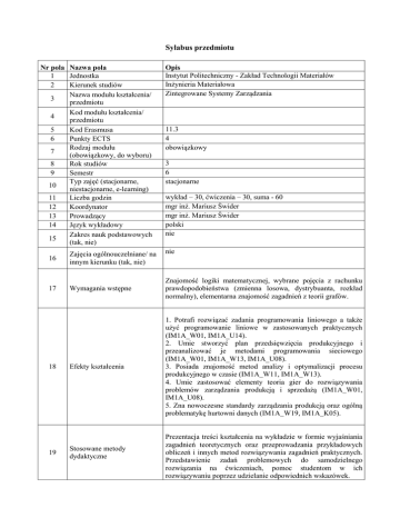 Sylabus przedmiotu Nr pola Nazwa pola 1 Jednostka 2 Kierunek studiów Nazwa modułu kształcenia/ 3 przedmiotu Kod modułu kształcenia/ 4 przedmiotu 5 Kod Erasmusa 6 Punkty ECTS Rodzaj modułu 7 (obowiązkowy, do wyboru) 8 Rok studiów 9 Semestr Typ zajęć (stacjonarne, 10 niestacjonarne, e-learning) 11 Liczba godzin 12 Koordynator 13 Prowadzący 14 Język wykładowy Zakres nauk podstawowych 15 (tak, nie) Opis Instytut Politechniczny - Zakład Technologii Materiałów Inżynieria Materiałowa Zintegrowane Systemy Zarządzania 11.3 4 obowiązkowy 3 6 stacjonarne wykład – 30, ćwiczenia – 30, suma - 60 mgr inż. Mariusz Świder mgr inż. Mariusz Świder polski nie nie 16 Zajęcia ogólnouczelniane/ na innym kierunku (tak, nie) 17 Wymagania wstępne Znajomość logiki matematycznej, wybrane pojęcia z rachunku prawdopodobieństwa (zmienna losowa, dystrybuanta, rozkład normalny), elementarna znajomość zagadnień z teorii grafów. Efekty kształcenia 1. Potrafi rozwiązać zadania programowania liniowego a także użyć programowanie liniowe w zastosowanych praktycznych (IM1A_W01, IM1A_U14). 2. Umie stworzyć plan przedsięwzięcia produkcyjnego i przeanalizować je metodami programowania sieciowego (IM1A_W01, IM1A_W13, IM1A_U08). 3. Posiada znajomość metod analizy i optymalizacji procesu produkcyjnego w czasie (IM1A_W11, IM1A_W13). 4. Umie zastosować elementy teoria gier do rozwiązywania problemów zarządzania produkcją i sprzedażą (IM1A_W01, IM1A_U08). 5. Zna nowoczesne standardy zarządzania produkcją oraz ogólną problematykę hurtowni danych (IM1A_W19, IM1A_K05). 18 19 Stosowane metody dydaktyczne Prezentacja treści kształcenia na wykładzie w formie wyjaśniania zagadnień teoretycznych oraz przeprowadzania przykładowych obliczeń i innych metod rozwiązywania zagadnień praktycznych. Przedstawienie zadań problemowych do samodzielnego rozwiązania na ćwiczeniach, pomoc studentom w ich rozwiązywaniu poprzez udzielanie odpowiednich wskazówek. 20 - zaliczenie na ocenę pozytywną dwóch kolokwiów Metody sprawdzania i kryteria - oceny cząstkowe uzyskiwane za rozwiązywanie zadań oceny efektów kształcenia ćwiczeniowych Obecność na zajęciach zgodnie z par. 13 Regulaminem Studiów PWSZ w Tarnowie 21 22 Forma i warunki zaliczenia Treści kształcenia (skrócony opis) Ocena końcowa z ćwiczeń to średnia arytmetyczne ocen z obu kolokwiów modyfikowana przez średnią arytmetyczną z ocen cząstkowych uzyskanych z zadań rozwiązywanych na zajęciach ćwiczeniowych. Wybrane zagadnienia programowania liniowego, programowanie sieciowe, elementy teorii gier, harmonogramowanie, optymalizacja procesu produkcyjnego w czasie, metody zarządzania produkcją, hurtownie danych i oprogramowanie zarządzające produkcją. - programowanie liniowe: metoda graficzna i transformacja do problemu dualnego, informacja o metodzie numerycznej simpleks, zagadnienia praktyczne: wybór optymalnego asortymentu produkcji i dobór procesów technologicznych - programowanie sieciowe: metody CPM i PERT, wyznaczanie ścieżek krytycznych i statystyczna weryfikacja zaplanowanego czasu realizacji przedsięwzięcia produkcyjnego, informacja o analizie czasowo-kosztowej 23 - rozwiązywanie gier dwuosobowych o sumie zero w zbiorze strategii czystych i mieszanych oraz gier z naturą kryteriami Treści kształcenia (pełny opis) Walda, Hurwicza, Bayesa i Savage’a - optymalizacja procesu produkcji w czasie: postać matematyczna problemu i tworzenie harmonogramów, równoległość i wielostrumieniowość przepływu, szeregowanie zadań, synchronizacja produkcji, układy czasowo-zwarte - współczesne metody i standardy stosowane w systemach wytwarzania: MRP, Just In Time, OPT - informacje dotyczące oprogramowania służącego zarządzania przedsiębiorstwem klasy MRP II i ERP, omówienie problematyki hurtowni danych 24 Literatura podstawowa i uzupełniająca - L. Kozioł, Z. Mazur, M. Dudek „Wybrane zagadnienia zarządzania operacjami w przedsiębiorstwie” - red. K. Kukuła „Badania operacyjne w przykładach i zadaniach” 25 26 27 28 Przyporządkowanie modułu kształcenia/przedmiotu do obszaru/ obszarów kształcenia Sposób określenia liczby punktów ECTS Liczba punktów ECTS – zajęcia wymagające bezpośredniego udziału nauczyciela akademickiego Liczba punktów ECTS – zajęcia o charakterze praktycznym 2 pkt ECTS: − Uczestnictwo w wykładach:30 h − Uczestnictwo w ćwiczeniach: 30 h (zajęcia praktyczne) − Konsultacje z wykładowcą: 5 h 2 pkt ECTS (praca własna): - Samodzielne przygotowanie do ćwiczeń 30h - Samodzielne przygotowanie do kolokwiów 20 h Łączny nakład pracy studenta: 115 h 2 (65 h) 2 (50 h)