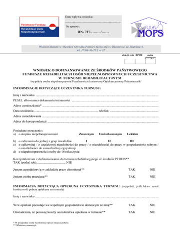 Data wpływu wniosku: .................................................................. Nr sprawy: RN- 717- …… /…… Wniosek złożony w Miejskim Ośrodku Pomocy Społecznej w Rzeszowie, ul. Skubisza 4, tel. 17/86-30-253, w 32. ubiegły rok ZPCH osoba pracująca WNIOSEK O DOFINANSOWANIE ZE ŚRODKÓW PAŃSTWOWEGO FUNDUSZU REHABILITACJI OSÓB NIEPEŁNOSPRAWNYCH UCZESTNICTWA W TURNUSIE REHABILITACYJNYM /wypełnia osoba niepełnosprawna/Przedstawiciel ustawowy/Opiekun prawny/Pełnomocnik/ INFORMNACJE DOTYCZĄCE UCZESTNIKA TURNUSU: Imię i nazwisko ................................................................................................................................................... PESEL albo numer dokumentu tożsamości ........................................................................................................ Adres zamieszkania* ........................................................................................................................................... Data urodzenia ............................................................................. telefon: .......................................................... Adres zameldowania ........................................................................................................................................... Adres do korespondencji ..................................................................................................................................... Posiadane orzeczenie: a) o stopniu niepełnosprawności Znacznym Umiarkowanym Lekkim b) o zaliczeniu do jednej z grup inwalidów I II III c) o całkowitej / o częściowej niezdolności do pracy / o niezdolności do pracy w gospodarstwie rolnym / o niezdolności do samodzielnej egzystencji d) o niepełnosprawności osoby do 16 roku życia Korzystałem/am z dofinansowania do turnusu rehabilitacyjnego ze środków PFRON** TAK (podać rok)................................... NIE Jestem zatrudniony/a w zakładzie pracy chronionej** TAK NIE Jestem osobą pracującą** TAK NIE INFORMACJA DOTYCZĄCA OPIEKUNA UCZESTNIKA TURNUSU: (wypełnić, jeśli lekarz uznał konieczność pobytu opiekuna na turnusie) Imię i nazwisko .................................................................................................................................................... W/w opiekun pozostaje we wspólnym gospodarstwie domowym ze mną** TAK NIE Oświadczam, że ponoszę koszty uczestnictwa opiekuna w turnusie** TAK NIE * W przypadku osoby bezdomnej wpisać miejsce pobytu. ** Właściwe zaznaczyć. Ja niżej podpisany(a) oświadczam, że razem ze mną we wspólnym gospodarstwie domowym pozostaje osób: 1 + /podać liczbę/. Oświadczam, że przeciętny miesięczny dochód w rozumieniu przepisów o świadczeniach rodzinnych podzielony przez liczbę osób we wspólnym gospodarstwie domowym, obliczony za kwartał poprzedzający miesiąc złożenia wniosku, wynosił ............................. zł. Uwaga: Zasiłki: pielęgnacyjny, rodzinny i wychowawczy, nie wlicza się do dochodu. Oświadczenia: Oświadczam, że nie będę pełnić funkcji członka kadry na niniejszym turnusie, jak i nie będę opiekunem innego uczestnika tego turnusu. W przypadku rezygnacji z dofinansowania zobowiązuję się niezwłocznie powiadomić w formie pisemnej o niniejszym fakcie Miejski Ośrodek Pomocy Społecznej w Rzeszowie. Zobowiązuję się do przedstawienia lekarzowi na turnusie rehabilitacyjnym aktualnego zaświadczenia o stanie zdrowia*** Oświadczam, że ojciec/matka dziecka nie jest pozbawiony/a władzy rodzicielskiej i wyraża zgodę na uczestnictwo dziecka w turnusie rehabilitacyjnym.**** Wyrażam zgodę na umieszczenie i przetwarzanie moich/ mojego dziecka danych osobowych w bazie MOPS Rzeszów dla potrzeb niezbędnych do przyznania dofinansowania w/w zadania zgodnie z ustawą z dnia 29 sierpnia 1997 r. o ochronie danych osobowych (Dz. U. z 2014 r., poz. 1182 j.t.) Świadomy odpowiedzialności karnej wynikającej z art. 233 § 1 i § 6 kk. w zw. z art. 75 § 2 i art. 83 § 3 kpa. za składanie fałszywych zeznań oświadczam, że dane zawarte w niniejszym wniosku zostały podane zgodnie z prawdą. Rzeszów, dnia………………………. .......................................................................... /czytelny podpis wnioskodawcy/Przedstawiciela ustawowego/Opiekuna Prawnego/Pełnomocnika/***** Załączniki do wniosku o dofinansowanie turnusu rehabilitacyjnego: 1) orzeczenie o stopniu niepełnosprawności, lub orzeczenie o całkowitej lub częściowej niezdolności do pracy lub inne orzeczenie równoważne, a w przypadku osób do lat 16 orzeczenie o niepełnosprawności (kopia, oryginał do wglądu), 2) dowód osobisty pełnoletniego uczestnika turnusu/opiekuna prawnego/przedstawiciela ustawowego/ pełnomocnika (do wglądu), 3) aktualny wniosek lekarza o skierowanie na turnus rehabilitacyjny (na druku stanowiącym załącznik do wniosku), 4) dowód osobisty opiekuna na turnusie (do wglądu). _______________________________________________________________________________________________ Wypełnia MOPS ...................................................................... ..................................................... /data wpływu do MOPS kompletnego wniosku/ /pieczęć MOPS i podpis pracownika/ *** Dot. turnusu rehabilitacyjnego, którego program przewiduje zabiegi fizjoterapeutyczne. **** Dotyczy osób małoletnich. ***** Niepotrzebne skreślić. /pieczęć zakładu opieki zdrowotnej lub gabinetu lekarskiego/ WNIOSEK LEKARZA O SKIEROWANIE NA TURNUS REHABILITACYJNY INFORMACJE DOTYCZĄCE UCZESTNIKA TURNUSU: Imię i nazwisko ...................................................................................................................................... PESEL albo dokument tożsamości ........................................................................................................ Adres zameldowania* ........................