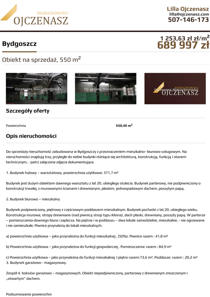 Lilla Ojczenasz [email protected] 507-146-173 1 253,63 zł zł/m2 689 997 zł Bydgoszcz Obiekt na sprzedaż, 550 m2 Szczegóły oferty Powierzchnia 550,40 m2 Opis nieruchomości Do sprzedaży nieruchomość zabudowana w Bydgoszczy z przeznaczeniem mieszkalno- biurowo-usługowym. Na nieruchomości znajdują trzy, przyległe do siebie budynki różniące się architekturą, konstrukcją, funkcją i stanem technicznym, - patrz załączone zdjęcia dokumentujące. 1. Budynek halowy – warsztatowy, powierzchnia użytkowa: 371,7 m² Budynek jest dużym obiektem dawnego warsztatu z lat 20. ubiegłego stulecia. Budynek parterowy, nie podpiwniczony o konstrukcji trwałej, z murowanymi ścianami i drewnianym, płaskim, jednospadowym dachem, poszytym papą. 2. Budynek biurowo – mieszkalny Budynek podpiwniczony, piętrowy z częściowym poddaszem mieszkalnym. Budynek pochodzi z lat 20. ubiegłego wieku. Konstrukcja murowa, stropy drewniane (nad piwnicą strop typu Kleina), dach płaski, drewniany, poszyty papą. W parterze – pomieszczenia dawnego biura i zaplecza. Na piętrze i w poddaszu – dwa lokale samodzielne, mieszkalne, - nie ogrzewane i nie zamieszkałe. Piwnice przynależą do lokali mieszkalnych. a) powierzchnia użytkowa – jako przynależna do funkcji mieszkalnej , (50%). Piwnice razem : 41,8 m² b) Powierzchnia użytkowa – jako przynależna do funkcji gospodarczej . Pomieszczenia: razem : 84,9 m² c) Powierzchnia użytkowa – jako przynależna do funkcji mieszkalnej. I piętro razem:73,6 m², Poddasze: razem : 20,2 m² 3. Budynek garażowo - magazynowy. Zespół 4. boksów garażowo – magazynowych. Obiekt niepodpiwniczony, parterowy z drewnianym zniszczonym i „otwartym” dachem. Podsumowanie powierzchni - powierzchnia mieszkalna razem : 93,8 m², - powierzchnia piwnic przynależnych do lokali mieszkalnych : 41,8 m² - powierzchnie gospodarcze : 371,7 (hala) + 84,9 (parter) : 456,6 m² - grunt działki : 873 m² Więcej na: http://www.ojczenasz.com/Oferty/Obiekty Nieruchomość Rodzaj obiektu zaklad_produkcyjny Stan prawny Własność