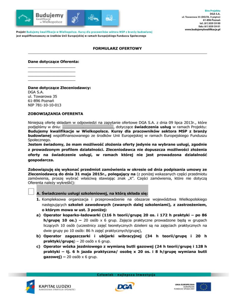 FORMULARZ OFERTOWY Dane dotyczące Oferenta: ______________________ ______________________ ______________________ ______________________ Dane dotyczące Zleceniodawcy: DGA S.A. ul. Towarowa 35 61-896 Poznań NIP 781-10-10-013 ZOBOWIĄZANIA OFERENTA Niniejszą ofertę składam w odpowiedzi na zapytanie ofertowe DGA S.A. z dnia 09 lipca 2013r., które podjęliśmy w dniu: ………………..……………………..., dotyczące świadczenia usług w ramach Projektu: Budujemy kwalifikacje w Wielkopolsce. Kursy dla pracowników sektora MSP z branży budowlanej współfinansowanego ze środków Unii Europejskiej w ramach Europejskiego Funduszu Społecznego. Jestem świadomy, że mam możliwość złożenia oferty jedynie na wybrane usługi, zgodnie z prowadzonym profilem działalności. Zleceniodawca nie dopuszcza możliwości złożenia oferty na świadczenie usługi, w ramach której nie jest prowadzona działalność gospodarcza. Zobowiązuję się wykonać przedmiot zamówienia w okresie od dnia podpisania umowy ze Zleceniodawcą do dnia 31 maja 2015r., polegający na (z poniżej wskazanych części przedmiotu zamówienia, proszę wybrać właściwą stawiając znak „X”. Części zamówienia, które nie dotyczą Oferenta należy wykreślić): A. Świadczeniu usługi szkoleniowej, na którą składa się: 1. Kompleksowa organizacja i przeprowadzenie na obszarze województwa Wielkopolskiego następujących szkoleń zawodowych (zwanych dalej szkoleniami), z zastrzeżeniem, o którym mowa w ust. 3 poniżej: a) Operator koparko-ładowarki (116 h teorii/grupę 20 os. i 172 h praktyki – po 86 h/grupę 10 os.) – 20 osób x 6 grup. Zajęcia praktyczne prowadzone będą w grupach liczących 10 osób (uczestnicy zajęć teoretycznych dzieleni są na zajęciach praktycznych na dwie grupy po 10 osób: 86 h zajęć praktycznych/grupę), b) Operator zagęszczarki i ubijarki wibracyjnej (34 h teorii/grupę i 20 h praktyki/grupę) – 20 osób x 6 grup. c) Operator wózka jezdniowego z wymianą butli gazowej (24 h teorii/grupę i 128 h praktyki – tj. 6 h jazda praktyczna/ osobę x 20 os. i 8 h/grupę wymiana butli gazowej) – 20 osób x 6 grup. Organizacja szkoleń, o których mowa powyżej przeprowadzona zostanie według następującego schematu: a) 3 grupy x 20 osób x 3 szkolenia (tj. ust. 1 powyżej, szkolenie a, b i c), b) 9 grup x 20 osób x 1 szkolenie, tj. ust. 1 powyżej: szkolenie a: 3 grupy x 20 os., szkolenie b: 3 grupy x 20 os., szkolenie c: 3 grupy x 20 os. 2. W ramach usługi szkoleniowej zobowiązuję się jednocześnie do: a) zapewnienia nowoczesnego zaplecza szkoleniowego (sale szkoleniowe z dostępem do Internetu, wyposażone w sprzęt audio video, rzutnik multimedialny) lub innych obiektów niezbędnych do realizacji szkolenia na obszarze Wielkopolski odpowiadających wymaganiom szkolenia (w tym zapewnienia na potrzeby szkolenia niezbędnych materiałów, m.in. mat. budowlanych, paliwa, niezbędnego nowoczesnego sprzętu odpowiadającego wymaganiom szkolenia, zapewnienie poligonu na zajęcia praktyczne itp.), b) zapewnienia 361 kompletów niezbędnych materiałów szkoleniowych (w tym opracowania merytoryczne obejmujące tematykę kursów, ew. podręczniki) dla uczestników kursów zawodowych, tj.: koparko-ładowarki – 120 kompletów materiałów, zagęszczarki i ubijarki – 120 kompletów materiałów, wózki jezdniowe z wymianą butli gazowej – 120 kompletów materiałów + 1 komplet do archiwum projektu, c) zapewnienia doświadczonych trenerów/instruktorów na każdy dzień szkolenia – odpowiedzialnych za przeprowadzenie zajęć szkoleniowych pod względem merytorycznym oraz praktycznym w sposób zapewniający jak najwyższy wskaźnik zdawalności egzaminu zewnętrznego przez uczestników szkoleń (z zastrzeżeniem, o którym mowa w ust. 7 poniżej), d) starannego prowadzenia w trakcie szkoleń dokumentacji szkoleniowej, na wzorach udostępnionych przez Zleceniodawcę oraz zgodnie z wytycznymi Zleceniodawcy. Ponadto zobowiązuję się do: współpracy ze Zleceniodawcą przy tworzeniu wzorów dokumentacji szkoleniowej (dzienniki zajęć, testy wiedzy etc.); przekazywania Zleceniodawcy oryginałów wszystkich poprawnie prowadzonych dokumentów wymaganych przez Zleceniodawcę związanych ze zrealizowanymi szkoleniami, w terminie najpóźniej 4 dni roboczych po zakończeniu szkolenia/cyklu szkoleniowego, e) wystawiania uczestnikom szkolenia zaświadczeń o ukończeniu szkolenia w ramach projektu, z zastrzeżeniem, o którym mowa w ust. 6 poniżej, f) informowania uczestników szkolenia o wsparciu otrzymanym z funduszy UE oraz obowiązku uczestnictwa w szkoleniu, w celu otrzymania zaświadczenia o ukończeniu szkoleń, g) motywowania i dyscyplinowania uczestników szkolenia, w szczególności do obecności na zajęciach, h) przekazywania Zleceniodawcy w formie e-mail, niezwłocznie informacji o każdym uczestniku, który opuszcza zajęcia lub posiada innego rodzaju zaległości. 3. Gwarantuję, iż szkolenia, realizowane będą zgodnie z programem zatwierdzonym przez: Instytut Mechanizacji Budownictwa i Górnictwa Skalnego (p. A, ust. 1 – szkolenia: a i b) i Urząd Dozoru Technicznego (p. A, ust. 1 – szkolenia: c). Oświadczam jednocześnie, że występują drobne różnice programowe w odniesieniu do założeń projektu przedstawionych w ust. 1 powyżej, wynikające z zatwierdzonych przez ww. instytucje programów szkoleń zawodowych w zakresie szkolenia: ……………………………………… ……………………………………………………………………………………………………………………………………… ……………………………..……………………………………………………………………………………………………… ……………………………………………………………………………………………………………………………………… ……