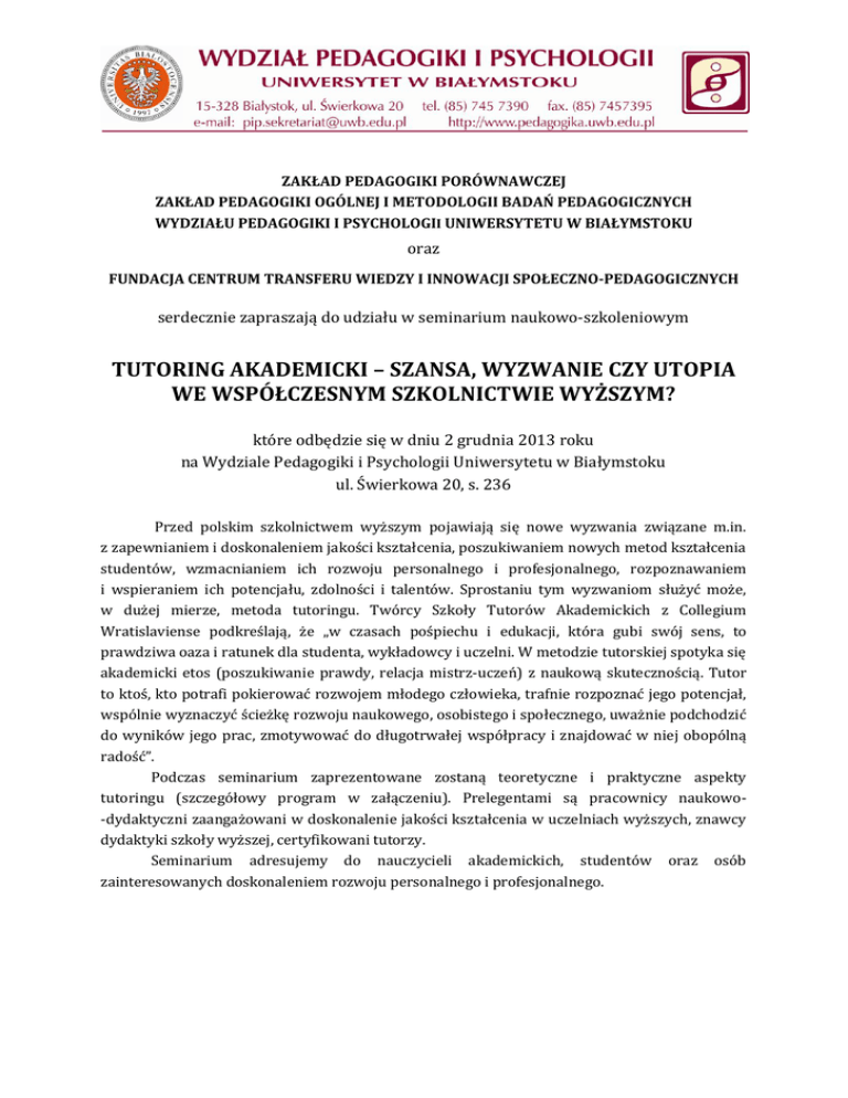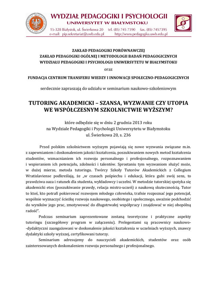 ZAKŁAD PEDAGOGIKI PORÓWNAWCZEJ ZAKŁAD PEDAGOGIKI OGÓLNEJ I METODOLOGII BADAŃ PEDAGOGICZNYCH WYDZIAŁU PEDAGOGIKI I PSYCHOLOGII UNIWERSYTETU W BIAŁYMSTOKU oraz FUNDACJA CENTRUM TRANSFERU WIEDZY I INNOWACJI SPOŁECZNO-PEDAGOGICZNYCH serdecznie zapraszają do udziału w seminarium naukowo-szkoleniowym TUTORING AKADEMICKI – SZANSA, WYZWANIE CZY UTOPIA WE WSPÓŁCZESNYM SZKOLNICTWIE WYŻSZYM? które odbędzie się w dniu 2 grudnia 2013 roku na Wydziale Pedagogiki i Psychologii Uniwersytetu w Białymstoku ul. Świerkowa 20, s. 236 Przed polskim szkolnictwem wyższym pojawiają się nowe wyzwania związane m.in. z zapewnianiem i doskonaleniem jakości kształcenia, poszukiwaniem nowych metod kształcenia studentów, wzmacnianiem ich rozwoju personalnego i profesjonalnego, rozpoznawaniem i wspieraniem ich potencjału, zdolności i talentów. Sprostaniu tym wyzwaniom służyć może, w dużej mierze, metoda tutoringu. Twórcy Szkoły Tutorów Akademickich z Collegium Wratislaviense podkreślają, że „w czasach pośpiechu i edukacji, która gubi swój sens, to prawdziwa oaza i ratunek dla studenta, wykładowcy i uczelni. W metodzie tutorskiej spotyka się akademicki etos (poszukiwanie prawdy, relacja mistrz-uczeń) z naukową skutecznością. Tutor to ktoś, kto potrafi pokierować rozwojem młodego człowieka, trafnie rozpoznać jego potencjał, wspólnie wyznaczyć ścieżkę rozwoju naukowego, osobistego i społecznego, uważnie podchodzić do wyników jego prac, zmotywować do długotrwałej współpracy i znajdować w niej obopólną radość”. Podczas seminarium zaprezentowane zostaną teoretyczne i praktyczne aspekty tutoringu (szczegółowy program w załączeniu). Prelegentami są pracownicy naukowo-dydaktyczni zaangażowani w doskonalenie jakości kształcenia w uczelniach wyższych, znawcy dydaktyki szkoły wyższej, certyfikowani tutorzy. Seminarium adresujemy do nauczycieli akademickich, studentów oraz osób zainteresowanych doskonaleniem rozwoju personalnego i profesjonalnego. Zgłoszenie i koszty uczestnictwa w seminarium Opłata za udział w seminarium wynosi 50 zł. Osoby zainteresowane prosimy o zgłaszanie udziału w seminarium drogą e-mailową do dnia 25 listopada 2013 roku. Zgłoszenia prosimy przesyłać na adres: [email protected] lub [email protected] Potwierdzeniem udziału w seminarium jest dokonanie wpłaty na konto Fundacji Centrum Transferu Wiedzy i Innowacji Społeczno-Pedagogicznych 59203000451110000002921750 z dopiskiem „Tutoring”. Uczestnicy otrzymają zaświadczenie o udziale w seminarium. PROGRAM SEMINARIUM 9.00–9.15 Powitanie uczestników seminarium dr hab. Mirosław Sobecki, prof. UwB, Dziekan Wydziału Pedagogiki i Psychologii UwB, dr hab. Wioleta Danilewicz, prof. UwB, Prodziekan ds. Nauki Wydziału Pedagogiki i Psychologii UwB CZĘŚĆ I. Co to jest tutoring akademicki? (wystąpienia zaproszonych gości) 9.15 – 10.30 dr Anna Kola (Wydział Nauk Pedagogicznych UMK w Toruniu), Historyczny, kulturowy i edukacyjny kontekst realizacji idei tutoringu akademickiego 10.30–11.00 dr hab. Agata Cudowska, prof. UwB (Wydział Pedagogiki i Psychologii UwB), Twórcze orientacje życiowe studentów 11.00–11.30 dr Anna Krajewska (Wydział Pedagogiki i Psychologii UwB), Współdziałanie dydaktyczne nauczycieli i studentów – szansa czy utopia we współczesnym tutoringu akademickim? 11.30–12.00 dr Katarzyna Bocheńska-Włostowska (Uczelnia Warszawska M. Skłodowskiej Curie), Komunikacja i dialog – spoiwo działań (w) tutoringu akademickim 12.00–12.30 dr Danuta Dobrowolska (WSP TWP im. J. Korczaka w Warszawie), Esej jako narzędzie pracy w tutoringu 12.30–13.00 Przerwa kawowa CZĘŚĆ II. Jak realizować tutoring akademicki? (warsztaty) 13.00–14.30 dr Bożena Tołwińska (Wydział Pedagogiki i Psychologii UwB), Budowanie relacji tutor – student 14.45–16.15 dr Marta Kowalczuk-Walędziak (Wydział Pedagogiki i Psychologii UwB). Spotkania tutorskie – plan, przebieg, dokumentacja CZĘŚĆ III. Tutoring akademicki – szansa, wyzwanie czy utopia we współczesnej przestrzeni edukacyjnej? 16.15–17.00 Dyskusja panelowa z udziałem uczestników. Zakończenie seminarium Zapraszamy