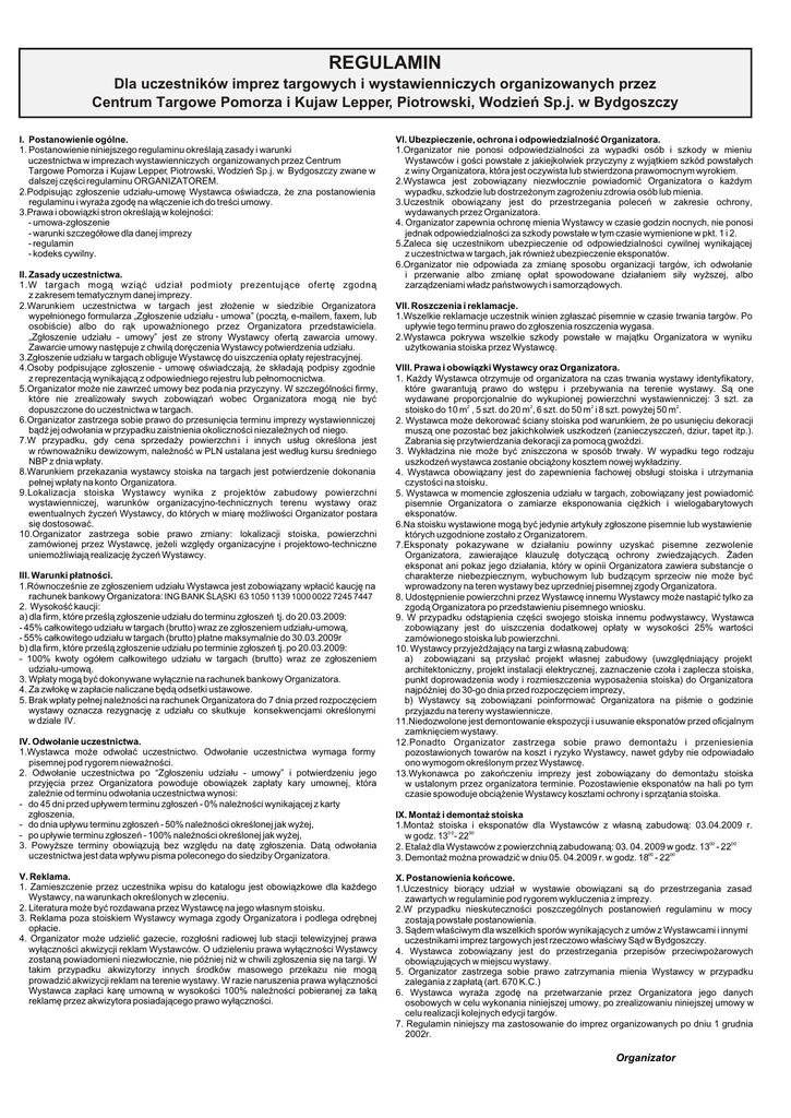 REGULAMIN Dla uczestników imprez targowych i wystawienniczych organizowanych przez Centrum Targowe Pomorza i Kujaw Lepper, Piotrowski, Wodzieñ Sp.j. w Bydgoszczy I. Postanowienie ogólne. 1. Postanowienie niniejszego regulaminu okreœlaj¹ zasady i warunki uczestnictwa w imprezach wystawienniczych organizowanych przez Centrum Targowe Pomorza i Kujaw Lepper, Piotrowski, Wodzieñ Sp.j. w Bydgoszczy zwane w dalszej czêœci regulaminu ORGANIZATOREM. 2.Podpisuj¹c zg³oszenie udzia³u-umowê Wystawca oœwiadcza, ¿e zna postanowienia regulaminu i wyra¿a zgodê na w³¹czenie ich do treœci umowy. 3.Prawa i obowi¹zki stron okreœlaj¹ w kolejnoœci: - umowa-zg³oszenie - warunki szczegó³owe dla danej imprezy - regulamin - kodeks cywilny. II. Zasady uczestnictwa. 1.W targach mog¹ wzi¹æ udzia³ podmioty prezentuj¹ce ofertê zgodn¹ z zakresem tematycznym danej imprezy. 2.Warunkiem uczestnictwa w targach jest z³o¿enie w siedzibie Organizatora wype³nionego formularza „Zg³oszenie udzia³u - umowa” (poczt¹, e-mailem, faxem, lub osobiœcie) albo do r¹k upowa¿nionego przez Organizatora przedstawiciela. „Zg³oszenie udzia³u - umowy” jest ze strony Wystawcy ofert¹ zawarcia umowy. Zawarcie umowy nastêpuje z chwil¹ dorêczenia Wystawcy potwierdzenia udzia³u. 3.Zg³oszenie udzia³u w targach obliguje Wystawcê do uiszczenia op³aty rejestracyjnej. 4.Osoby podpisuj¹ce zg³oszenie - umowê oœwiadczaj¹, ¿e sk³adaj¹ podpisy zgodnie z reprezentacj¹ wynikaj¹c¹ z odpowiedniego rejestru lub pe³nomocnictwa. 5.Organizator mo¿e nie zawrzeæ umowy bez poda nia przyczyny. W szczególnoœci firmy, które nie zrealizowa³y swych zobowi¹zañ wobec Organizatora mog¹ nie byæ dopuszczone do uczestnictwa w targach. 6.Organizator zastrzega sobie prawo do przesuniêcia terminu imprezy wystawienniczej b¹dŸ jej odwo³ania w przypadku zaistnienia okolicznoœci niezale¿nych od niego. 7.W przypadku, gdy cena sprzeda¿y powierzchn i i innych us³ug okreœlona jest w równowa¿niku dewizowym, nale¿noœæ w PLN ustalana jest wed³ug kursu œredniego NBP z dnia wp³aty. 8.Warunkiem przekazania wystawcy stoiska na targach jest potwierdzenie dokonania pe³nej wp³aty na konto Organizatora. 9.Lokalizacja stoiska Wystawcy wynika z projektów zabudowy powierzchni wystawienniczej, warunków organizacyjno-technicznych terenu wystawy oraz ewentualnych ¿yczeñ Wystawcy, do których w miarê mo¿liwoœci Organizator postara siê dostosowaæ. 10.Organizator zastrzega sobie prawo zmiany: lokalizacji stoiska, powierzchni zamówionej przez Wystawcê, je¿eli wzglêdy organizacyjne i projektowo-techniczne uniemo¿liwiaj¹ realizacjê ¿yczeñ Wystawcy. III. Warunki p³atnoœci. 1.Równoczeœnie ze zg³oszeniem udzia³u Wystawca jest zobowi¹zany wp³aciæ kaucjê na rachunek bankowy Organizatora: ING BANK ŒL¥SKI 63 1050 1139 1000 0022 7245 7447 2. Wysokoœæ kaucji: a) dla firm, które przeœl¹ zg³oszenie udzia³u do terminu zg³oszeñ tj. do 20.03.2009: - 45% ca³kowitego udzia³u w targach (brutto) wraz ze zg³oszeniem udzia³u-umow¹, - 55% ca³kowitego udzia³u w targach (brutto) p³atne maksymalnie do 30.03.2009r b) dla firm, które przeœl¹ zg³oszenie udzia³u po terminie zg³oszeñ tj. po 20.03.2009: - 100% kwoty ogó³em ca³kowitego udzia³u w targach (brutto) wraz ze zg³oszeniem udzia³u-umow¹. 3. Wp³aty mog¹ byæ dokonywane wy³¹cznie na rachunek bankowy Organizatora. 4. Za zw³okê w zap³acie naliczane bêd¹ odsetki ustawowe. 5. Brak wp³aty pe³nej nale¿noœci na rachunek Organizatora do 7 dnia przed rozpoczêciem wystawy oznacza rezygnacjê z udzia³u co skutkuje konsekwencjami okreœlonymi w dziale IV. IV. Odwo³anie uczestnictwa. 1.Wystawca mo¿e odwo³aæ uczestnictwo. Odwo³anie uczestnictwa wymaga formy pisemnej pod rygorem niewa¿noœci. 2. Odwo³anie uczestnictwa po “Zg³oszeniu udzia³u - umowy” i potwierdzeniu jego przyjêcia przez Organizatora powoduje obowi¹zek zap³aty kary umownej, która zale¿nie od terminu odwo³ania uczestnictwa wynosi: - do 45 dni przed up³ywem terminu zg³oszeñ - 0% nale¿noœci wynikaj¹cej z karty zg³oszenia, - do dnia up³ywu terminu zg³oszeñ - 50% nale¿noœci okreœlonej jak wy¿ej, - po up³ywie terminu zg³oszeñ - 100% nale¿noœci okreœlonej jak wy¿ej, 3. Powy¿sze terminy obowi¹zuj¹ bez wzglêdu na datê zg³oszenia. Dat¹ odwo³ania uczestnictwa jest data wp³ywu pisma poleconego do siedziby Organizatora. V. Reklama. 1. Zamieszczenie przez uczestnika wpisu do katalogu jest obowi¹zkowe dla ka¿dego Wystawcy, na warunkach okreœlonych w zleceniu. 2. Literatura mo¿e byæ rozdawana przez Wystawcê na jego w³asnym stoisku. 3. Reklama poza stoiskiem Wystawcy wymaga zgody Organizatora i podlega odrêbnej op³acie. 4. Organizator mo¿e udzieliæ gazecie, rozg³oœni radiowej lub stacji telewizyjnej prawa wy³¹cznoœci akwizycji reklam Wystawców. O udzieleniu prawa wy³¹cznoœci Wystawcy zostan¹ powiadomieni niezw³ocznie, nie póŸniej ni¿ w chwili zg³oszenia siê na targi. W takim przypadku akwizytorzy innych œrodków masowego przekazu nie mog¹ prowadziæ akwizycji reklam na terenie wystawy. W razie naruszenia prawa wy³¹cznoœci Wystawca zap³aci karê umown¹ w wysokoœci 100% nale¿noœci pobieranej za tak¹ reklamê przez akwizytora posiadaj¹cego prawo wy³¹cznoœci. VI. Ubezpieczenie, ochrona i odpowiedzialnoœæ Organizatora. 1.Organizator nie ponosi odpowiedzialnoœci za wypadki osób i szkody w mieniu Wystawców i goœci powsta³e z jakiejkolwiek przyczyny z wyj¹tkiem szkód powsta³ych z winy Organizatora, która jest oczywista lub stwierdzona prawomocnym wyrokiem. 2.Wystawca jest zobowi¹zany niezw³ocznie powiadomiæ Organizatora o ka¿dym wypadku, szkodzie lub dostrze¿onym zagro¿eniu zdrowia osób lub mienia. 3.Uczestnik obowi¹zany jest do przestrzegania poleceñ w zakresie ochrony, wydawanych przez Organizatora. 4. Organizator zapewnia ochronê mienia Wystawcy w czasie godzin nocnych, nie po