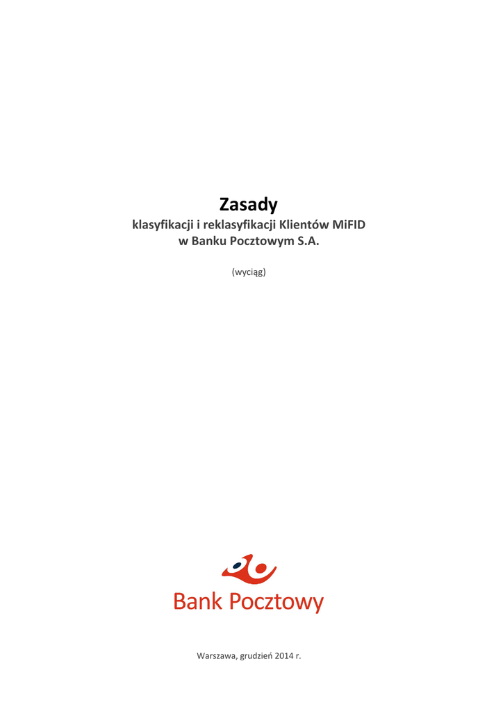 Zasady klasyfikacji i reklasyfikacji Klientów MiFID w Banku Pocztowym S.A. (wyci¹g) Warszawa, grudzieñ 2014 r. §1 1. Klasyfikacja Klientów Banku, dokonana zgodnie z wymogami MiFID, ma na celu zapewnienie Klientom ochrony inwestycyjnej, odpowiednio do kategorii do której Klient zostaù zaklasyfikowany. 2. W wyniku klasyfikacji Klientów Banku, zostaj¹ oni przypisani do nastêpuj¹cych kategorii: 1) klienci detaliczni, 2) klienci profesjonalni, 3) uprawnieni kontrahenci. §2 1. Klient detaliczny to Klient, który nie zostaù zakwalifikowany do kategorii Klient profesjonalny ani uprawniony kontrahent. 2. Klientem profesjonalnym jest Klient posiadaj¹cy doœwiadczenie i wiedzê pozwalaj¹ce na podejmowanie wùaœciwych decyzji inwestycyjnych, jak równie¿ na wùaœciw¹ ocenê ryzyka zwi¹zanego z tymi decyzjami. 3. Klientem profesjonalnym s¹ w szczególnoœci: 1) banki, 2) firmy inwestycyjne, 3) zakùady ubezpieczeñ, 4) fundusze inwestycyjne lub towarzystwa funduszy inwestycyjnych, w rozumieniu ustawy z dnia 27 maja 2004 r. o funduszach inwestycyjnych (Dz. U. Nr 146, poz. 1546 z póên. zm.) 5) fundusze emerytalne lub towarzystwa emerytalne w rozumieniu ustawy z dnia 28 sierpnia 1997 r. o organizacji i funkcjonowaniu funduszy emerytalnych (Dz. U. Nr 159, poz. 1667, z póên. zm.), 6) towarowe domy maklerskie, 7) podmioty zawieraj¹ce, w ramach prowadzonej dziaùalnoœci gospodarczej, na wùasny rachunek transakcje na rynkach kontraktów terminowych, opcji lub innych instrumentów pochodnych albo na rynkach pieniê¿nych wyù¹cznie w celu zabezpieczenia pozycji zajêtych na tych rynkach, lub dziaùaj¹cych w tym celu na rachunek innych czùonków takich rynków, o ile odpowiedzialnoœã za wykonanie zobowi¹zañ wynikaj¹cych z tych transakcji ponosz¹ uczestnicy rozliczaj¹cy tych rynków, 8) inne instytucje finansowe ni¿ wskazane w pkt 1)-7), 9) inwestorzy instytucjonalni niebêd¹cy instytucjami finansowymi okreœlonymi w pkt 1)-8), prowadz¹cy regulowan¹ dziaùalnoœã na rynku finansowym, 10) podmioty prowadz¹ce poza granicami Rzeczypospolitej Polskiej dziaùalnoœã równowa¿n¹ do dziaùalnoœci prowadzonej przez podmioty wskazane w pkt 1) – 9), 11) przedsiêbiorcy, którzy speùniaj¹ co najmniej dwa z poni¿szych wymogów, przy czym równowartoœã kwot, wskazanych w euro oblicza siê przy zastosowaniu œredniego kursu euro ustalanego przez Narodowy Bank Polski na dzieñ sporz¹dzenia przez danego przedsiêbiorcê sprawozdania finansowego: a) suma bilansowa tego przedsiêbiorcy wynosi co najmniej 20 000 000 euro, b) osi¹gniêta przez przedsiêbiorcê wartoœã przychodów ze sprzeda¿y wynosi co najmniej 40 000 000 euro, c) kapitaù wùasny lub fundusz wùasny przedsiêbiorcy wynosi co najmniej 2 000 000 euro. 12) jednostki administracji rz¹dowej lub samorz¹dowej, organy publiczne, które zarz¹dzaj¹ dùugiem publicznym, banki centralne, Bank Úwiatowy, Miêdzynarodowy Fundusz Walutowy, Europejski Bank Centralny, Europejski Banki Inwestycyjny lub inne organizacje miêdzynarodowe peùni¹ce podobne funkcje, 13) inni inwestorzy instytucjonalni, których gùównym przedmiotem dziaùalnoœci jest inwestowanie w instrumenty finansowe, w tym podmioty zajmuj¹ce siê sekurytyzacj¹ aktywów lub zawieraniem innego rodzaju transakcji finansowych – fundusze sekurytyzacyjne, 14) podmioty inne ni¿ wskazane w pkt 1)-13), które na swój wniosek zostaùy przez Bank uznane za Klienta profesjonalnego. 3. Uprawniony kontrahent to Klient profesjonalny, z którym Bank zawiera transakcje lub poœredniczy w ich zawieraniu w ramach: 1) usùugi wykonywania zleceñ, 2) usùugi przyjmowania i przekazywania zleceñ, 3) transakcji nabywania lub zbywania instrumentów finansowych na wùasny rachunek. §3 Na pisemny wniosek Klienta, Bank mo¿e dokonaã zmiany kategorii Klienta na ni¿sz¹ lub wy¿sz¹ w odniesieniu do wszystkich oferowanych usùug inwestycyjnych œwiadczonych przez Bank na rzecz Klienta, jak i do ka¿dej z osobna. §4 1. Jeœli Klient detaliczny bêd¹cy osob¹ fizyczn¹ posiada wiedzê i doœwiadczenie pozwalaj¹ce na podejmowanie wùaœciwych decyzji inwestycyjnych, jak równie¿ na wùaœciw¹ ocenê ryzyka zwi¹zanego z tymi decyzjami mo¿e on zostaã uznany na jego pisemny wniosek za Klienta profesjonalnego. Przed uwzglêdnieniem ¿¹dania Klienta Bank ma obowi¹zek ustaliã wiedzê Klienta o zasadach traktowania Klientów profesjonalnych przy œwiadczeniu usùug inwestycyjnych. 2. Reklasyfikacja Klienta detalicznego, o którym mowa w ust. 1, jest dopuszczalna jeœli Klient wraz z wnioskiem przedstawi dokumenty zaœwiadczaj¹ce, ¿e speùnia przynajmniej dwa z nastêpuj¹cych wymogów: 1) zawieraù transakcje o wartoœci stanowi¹cej, co najmniej równowartoœã w zùotych 50 000 euro ka¿da, na odpowiednim rynku, ze œredni¹ czêstotliwoœci¹, co najmniej 10 transakcji na kwartaù w ci¹gu czterech ostatnich kwartaùów, uwzglêdniaj¹c transakcje zawierane za poœrednictwem Banku, 2) wartoœã portfela instrumentów finansowych tego podmiotu ù¹cznie ze œrodkami pieniê¿nymi wchodz¹cymi w jego skùad wynosi co najmniej równowartoœã w zùotych 500 000 euro, 3) pracuje lub pracowaù w sektorze finansowym, przez co najmniej rok na stanowisku, które wymaga wiedzy zawodowej dotycz¹cej transakcji w zakresie instrumentów finansowych lub usùug maklerskich, które miaùyby byã œwiadczone przez firmê inwestycyjn¹ na jego rzecz na podstawie zawieranej umowy. 3. Równowartoœã kwot w euro, o których mowa w ust. 2, ustala siê przy zastosowaniu œredniego kursu euro ogùaszanego przez Narodowy Bank Polski, obowi¹zuj¹cego w dniu poprzedzaj¹cym datê zùo¿enia wniosku o zmianê kategorii Klienta z Klienta detalicznego na profesjonalnego §5 1. Jeœli osoby fizyczne reprezentuj¹ce Klienta detalicznego bêd¹cego osob¹ prawn¹ lub jednostk¹ organizacyjn¹ nieposiadaj¹c¹ osobowoœci prawnej posiadaj¹ wiedzê i doœwiadczenie pozwalaj¹ce na podejmowanie