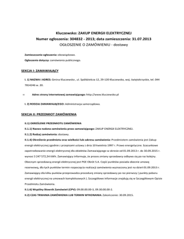 Kluczewsko: ZAKUP ENERGII ELEKTRYCZNEJ Numer ogłoszenia: 304832 - 2013; data zamieszczenia: 31.07.2013 OGŁOSZENIE O ZAMÓWIENIU - dostawy Zamieszczanie ogłoszenia: obowiązkowe. Ogłoszenie dotyczy: zamówienia publicznego. SEKCJA I: ZAMAWIAJĄCY I. 1) NAZWA I ADRES: Gmina Kluczewsko , ul. Spółdzielcza 12, 29-120 Kluczewsko, woj. świętokrzyskie, tel. 044 7814246 w. 20. • Adres strony internetowej zamawiającego: http://www.kluczewsko.pl I. 2) RODZAJ ZAMAWIAJĄCEGO: Administracja samorządowa. SEKCJA II: PRZEDMIOT ZAMÓWIENIA II.1) OKREŚLENIE PRZEDMIOTU ZAMÓWIENIA II.1.1) Nazwa nadana zamówieniu przez zamawiającego: ZAKUP ENERGII ELEKTRYCZNEJ. II.1.2) Rodzaj zamówienia: dostawy. II.1.4) Określenie przedmiotu oraz wielkości lub zakresu zamówienia: Przedmiotem zamówienia jest Zakup energii elektrycznej zgodnie z przepisami ustawy z dnia 10 kwietnia 1997 r. Prawo energetyczne. Szacunkowe zapotrzebowanie energii elektrycznej dla obiektów Zamawiającego w okresie od 01.09.2013 r. do 30.09.2015 r. wynosi 3 247 572,54 kWh. Zamawiający informuje, że proces zmiany sprzedawcy odbywa się po raz kolejny. Obecnym sprzedawcą energii elektrycznej jest PGE Obrót S.A. Część punktów posiada obecnie umowę rezerwową, dla tych punktów termin rozpoczęcia realizacji zamówienia wyznaczony jest na dzień 01.09.2013 r. Zamawiający dla kilku punków przeprowadza procedurę zmiany sprzedawcy po raz pierwszy ( punkty poboru energii elektrycznej na umowach kompleksowych ). Szczegółowe informacje znajdują się w Szczegółowym Opisie Przedmiotu Zamówienia. II.1.6) Wspólny Słownik Zamówień (CPV): 09.00.00.00-3, 09.30.00.00-2. II.2) CZAS TRWANIA ZAMÓWIENIA LUB TERMIN WYKONANIA: Zakończenie: 30.09.2015. SEKCJA III: INFORMACJE O CHARAKTERZE PRAWNYM, EKONOMICZNYM, FINANSOWYM I TECHNICZNYM III.1) WADIUM Informacja na temat wadium: Nie dotyczy III.2) ZALICZKI III.3) WARUNKI UDZIAŁU W POSTĘPOWANIU ORAZ OPIS SPOSOBU DOKONYWANIA OCENY SPEŁNIANIA TYCH WARUNKÓW • III. 3.1) Uprawnienia do wykonywania określonej działalności lub czynności, jeżeli przepisy prawa nakładają obowiązek ich posiadania Opis sposobu dokonywania oceny spełniania tego warunku o Pełnomocnik Zamawiającego uzna warunek za spełniony jeżeli Wykonawca wykaże, że posiada: aktualnie obowiązującą koncesję na prowadzenie działalności gospodarczej w zakresie obrotu energią elektryczną, wydaną przez Prezesa Urzędu Regulacji Energetyki; • III.3.2) Wiedza i doświadczenie Opis sposobu dokonywania oceny spełniania tego warunku o Warunek ten spełnią Wykonawcy którzy wykażą, że wykonali a w przypadku świadczeń okresowych lub ciągłych również wykonywanych głównych dostaw w okresie ostatnich 3 lat przed upływem terminu składania wniosków o dopuszczenie do udziału w postępowaniu - w tym okresie minimum dwóch wykonanych lub wykonywanych dostaw energii elektrycznej o wolumenie nie mniejszym niż 1 600 000 kWh każda, wraz z podaniem ich wartości, przedmiotu, dat wykonania i podmiotów, na rzecz których dostawy zostały wykonane, oraz z załączeniem dowodów, czy zostały wykonane lub są wykonywane należycie. • III.3.3) Potencjał techniczny Opis sposobu dokonywania oceny spełniania tego warunku o Pełnomocnik Zamawiającego nie precyzuje w tym zakresie żadnych wymagań, których spełniania Wykonawca zobowiązany jest wykazać w sposób szczególny. Warunek ten zostanie spełniony, jeżeli wykonawca złoży oświadczenie, że posiada odpowiedni potencjał techniczny niezbędny do wykonywania niniejszego zamówienia; Ocena spełniania warunku na podstawie złożonego oświadczenia z art. 22 ust. 1 ustawy Pzp. • III.3.4) Osoby zdolne do wykonania zamówienia Opis sposobu dokonywania oceny spełniania tego warunku o Pełnomocnik Zamawiającego nie precyzuje w tym zakresie żadnych wymagań, których spełniania Wykonawca zobowiązany jest wykazać w sposób szczególny. Warunek ten zostanie spełniony, jeżeli wykonawca złoży oświadczenie, że posiada osoby zdolne do wykonywania niniejszego zamówienia; Ocena spełniania warunku na podstawie złożonego oświadczenia z art. 22 ust. 1 ustawy Pzp. • III.3.5) Sytuacja ekonomiczna i finansowa Opis sposobu dokonywania oceny spełniania tego warunku o Pełnomocnik Zamawiającego nie precyzuje w tym zakresie żadnych wymagań, których spełniania Wykonawca zobowiązany jest wykazać w sposób szczególny. Warunek ten zostanie spełniony, jeżeli wykonawca złoży oświadczenie, że posiada sytuację ekonomiczną i finansową niezbędną do wykonywania niniejszego zamówienia. Ocena spełniania warunku na podstawie złożonego oświadczenia z art. 22 ust. 1 ustawy Pzp. III.4) INFORMACJA O OŚWIADCZENIACH LUB DOKUMENTACH, JAKIE MAJĄ DOSTARCZYĆ WYKONAWCY W CELU POTWIERDZENIA SPEŁNIANIA WARUNKÓW UDZIAŁU W POSTĘPOWANIU ORAZ NIEPODLEGANIA WYKLUCZENIU NA PODSTAWIE ART. 24 UST. 1 USTAWY III.4.1) W zakresie wykazania spełniania przez wykonawcę warunków, o których mowa w art. 22 ust. 1 ustawy, oprócz oświadczenia o spełnianiu warunków udziału w postępowaniu należy przedłożyć: • potwierdzenie posiadania uprawnień do wykonywania określonej działalności lub czynności, jeżeli przepisy prawa nakładają obowiązek ich posiadania, w szczególności koncesje, zezwolenia lub licencje; • wykaz wykonanych, a w przypadku świadczeń okresowych lub ciągłych również wykonywanych, głównych dostaw lub usług, w okresie ostatnich trzech lat przed upływem terminu składania ofert albo wniosków o dopuszczenie do udziału w postępowaniu, a jeżeli okres prowadzenia działalności jest krótszy - w tym okresie, wraz z podaniem ich wartości, przedmiotu, dat wykonania i podmiotów, na rzecz których dostawy lub usługi zostały wykonane, oraz załączeniem dowodów, czy zostały wykonane lub są wykonywane należycie; • określenie dostaw lub usług, których dotyczy obowiązek wskazania przez wykonawcę w wykazie lub