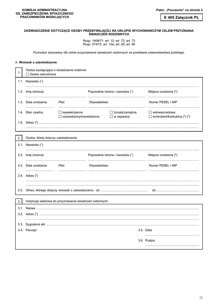 Patrz: „Pouczenie” na stronie 2 KOMISJA ADMINISTRACYJNA DS. ZABEZPIECZENIA SPOŁECZNEGO PRACOWNIKÓW MIGRUJĄCYCH E 405 Załącznik PL ZAŚWIADCZENIE DOTYCZĄCE OSOBY PRZEBYWAJĄCEJ NA URLOPIE WYCHOWAWCZYM CELEM PRZYZNANIA ŚWIADCZEŃ RODZINNYCH Rozp. 1408/71: art. 12; art. 72; art. 73 Rozp. 574/72: art. 10a; art. 85; art. 86 Formularz stosowany dla celów przyznawania świadczeń rodzinnych na podstawie ustawodawstwa polskiego. A. Wniosek o zaświadczenie 1. Osoba występująca o świadczenie rodzinne n Osoba zatrudniona 1.1. Nazwisko (1) .................................................................................................................................................................................................................................... Poprzednie imiona i nazwiska (1) 1.2. Imię (imiona) Miejsce urodzenia (2) ............................................................................... ............................................................................ ................................................................... 1.3. Data urodzenia ..................................... 1.4. Stan cywilny Płeć Obywatelstwo Numer PESEL i NIP ..................................... ........................................................................... ................................................................... n kawaler/panna n rozwiedziony/rozwiedziona n żonaty/zamężna n w separacji n wdowiec/wdowa n konkubent/konkubina (3) (4) 1.5. Adres (5) ................................................................................................................................................................................................................... .................................................................................................................................................................................................................................... 2. Osoba, której dotyczy zaświadczenie 2.1. Nazwisko (1) .................................................................................................................................................................................................................................... Poprzednie imiona i nazwiska (1) 2.2. Imię (imiona) Miejsce urodzenia (2) ............................................................................... ............................................................................ ................................................................... 2.3. Data urodzenia ..................................... Płeć Obywatelstwo Numer PESEL i NIP ..................................... ........................................................................... .................................................................. 2.4. Adres (5) .................................................................................................................................................................................................................................... .................................................................................................................................................................................................................................... 2.5. Okres, którego dotyczy wniosek o zaświadczeniu od .............................................................. 3. do ........................................................ Instytucja właściwa do przyznawania świadczeń rodzinnych 3.1. Nazwa ...................................................................................................................................................................................................................... 3.2. Adres (5) .................................................................................................................................................................................................................. .................................................................................................................................................................................................................................... 3.3. Sygnatura akt ......................................................................................................................................................................................................... 3.4. Pieczęć 3.5. Data ....................................................................... 3.6. Podpis ....................................................................... 1 E 405 Załącznik PL B. Zaświadczenie Wypełnia instytucja właściwa do przyznawania świadczeń rodzinnych, w której dana osoba była poprzednio zarejestrowana. 4. Zaświadcza się, że osoba wymieniona w punkcie 2 4.1. Była pracownikiem najemnym w okresie od .................................................................... do ................................................................... (6) w .......................................................................................................................................................................................................................... (7) 5. Osoba wymieniona w punkcie 2 5.1. Jest obecnie zatrudniona lub wykonuje inną pracę zarobkową 8 5.2. Korzysta obecnie z zasiłku wychowawczego ( ) 6. n Tak n Nie n Tak n Nie Instytucja, w której osoba wymieniona w punkcie 2 była ostatnio zarejestrowana jako osoba zatrudniona 6.1. Nazwa ...................................................................................................................................................................................................................... 6.2. Adres (5) .................................................................................................................................................................................................................. .........