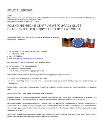 POLICJA LUBUSKA Źródło: http://lubuska.policja.gov.pl/go/materialy-statyczne/polsko-niemieckie-centr/3592,Polsko-Niemieckie-Centrum-Wspolpracy-Sl uzb-Granicznych-Policyjnych-i-Celnych-w-S.html Wygenerowano: Środa, 8 marca 2017, 23:54 POLSKO-NIEMIECKIE CENTRUM WSPÓŁPRACY SŁUŻB GRANICZNYCH, POLICYJNYCH I CELNYCH W ŚWIECKU Stanowisko Dyżurnego Policji w Centrum Współpracy w Świecku obsługiwane całodobowo: ● Tel. (95) 7381926 Tel. MSWiA 79 24801 oraz 79 24803 ● Fax. MSWiA 79 24805 ● Fax. (95) 7381928 ● Adres mailowy: [email protected] Osoba upoważniona do kontaktów - st. asp. Sylwester Ksiuk ● Tel. (95) 7381927 Tel. MSWiA 79 24802 ● tel. (niemiecki): 0335 5566 447 ● Adres mailowy: [email protected] W Polsko-Niemieckim Centrum Współpracy w Świecku służbę pełnią następujące służby: ● Ze strony polskiej: Policja, Straż Graniczna, Izba Celna. ● Ze strony niemieckiej: Policja Federalna, Policje Landowe: Brandenburgii, Saksonii, Mecklenburgii- Pomorza Przedniego oraz Urząd Celny. Policję polską reprezentują funkcjonariusze Wydziału Wywiadu Kryminalnego, Komendy Wojewódzkiej Policji w Gorzowie Wlkp. Centrum Współpracy pełni służbę całodobowo, 7 dni w tygodniu. Podstawą prawną funkcjonowania Polsko-Niemieckiego Centrum Współpracy jest umowa między Rządem RP a Rządem RFN o współpracy Policji i Straży Granicznych na terenach przygranicznych podpisana w Berlinie 26.02.2002 roku Centrum Współpracy obsługuje jednostki Policji polskiej (KWP, KPP, KP) mające swoją siedzibę na terenach przygranicznych w rozumieniu w/w umowy międzyrządowej tj. (woj. zachodniopomorskie; lubuskie; dolnośląskie) oraz jednostki Policji niemieckiej mające swoją siedzibę na terenie przygranicznych landów: (Mecklenburgia-Pomorze Przednie; Brandenburgia, Saksonia oraz Berlin). W sprawach bardzo pilnych związanych z zagrożeniem życia i zdrowia obsługiwane są również jednostki Policji polskiej z całego kraju oraz jednostki Policji niemieckiej z całego obszaru Niemiec. Ocena: 0/5 (0) Tweetnij