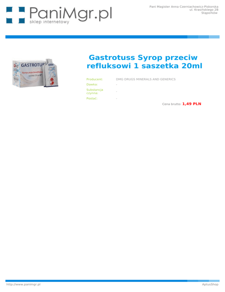 Pani Magister Anna Czerniachowicz-Piskorska ul. Krasińskiego 2B Stąporków Gastrotuss Syrop przeciw refluksowi 1 saszetka 20ml Producent: DMG DRUGS MINERALS AND GENERICS Dawka: - Substancja czynna: - Postać: Cena brutto: http://www.panimgr.pl 1,49 PLN AptusShop