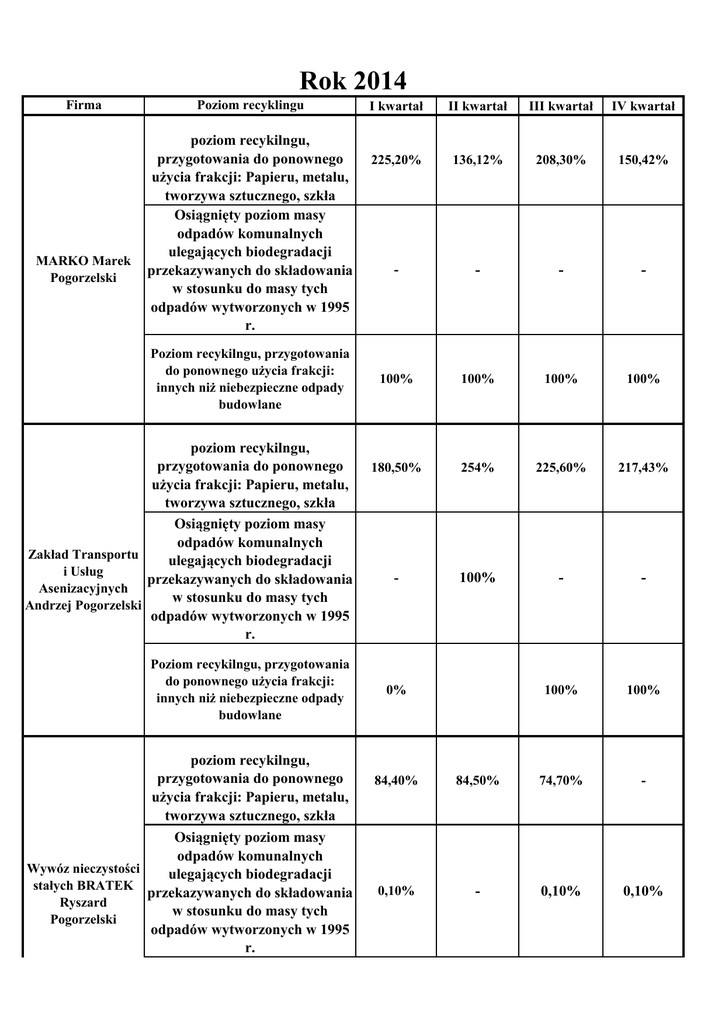 Rok 2014 Firma MARKO Marek Pogorzelski Poziom recyklingu poziom recykilngu, przygotowania do ponownego użycia frakcji: Papieru, metalu, tworzywa sztucznego, szkła Osiągnięty poziom masy odpadów komunalnych ulegających biodegradacji przekazywanych do składowania w stosunku do masy tych odpadów wytworzonych w 1995 r. Poziom recykilngu, przygotowania do ponownego użycia frakcji: innych niż niebezpieczne odpady budowlane poziom recykilngu, przygotowania do ponownego użycia frakcji: Papieru, metalu, tworzywa sztucznego, szkła Osiągnięty poziom masy odpadów komunalnych Zakład Transportu ulegających biodegradacji i Usług przekazywanych do składowania Asenizacyjnych w stosunku do masy tych Andrzej Pogorzelski odpadów wytworzonych w 1995 r. Poziom recykilngu, przygotowania do ponownego użycia frakcji: innych niż niebezpieczne odpady budowlane poziom recykilngu, przygotowania do ponownego użycia frakcji: Papieru, metalu, tworzywa sztucznego, szkła Osiągnięty poziom masy odpadów komunalnych Wywóz nieczystości ulegających biodegradacji stałych BRATEK przekazywanych do składowania Ryszard w stosunku do masy tych Pogorzelski odpadów wytworzonych w 1995 r. I kwartał II kwartał III kwartał IV kwartał 225,20% 136,12% 208,30% 150,42% - - - - 100% 100% 100% 100% 180,50% 254% 225,60% 217,43% - 100% - - 100% 100% 0% 84,40% 84,50% 74,70% - 0,10% - 0,10% 0,10% Ryszard Pogorzelski Poziom recykilngu, przygotowania do ponownego użycia frakcji: innych niż niebezpieczne odpady budowlane EKO_KWIAT - - - - 33,24% 106,79% 42,94% 35,24% - - - - - - - 100% 61,19% 45,13% 40,11% 90,25% Osiągnięty poziom masy odpadów komunalnych ulegających biodegradacji przekazywanych do składowania w stosunku do masy tych odpadów wytworzonych w 1995 r. - - 0,02% 0,01% Poziom recykilngu, przygotowania do ponownego użycia frakcji: innych niż niebezpieczne odpady budowlane - - - - 100% brak działalności 100% - brak działalności - poziom recykilngu, przygotowania do ponownego użycia frakcji: Papieru, metalu, tworzywa sztucznego, szkła Osiągnięty poziom masy odpadów komunalnych ulegających biodegradacji przekazywanych do składowania w stosunku do masy tych odpadów wytworzonych w 1995 Poziom recykilngu, przygotowania do ponownego użycia frakcji: innych niż niebezpieczne odpady budowlane poziom recykilngu, przygotowania do ponownego użycia frakcji: Papieru, metalu, tworzywa sztucznego, szkła MUK poziom recykilngu, brak przygotowania do ponownego działalności użycia frakcji: Papieru, metalu, tworzywa sztucznego, szkła Zakład Oczyszczania miasta Osiągnięty poziom masy brak działalności odpadów komunalnych ulegających biodegradacji przekazywanych do składowania Zakład Oczyszczania miasta Osiągnięty poziom masy brak działalności odpadów komunalnych ulegających biodegradacji przekazywanych do składowania w stosunku do masy tych odpadów wytworzonych w 1995 r. Poziom recykilngu, przygotowania do ponownego użycia frakcji: brak innych niż niebezpieczne odpady działalności budowlane Order poziom recykilngu, brak przygotowania do ponownego działalności użycia frakcji: Papieru, metalu, tworzywa sztucznego, szkła Osiągnięty poziom masy odpadów komunalnych ulegających biodegradacji brak przekazywanych do składowania działalności w stosunku do masy tych odpadów wytworzonych w 1995 r. Poziom recykilngu, przygotowania do ponownego użycia frakcji: brak innych niż niebezpieczne odpady działalności budowlane A.S.A Almax Fart Bis Veolia Biomed Ekom Remondis Sita Santa Eko brak działalności brak działalności brak działalności brak działalności brak działalności brak działalności brak działalności brak działalności brak działalności - brak działalności - - brak działalności - - brak działalności - - brak działalności - - brak działalności -