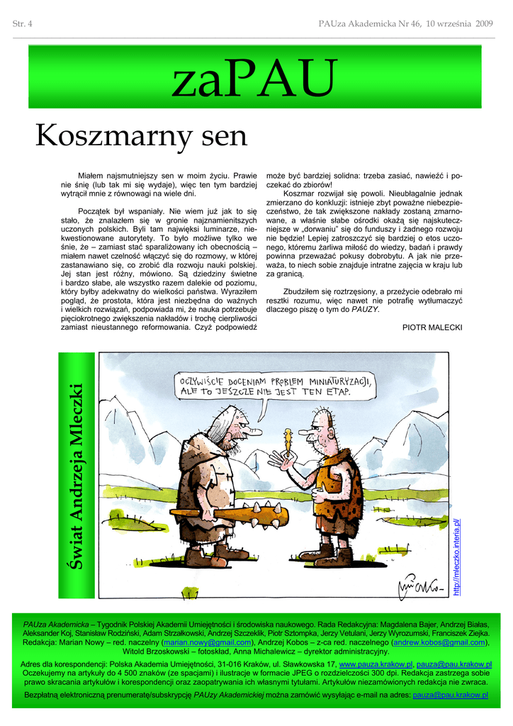 Str. 4 PAUza Akademicka Nr 46, 10 września 2009 ________________________________________________________________________________________________________________ zaPAU Koszmarny sen Świat Andrzeja Mleczki Początek był wspaniały. Nie wiem już jak to się stało, że znalazłem się w gronie najznamienitszych uczonych polskich. Byli tam najwięksi luminarze, niekwestionowane autorytety. To było możliwe tylko we śnie, że – zamiast stać sparaliżowany ich obecnością – miałem nawet czelność włączyć się do rozmowy, w której zastanawiano się, co zrobić dla rozwoju nauki polskiej. Jej stan jest różny, mówiono. Są dziedziny świetne i bardzo słabe, ale wszystko razem dalekie od poziomu, który byłby adekwatny do wielkości państwa. Wyraziłem pogląd, że prostota, która jest niezbędna do ważnych i wielkich rozwiązań, podpowiada mi, że nauka potrzebuje pięciokrotnego zwiększenia nakładów i trochę cierpliwości zamiast nieustannego reformowania. Czyż podpowiedź może być bardziej solidna: trzeba zasiać, nawieźć i poczekać do zbiorów! Koszmar rozwijał się powoli. Nieubłagalnie jednak zmierzano do konkluzji: istnieje zbyt poważne niebezpieczeństwo, że tak zwiększone nakłady zostaną zmarnowane, a właśnie słabe ośrodki okażą się najskuteczniejsze w „dorwaniu” się do funduszy i żadnego rozwoju nie będzie! Lepiej zatroszczyć się bardziej o etos uczonego, któremu żarliwa miłość do wiedzy, badań i prawdy powinna przeważać pokusy dobrobytu. A jak nie przeważa, to niech sobie znajduje intratne zajęcia w kraju lub za granicą. Zbudziłem się roztrzęsiony, a przeżycie odebrało mi resztki rozumu, więc nawet nie potrafię wytłumaczyć dlaczego piszę o tym do PAUZY. PIOTR MALECKI http://mleczko.interia.pl/ Miałem najsmutniejszy sen w moim życiu. Prawie nie śnię (lub tak mi się wydaje), więc ten tym bardziej wytrącił mnie z równowagi na wiele dni. PAUza Akademicka – Tygodnik Polskiej Akademii Umiejętności i środowiska naukowego. Rada Redakcyjna: Magdalena Bajer, Andrzej Białas, Aleksander Koj, Stanisław Rodziński, Adam Strzałkowski, Andrzej Szczeklik, Piotr Sztompka, Jerzy Vetulani, Jerzy Wyrozumski, Franciszek Ziejka. Redakcja: Marian Nowy – red. naczelny ([email protected]), Andrzej Kobos – z-ca red. naczelnego ([email protected]), Witold Brzoskowski – fotoskład, Anna Michalewicz – dyrektor administracyjny. Adres dla korespondencji: Polska Akademia Umiejętności, 31-016 Kraków, ul. Sławkowska 17, www.pauza.krakow.pl, [email protected] Oczekujemy na artykuły do 4 500 znaków (ze spacjami) i ilustracje w formacie JPEG o rozdzielczości 300 dpi. Redakcja zastrzega sobie prawo skracania artykułów i korespondencji oraz zaopatrywania ich własnymi tytułami. Artykułów niezamówionych redakcja nie zwraca. Bezpłatną elektroniczną prenumeratę/subskrypcję PAUzy Akademickiej można zamówić wysyłając e-mail na adres: [email protected]