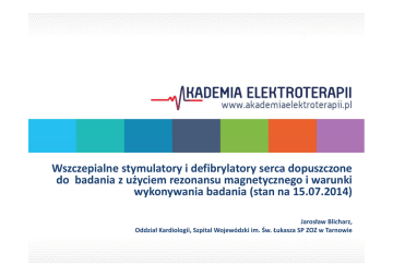 Wszczepialne stymulatory i defibrylatory serca dopuszczone do badania z użyciem rezonansu magnetycznego i warunki wykonywania badania (stan na 15.07.2014) Jarosław Blicharz, Oddział Kardiologii, Szpital Wojewódzki im. Św. Łukasza SP ZOZ w Tarnowie Potencjalne źródła interferencji MRI i CRMD (Cardiac Rhythm Managment Devices): 1. Statyczne pole magnetyczne. 2. Niejednorodne pole magnetyczne. 3. Pole HF (wysokiej częstotliwości). Samodzielnie lub w połączeniu mogą odpowiadać za niekorzystny wpływ na CRMD oraz pacjenta. 2 Wpływ pola magnetycznego na działanie CRMD jest modyfikowane przez: 1. rodzaj sekwencji obrazowania, 2. pozycję pacjenta oraz CRMD w skanerze, 3. czas trwania obrazowania, 4. natężenie pola o częstotliwości radiowej, 5. anatomię skanowanej okolicy, 6. materiały użyte w konstrukcji elektrody i CRMD, 7. przepływ krwi w okolicy końcówki elektrody. 3 Układ CRMD składa się również z elektrod! 1. Każdy producent warunkuje dopuszczenie CRMD do badania MRI tylko w połączeniu z odpowiednim elektrodami. 2. Jeżeli w ofercie danego producenta znajduje się więcej niż jedna rodzina elektrod dopuszczonych do badań MRI nie można w jednym układzie łączyć elektrod różnych typów. 3. Rodzaj implantowanej elektrody (lub elektrod) może wpłynąć na dopuszczalną strefę badania MRI oraz parametry stosowanego pola magnetycznego. 4 Rodziny stymulatorów i ICD dopuszczone do badania MRI 1. Stymulatory jedno i dwujamowe: Biotronik: - Evia, Entovis, Estella, Ecuro (od nr seryjnego - Eluna 8, Epyra 8/6,Etrinsa 8/6 66237095), Boston Scientific: - Advantio MRI, Formio MRI, Vitalio MRI Medtronic: - Advisa MRI, Ensura MRI, SJM: Accent MRI. 5 Rodziny stymulatorów i ICD dopuszczone do badania MRI 2. Stymulatory resynchronizujące: Biotronik: - Evia HF/ HF-T, - Entovis HF. 3. ICD: Biotronik: - Lumax 640/740, Iforia 5/7, Ilesto 5/7, Idova 7 (VR, DR, VR+, CRT-D) Medtronic: Evera S/XT MRI (VR,DR). 6 Warunki techniczne CRMD pozwalające na wykonanie badania MRI: 1. CRMD był implantowany ponad 6 tygodni przed datą badania MRI. 2. Urządzenie jest implantowane w okolicy piersiowej. 3. Chory nie posiada innych implantowanych, aktywnych urządzeń. 4. Elektrody są certyfikowane do badań z użyciem skanera MR. 5. Elektrody nie są uszkodzone elektrycznie. 7 Warunki techniczne CRMD pozwalające na wykonanie badania MRI: 6. Nie ma dodatkowych nieaktywnych elektrod lub przewodów. 7. Przy implantacji nie używano łączników lub przedłużaczy elektrod. 8. Próg stymulacji na każdej z elektrod nie przekracza 2,0 V 0,4 ms, przy braku stymulacji przepony przy 5,0V 1,0 ms i impedancji elektrod w zakresie 200-1500 om. 9. Wzrost chorego powyżej 1,40m. 10. Aktywowany czasowy program stymulatora lub ICD dedykowany do badania MRI. 8 Biotronik ProMRI stymulatory FBS (Full Body Scan): (bez ograniczeń regionalnych badania) 1. Dotyczy rodzin stymulatorów SR i DR: - Eluna 8, Epyra 8/6, Etrinsa 8/6 (wszystkie nr seryjne), - Evia, Ecuro, Estella, Entovis tylko powyżej nr seryjnego 66237095. 2. Statyczna siła pola magnetycznego 1,5T, szybkość narastania gradientu pól magnetycznych <200T/m/s, skaner z zamkniętą tubą i magnesami cylindrycznymi, śr. SAR dla całego ciała <2,0 W/kg, SAR dla głowy <3,2 W/kg. 3. Tylko w połączeniu z elektrodami z rodziny Safio S. 9 Biotronik ProMRI stymulatory ExZ (Exclusion Zones): Skan z izocentrum pola magnetycznego powyżej dolnego brzegu oczodołów oraz poniżej krętarza większego kości udowej. 1. Dotyczy rodzin stymulatorów SR i DR: - Eluna 8, Epyra 8/6, Etrinsa 8/6, - Evia, Ecuro, Estella, Entovis. 2. Statyczna siła pola magnetycznego 1,5T, szybkość narastania gradientu pól magnetycznych <200T/m/s, skaner z zamkniętą tubą i magnesami cylindrycznymi, śr. SAR dla całego ciała <2,0 W/kg, SAR dla głowy <3,2 W/kg. 3. W połączeniu z elektrodami z rodziny Solia. 10 Biotronik ProMRI CRT-P ExZ (Exclusion Zones) : 1. Dotyczy rodzin stymulatorów resynchronizujących: - Eluna 8 HF-T, Epyra 8 HF-T, Etrinsa 8 HF-T, - Evia HF-T, Entovis HF-T. 2. Statyczna siła pola magnetycznego 1,5T, szybkość narastania gradientu pól magnetycznych <200T/m/s, skaner z zamkniętą tubą i magnesami cylindrycznymi, śr. SAR dla całego ciała <2,0 W/kg, SAR dla głowy <3,2 W/kg. 3. W połączeniu z elektrodami RA i RV z rodziny Solia lub Safio, oraz elektrodami LV Corox ProMRI OTW, Sentus ProMRI OTW. 11 Biotronik ProMRI defibrylatory jednojamowe: warunki wykonywania badania w zależności od implantowanych ICD i elektrod 12 Biotronik ProMRI defibrylatory dwujamowe: warunki wykonywania badania w zależności od implantowanych ICD i elektrod 13 Biotronik ProMRI defibrylatory CRT-D: warunki wykonywania badania w zależności od implantowanych ICD i elektrod 14 Boston Scientific stymulatory Image Ready bez ograniczeń regionalnych badania 1. Dotyczy rodzin stymulatorów SR i DR: ADVANTIO MRI INGENIO MRI VITALIO MRI FORMIO MRI z elektrodami: Fineline II Sterox, Fineline II Sterox EZ, Ingevity MRI (Stymulatory jak tab. 1) Boston Scientific INSTRUKCJA OBSŁUGI TECHNICZNEJ DOTYCZĄCA BADANIA MRI 15 Boston Scientific stymulatory Image Ready bez ograniczeń regionalnych 2. Parametry badania MRI Statyczna siła pola magnetycznego tylko 1,5T, maksymalny gradient przestrzenny 10 T/m, skaner z zamkniętą tubą i magnesami cylindrycznymi, śr. SAR dla całego ciała <2,0 W/kg (elektrody Fineline II) <4,0 W/kg (elektrody Ingevity MRI), SAR dla głowy <3,2 W/kg. Boston Scientific INSTRUKCJA OBSŁUGI TECHNICZNEJ DOTYCZĄCA BADANIA MRI 16 Boston Scientific stymulatory Image Ready bez ograniczeń regionalnych Identyfikacja radiologiczna układu: UWAGA! Elektrody Fineline II nie mają markerów radiologicznych Boston Scientific INSTRUKCJA OBSŁUGI TECHNICZNEJ DOTYCZĄCA BADANIA MRI 17 Medtronic Surescan bez ograniczeń regionalnych badania 1. Stymulatory SR i DR: ADVISA MRI Surescan (modele A3DR01, A3SR01) ENSURA MRI Surescan (modele EN1DR01, EN1SR01) z ele