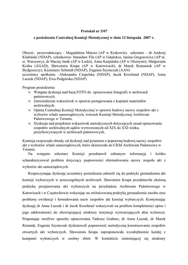 Protokół nr 5/07 z posiedzenia Centralnej Komisji Metodycznej w dniu 12 listopada 2007 r. Obecni: przewodniczący - Magadalena Marosz (AP w Krakowie), sekretarz – dr Andrzej Klubiński (NDAP), członkowie- Stanisław Flis (AP w Gdańsku), Janina Gregorowicz (AP m. st. Warszawy), dr Maciej Janik (AP w Łodzi), Anna Karpińska (AP w Olsztynie), Małgorzata Kośka (AGAD), Sławomira Krupa (AP w Katowicach), dr Marek Romaniuk (AP w Bydgoszczy), Kazimierz Schmidt (NDAP), Eugenia Szymczuk (AAN) uczestnicy spotkania –Aleksandra Czapelska (NDAP), Jacek Krochmal (NDAP), Anna Laszuk (NDAP), Ewa Podgórska (NDAP) Program posiedzenia: • Wstępna dyskusja nad bazą FOTO do opracowania fotografii w archiwach państwowych. • Zatwierdzenie wskazówek w sprawie postępowania z kopiami materiałów archiwalnych. • Opinia Centralnej Komisji Metodycznej w sprawie budowy nazwy zespołów akt z wyborów władz samorządowych, wniosek Komisji Metodycznej Archiwum Państwowego w Toruniu. • Dyskusja nad projektem wskazówek metodycznych dotyczących zasad opracowania zespołów archiwalnych sądów wytworzonych od XIX do XXI wieku, przechowywanych w archiwach państwowych. Komisja rozpoczęła obrady od dyskusji nad pytaniem o poprawną budowę nazwy zespołów akt z wyborów władz samorządowych, które skierowało do CKM Archiwum Państwowe w Toruniu. Na wstępnie sekretarz Komisji przedstawił zebranym informację i krótko scharakteryzował problem dotyczący poprawności sformułowania nazwy zespołu akt z wyborów akt samorządowych. Rozpoczynając dyskusję uczestnicy posiedzenia odnieśli się do praktyki gromadzenia akt komisji wyborczych w poszczególnych archiwach. Sławomira Krupa przedstawiła złożoną praktykę przejmowania akt wyborczych na przykładzie Archiwum Państwowego w Katowicach i w Częstochowie wskazując na zróżnicowaną praktykę gromadzenia zasobu oraz problemy ewidencji i formułowania nazw zespołów akt komisji wyborczych. Kontynuując dyskusję dr Anna Laszuk i dr Jacek Krochmal wskazywali na problem kompletności opisu i jego adekwatności do obowiązującej struktury instytucji wytwarzających akta wyborcze. Proponując możliwe sposoby opracowania Tadeusz Grabarz, dr Anna Laszuk, dr Marek Romank, Eugenia Szymczuk dyskutowali poprawność metodyczną konstruowania zespołów otwartych akt wyborczych. Sławomira Krupa zaproponowała wyodrębnienie każdej z kampanii wyborczych w osobny zbiór. W kontekście zmieniającej się struktury 2 organizacyjnej dyskutowano także poprawność umieszczenia w nazwie zespołu określeń „z terenu województwa” i „z terenu działania delegatury”. Uznano, że za przyjęciem drugiego z proponowanych rozwiązań przemawiałaby zmienność terytorialna właściwości terytorialnej delegatur, które wykraczają poza granice administracyjne województw. W związku z przedstawioną w dyskusji propozycją Stanisław Flis i Eugenia Szymczuk wskazywali konieczność ustalenia czy przyjęcie takiego rozwiązania jest poprawne ze względu na prawidłowość określenia delegatury jako sukcesora akt. Uczestnicy posiedzenia zwracali też uwagę, że przyjęcie kryterium podziału terytorialnego nie jest odpowiednie dla wyborów do sejmu, a przy formułowaniu poprawnej nazwy należy uwzględnić również jej wartość informacyjną przy wyszukiwaniu danych. W podsumowaniu dyskusji, w związku z odrębnymi opiniami Przewodnicząca CKM poprosiła dr. Marka Romaniuka i Annę Karpińską o przygotowanie informacji w sprawie poprawnego sformułowania nazwy zespołu akt wyborczych i przedstawienie ich na najbliższym spotkaniu. Uzgodniono, że po wysłuchaniu dwu propozycji Komisja sformułuje ostateczną opinię w tej sprawie. Kontynuując obrady, zgodnie z porządkiem obrad, Komisja wysłuchała informacji dotyczącej dyskusji nad bazą FOTO jaka miała miejsce na posiedzeniu zespołu Informatyka i Archiwa. Zgodnie z wcześniejszą decyzją Komisja postanowiła, aby podjąć dyskusję i zaopiniować bazę po wyrażeniu stanowiska w tej sprawie przez Zespół Informatyka i Archiwa. Informację o przebiegu dyskusji nad bazą na posiedzeniu Zespołu Informatyka i Archiwa przedstawili dr Jacek Krochmal i Kazimierz Schmidt. Członkowie Komisji uzyskali informację o dyskusji Zespołu nad założeniami bazy. Wobec braku protokołu z obrad Zespołu oraz braku opinii dotyczących bazy FOTO, które były przedstawione na posiedzeniu Zespołu Informatyka i Archiwa, CKM uznała, że nie może się ustosunkować do opinii Zespołu na podstawie częściowej informacji, która została przekazana przez Przewodniczącego Zespołu Rafała Magrysia do ZNA na krótko przed posiedzeniem Centralnej Komisji Metodycznej. Zgodnie z przekazaną informacją w sprawie oceny metodycznej i technicznej bazy FOTO Zespół nie zdołał przedyskutować na posiedzeniu i uzgodnić wspólnego stanowiska wyrażonego w formie wspólnej opinii. W związku z powyższym Komisja poprosiła o scharakteryzowanie bazy i problematyki metodycznej dr Annę Laszuk, która w swoim wystąpieniu wskazała na cele powstania bazy FOTO, potrzeby wynikające z konieczności realizacji zadań w archiwach państwowych, i uwarunkowania towarzyszące powstawaniu bazy. Odnosząc się do wcześniejszej dyskusji nad założeniami metodycznymi bazy wyjaśniła, że baza FOTO została zaprojektowana jako moduł do bazy danych IZA. Jej 3 budowa i cechy uwzględniają przede wszystkim potrzeby archiwów państwowych posiadających własny, niezbyt liczny zasób fotografii, inny niż archiwa centralne, a zwłaszcza ADM korzystający ze specjalnie dedykowanej mu bazy i programu ZEUS. W dyskusji nad założeniami bazy zwrócono uwagę, że wydaje się konieczne zapewnienie systemu na okres przejściowy przed wprowadzeniem do powszechnego użycia w archiwach zintegrowanego systemu informacji i wspólnej bazy do opracowania zasobu fotografii. W dalszej dyskusji Stanisław Flis, Kazimierz Schmidt, Magda