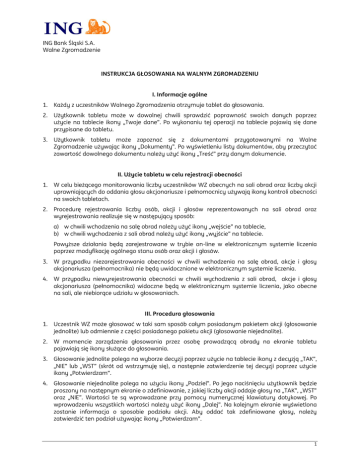 ING Bank Śląski S.A. Walne Zgromadzenie INSTRUKCJA GŁOSOWANIA NA WALNYM ZGROMADZENIU I. Informacje ogólne 1. Każdy z uczestników Walnego Zgromadzenia otrzymuje tablet do głosowania. 2. Użytkownik tabletu może w dowolnej chwili sprawdzić poprawność swoich danych poprzez użycie na tablecie ikony „Twoje dane”. Po wykonaniu tej operacji na tablecie pojawią się dane przypisane do tabletu. 3. Użytkownik tabletu może zapoznać się z dokumentami przygotowanymi na Walne Zgromadzenie używając ikony „Dokumenty”. Po wyświetleniu listy dokumentów, aby przeczytać zawartość dowolnego dokumentu należy użyć ikony „Treść” przy danym dokumencie. II. Użycie tabletu w celu rejestracji obecności 1. W celu bieżącego monitorowania liczby uczestników WZ obecnych na sali obrad oraz liczby akcji uprawniających do oddania głosu akcjonariusze i pełnomocnicy używają ikony kontroli obecności na swoich tabletach. 2. Procedurę rejestrowania liczby osób, akcji i głosów reprezentowanych na sali obrad oraz wyrejestrowania realizuje się w następujący sposób: a) w chwili wchodzenia na salę obrad należy użyć ikony „wejście” na tablecie, b) w chwili wychodzenia z sali obrad należy użyć ikony „wyjście” na tablecie. Powyższe działania będą zarejestrowane w trybie on-line w elektronicznym systemie liczenia poprzez modyfikację ogólnego stanu osób oraz akcji i głosów. 3. W przypadku niezarejestrowania obecności w chwili wchodzenia na salę obrad, akcje i głosy akcjonariusza (pełnomocnika) nie będą uwidocznione w elektronicznym systemie liczenia. 4. W przypadku niewyrejestrowania obecności w chwili wychodzenia z sali obrad, akcje i głosy akcjonariusza (pełnomocnika) widoczne będą w elektronicznym systemie liczenia, jako obecne na sali, ale niebiorące udziału w głosowaniach. III. Procedura głosowania 1. Uczestnik WZ może głosować w taki sam sposób całym posiadanym pakietem akcji (głosowanie jednolite) lub odmiennie z części posiadanego pakietu akcji (głosowanie niejednolite). 2. W momencie zarządzenia głosowania przez osobę prowadzącą obrady na ekranie tabletu pojawiają się ikony służące do głosowania. 3. Głosowanie jednolite polega na wyborze decyzji poprzez użycie na tablecie ikony z decyzją „TAK”, „NIE” lub „WST” (skrót od wstrzymuję się), a następnie zatwierdzenie tej decyzji poprzez użycie ikony „Potwierdzam”. 4. Głosowanie niejednolite polega na użyciu ikony „Podziel”. Po jego naciśnięciu użytkownik będzie proszony na następnym ekranie o zdefiniowanie, z jakiej liczby akcji oddaje głosy na „TAK”, „WST” oraz „NIE”. Wartości te są wprowadzane przy pomocy numerycznej klawiatury dotykowej. Po wprowadzeniu wszystkich wartości należy użyć ikony „Dalej”. Na kolejnym ekranie wyświetlona zostanie informacja o sposobie podziału akcji. Aby oddać tak zdefiniowane głosy, należy zatwierdzić ten podział używając ikony „Potwierdzam”. 1 ING Bank Śląski S.A. Walne Zgromadzenie IV. Głosowanie z wykorzystaniem formularza 1. Uczestnik WZ, zamierzający wykonać prawo głosu przy użyciu formularza udostępnionego przez Spółkę na stronie internetowej, powinien przed każdym głosowaniem z wykorzystaniem tego formularza zgłosić ten fakt Przewodniczącemu WZ przed rozpoczęciem głosowania, podając numer kart do głosowania oraz doręczyć Przewodniczącemu wypełniony formularz dotyczący głosowanej uchwały najpóźniej przed zakończeniem danego głosowania. W takim przypadku udostępniony uczestnikowi tablet do głosowania zostaje zablokowany na czas trwania danego głosowania, w sposób uniemożliwiający oddanie głosu z jego użyciem. 2. Przewodniczący WZ informuje Walne Zgromadzenie o oddaniu głosu przy wykorzystaniu formularza oraz informuje o dołączeniu oddanych w ten sposób głosów do wyników elektronicznego systemu liczenia. Głosy oddane z wykorzystaniem formularza stają się składnikiem sumy ogółu głosów oddanych w danym głosowaniu. V. Jawność i tajność głosowania 1. W trakcie głosowania jawnego system pobiera z bazy danych pełną informację o każdym uczestniku głosowania, uzupełniając ją o dane na temat rodzaju wybranej w danym głosowaniu decyzji i zapisuje je w zbiorze danych. 2. W trakcie głosowania tajnego system pobiera z bazy danych wyłącznie informację o liczbie akcji/głosów danego uczestnika i dopisuje do sumy głosów dla danego rodzaju decyzji, nie zapisując danych uczestnika. Po głosowaniu tajnym w systemie dostępne są wyłącznie sumy głosów w poszczególnych rodzajach decyzji i suma głosów ogółem. 2
