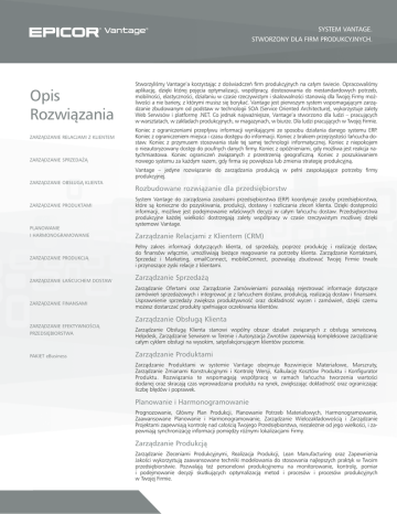 SYSTEM VANTAGE. STWORZONY DLA FIRM PRODUKCYJNYCH. Opis Rozwiàzania ZARZÑDZANIE RELACJAMI Z KLIENTEM ZARZÑDZANIE SPRZEDA˚Ñ StworzyliÊmy Vantage’a korzystajàc z doÊwiadczeƒ firm produkcyjnych na ca∏ym Êwiecie. OpracowaliÊmy aplikacj´, dzi´ki której poj´cia optymalizacji, wspó∏pracy, dostosowania do niestandardowych potrzeb, mobilnoÊci, elastycznoÊci, dzia∏aniu w czasie rzeczywistym i skalowalnoÊci stanowià dla Twojej Firmy mo˝liwoÊci a nie bariery, z którymi musisz si´ borykaç. Vantage jest pierwszym system wspomagajàcym zarzàdzanie zbudowanym od podstaw w technologii SOA (Service Oriented Architecture), wykorzystuje zalety Web Serwisów i platform´ .NET. Co jednak najwa˝niejsze, Vantage’a stworzono dla ludzi – pracujàcych w warsztatach, w zak∏adach produkcyjnych, w magazynach, w biurze. Dla ludzi pracujàcych w Twojej Firmie. Koniec z ograniczeniami przep∏ywu informacji wynikajàcymi ze sposobu dzia∏ania danego systemu ERP. Koniec z ograniczeniem miejsca i czasu dost´pu do informacji. Koniec z brakiem przejrzystoÊci ∏aƒcucha dostaw. Koniec z przymusem stosowania stale tej samej technologii informatycznej. Koniec z niepokojem o nieautoryzowany dost´p do poufnych danych firmy. Koniec z opóênieniami, gdy mo˝liwa jest reakcja natychmiastowa. Koniec ograniczeƒ zwiàzanych z przestrzenià geograficznà. Koniec z poszukiwaniem nowego systemu za ka˝dym razem, gdy firma si´ powi´ksza lub zmienia strategi´ produkcyjnà. Vantage – jedyne rozwiàzanie do zarzàdzania produkcjà w pe∏ni zaspokajajàce potrzeby firmy produkcyjnej. ZARZÑDZANIE OBS¸UGÑ KLIENTA Rozbudowane rozwiàzanie dla przedsi´biorstw ZARZÑDZANIE PRODUKTAMI PLANOWANIE I HARMONOGRAMOWANIE ZARZÑDZANIE PRODUKCJÑ ZARZÑDZANIE ¸A¡CUCHEM DOSTAW ZARZÑDZANIE FINANSAMI System Vantage do zarzàdzania zasobami przedsi´biorstwa (ERP) koordynuje zasoby przedsi´biorstwa, które sà konieczne do pozyskiwania, produkcji, dostawy i rozliczania zleceƒ klienta. Dzi´ki dost´pnoÊci informacji, mo˝liwe jest podejmowanie w∏aÊciwych decyzji w ca∏ym ∏aƒcuchu dostaw. Przedsi´biorstwa produkcyjne ka˝dej wielkoÊci dostrzegajà zalety wspó∏pracy w czasie rzeczywistym mo˝liwej dzi´ki systemowi Vantage. Zarzàdzanie Relacjami z Klientem (CRM) Pe∏ny zakres informacji dotyczàcych klienta, od sprzeda˝y, poprzez produkcj´ i realizacj´ dostaw, do finansów w∏àcznie, umo˝liwiajà bie˝àce reagowanie na potrzeby klienta. Zarzàdzanie Kontaktami, Sprzeda˝ i Marketing, emailConnect, mobileConnect, pozwalajà zbudowaç Twojej Firmie trwa∏e i przynoszàce zyski relacje z klientami. Zarzàdzanie Sprzeda˝à Zarzàdzanie Ofertami oraz Zarzàdzanie Zamówieniami pozwalajà rejestrowaç informacje dotyczàce zamówieƒ sprzeda˝owych i integrowaç je z ∏aƒcuchem dostaw, produkcjà, realizacjà dostaw i finansami. Usprawnienie sprzeda˝y zwi´ksza produktywnoÊç oraz dok∏adnoÊç wycen i zamówieƒ, dzi´ki czemu mo˝esz dostarczaç produkty spe∏niajàce oczekiwania klientów. Zarzàdzanie Obs∏ugà Klienta ZARZÑDZANIE EFEKTYWNOÂCIÑ PRZEDSI¢BIORSTWA PAKIET eBusiness Zarzàdzanie Obs∏ugà Klienta stanowi wspólny obszar dzia∏aƒ zwiàzanych z obs∏ugà serwisowà. Helpdesk, Zarzàdzanie Serwisem w Terenie i Autoryzacja Zwrotów zapewniajà kompleksowe zarzàdzanie ca∏ym cyklem obs∏ugi na wysokim, satysfakcjonujàcym klientów poziomie. Zarzàdzanie Produktami Zarzàdzanie Produktami w systemie Vantage obejmuje Rozwini´cie Materia∏owe, Marszruty, Zarzàdzanie Zmianami Konstrukcyjnymi i Kontrol´ Wersji, Kalkulacj´ Kosztów Produktu i Konfigurator Produktu. Rozwiàzania te wspomagajà wspó∏prac´ w ramach ∏aƒcucha tworzenia wartoÊci dodanej oraz skracajà czas wprowadzania produktu na rynek, zwi´kszajàc dok∏adnoÊç oraz ograniczajàc liczb´ b∏´dów i poprawek. Planowanie i Harmonogramowanie Prognozowanie, G∏ówny Plan Produkcji, Planowanie Potrzeb Materia∏owych, Harmonogramowanie, Zaawansowane Planowanie i Harmonogramowanie, Zarzàdzanie Wielozak∏adowoÊcià i Zarzàdzanie Projektami zapewniajà kontrol´ nad ca∏oÊcià Twojego Przedsi´biorstwa, niezale˝nie od jego wielkoÊci, i zapewniajà synchronizacj´ informacji pomi´dzy ró˝nymi lokalizacjami Firmy. Zarzàdzanie Produkcjà Zarzàdzanie Zleceniami Produkcyjnymi, Realizacja Produkcji, Lean Manufacturing oraz Zapewnienia JakoÊci wykorzystujà zaawansowane techniki modelowania do stosowania najlepszych praktyk w Twoim przedsi´biorstwie. Pozwalajà te˝ personelowi produkcyjnemu na monitorowanie, kontrol´, pomiar i podejmowanie decyzji skutkujàcych optymalizacjà metod i procesów i procesów produkcyjnych w Twojej Firmie. SYSTEM VANTAGE. OPIS ROZWIÑZANIA STWORZONY DLA FIRM PRODUKCYJNYCH. SZCZEGÓ¸Y ROZWIÑZANIA ZARZÑDZANIE RELACJAMI Z KLIENTEM • Zarzàdzanie Kontaktami • Marketing i Sprzeda˝ • emailConnect • mobileConnect ZARZÑDZANIE SPRZEDA˚Ñ • Zarzàdzanie Ofertami • Zarzàdzanie Zamówieniami ZARZÑDZANIE OBS¸UGÑ KLIENTA • Helpdesk • Zarzàdzanie Serwisem w Terenie • Autoryzacja Zwrotów ZARZÑDZANIE DANYMI PRODUKTÓW • Rozwini´cie Materia∏owe • Marszruty • Zarzàdzanie Zmianami Konstrukcyjnymi i Kontrola Wersji • Kalkulacja Kosztów Produktu • Konfigurator ZARZÑDZANIE PRODUKCJÑ PLANOWANIE I HARMONOGRAMOWANIE ZARZÑDZANIE ¸A¡CUCHEM DOSTAW • Prognozowanie i G∏ówny Plan Produkcji • Planowanie Potrzeb Materia∏owych • Harmonogramowanie • Zaawansowanie Planowanie i Harmonogramowanie • Zarzàdzanie Wielozak∏adowoÊcià • Zarzàdzanie Projektami • Zarzàdzanie Zleceniami Produkcyjnymi • Realizacja Produkcji (MES) • Lean Manufacturing • Zapewnienie JakoÊci • Zarzàdzanie Zakupami • Zarzàdzanie Relacjami z Dostawcami • Zarzàdzanie Zapasami • Zaawansowane Zarzàdzanie Materia∏owe • Wysy∏ka i Przyj´cie ZARZÑDZANIE FINANSAMI • Nale˝noÊci • Zobowiàzania • Ksi´ga g∏ówna •