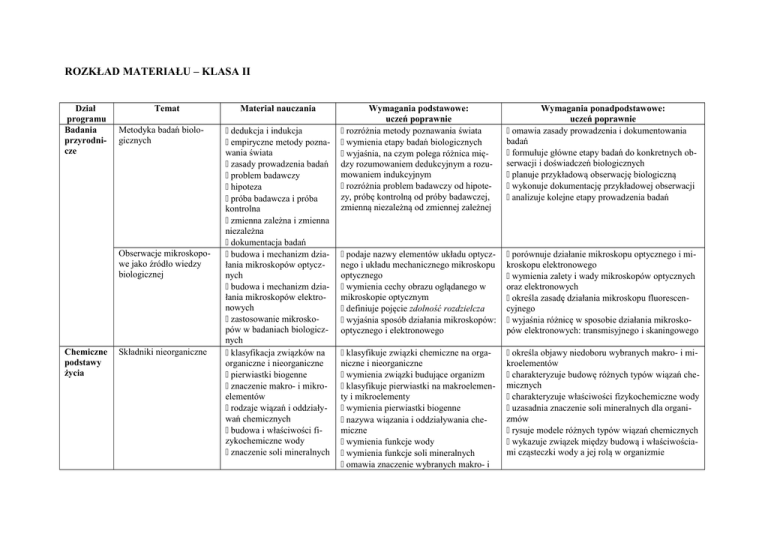 ROZKŁAD MATERIAŁU – KLASA II Dział programu Badania przyrodnicze Temat Metodyka badań biologicznych Obserwacje mikroskopowe jako źródło wiedzy biologicznej Chemiczne podstawy życia Składniki nieorganiczne Materiał nauczania dedukcja i indukcja empiryczne metody poznawania świata zasady prowadzenia badań problem badawczy hipoteza próba badawcza i próba kontrolna zmienna zależna i zmienna niezależna dokumentacja badań budowa i mechanizm działania mikroskopów optycznych budowa i mechanizm działania mikroskopów elektronowych zastosowanie mikroskopów w badaniach biologicznych klasyfikacja związków na organiczne i nieorganiczne pierwiastki biogenne znaczenie makro- i mikroelementów rodzaje wiązań i oddziaływań chemicznych budowa i właściwości fizykochemiczne wody znaczenie soli mineralnych Wymagania podstawowe: uczeń poprawnie rozróżnia metody poznawania świata wymienia etapy badań biologicznych wyjaśnia, na czym polega różnica między rozumowaniem dedukcyjnym a rozumowaniem indukcyjnym rozróżnia problem badawczy od hipotezy, próbę kontrolną od próby badawczej, zmienną niezależną od zmiennej zależnej Wymagania ponadpodstawowe: uczeń poprawnie omawia zasady prowadzenia i dokumentowania badań formułuje główne etapy badań do konkretnych obserwacji i doświadczeń biologicznych planuje przykładową obserwację biologiczną wykonuje dokumentację przykładowej obserwacji analizuje kolejne etapy prowadzenia badań podaje nazwy elementów układu optycznego i układu mechanicznego mikroskopu optycznego wymienia cechy obrazu oglądanego w mikroskopie optycznym definiuje pojęcie zdolność rozdzielcza wyjaśnia sposób działania mikroskopów: optycznego i elektronowego porównuje działanie mikroskopu optycznego i mikroskopu elektronowego wymienia zalety i wady mikroskopów optycznych oraz elektronowych określa zasadę działania mikroskopu fluorescencyjnego wyjaśnia różnicę w sposobie działania mikroskopów elektronowych: transmisyjnego i skaningowego klasyfikuje związki chemiczne na organiczne i nieorganiczne wymienia związki budujące organizm klasyfikuje pierwiastki na makroelementy i mikroelementy wymienia pierwiastki biogenne nazywa wiązania i oddziaływania chemiczne wymienia funkcje wody wymienia funkcje soli mineralnych omawia znaczenie wybranych makro- i określa objawy niedoboru wybranych makro- i mikroelementów charakteryzuje budowę różnych typów wiązań chemicznych charakteryzuje właściwości fizykochemiczne wody uzasadnia znaczenie soli mineralnych dla organizmów rysuje modele różnych typów wiązań chemicznych wykazuje związek między budową i właściwościami cząsteczki wody a jej rolą w organizmie Budowa i znaczenie węglowodanów klasyfikacja sacharydów występowanie, budowa i znaczenie monosacharydów, oligosacharydów i polisacharydów obserwacja mikroskopowa wybarwionych preparatów ziaren skrobi bulwy ziemniaka wykrywanie glukozy w soku z winogron Lipidy – budowa i znaczenie klasyfikacja tłuszczów charakterystyka lipidów prostych, złożonych i izoprenowych wykrywanie lipidów w nasionach słonecznika Białka – główny budulec organizmu podział białek ze względu na pełnione funkcje aminokwasy budowa i rodzaje białek właściwości białek struktura białek wykrywanie wiązań peptydowych mikroelementów określa znaczenie i występowanie wybranych typów wiązań i oddziaływań chemicznych omawia budowę cząsteczki wody wymienia cechy i funkcje głównych grup węglowodanów klasyfikuje sacharydy i podaje ich przykłady wymienia właściwości mono-, oligo- i polisacharydów określa kryterium klasyfikacji sacharydów wyjaśnia, w jaki sposób powstaje wiązanie O-glikozydowe omawia występowanie i znaczenie wybranych mono-, oligo- i polisacharydów wymienia funkcje lipidów klasyfikuje lipidy ze względu na budowę cząsteczki omawia znaczenie poszczególnych grup lipidów wyjaśnia, na czym polega różnica między tłuszczami nasyconymi a tłuszczami nienasyconymi nazywa grupy białek ze względu na pełnione funkcje, liczbę aminokwasów w łańcuchu, strukturę oraz obecność elementów nieaminokwasowych wymienia przykładowe białka i ich funkcje omawia budowę białek rozpoznaje struktury przestrzenne białek wymienia właściwości białek podaje kryteria klasyfikacji białek klasyfikuje monosacharydy charakteryzuje i porównuje budowę wybranych polisacharydów porównuje budowę chemiczną mono-, oligo- i polisacharydów planuje doświadczenie mające na celu wykrycie glukozy omawia powstawanie form pierścieniowych monosacharydów ilustruje powstawanie wiązania O-glikozydowego zapisuje wzory wybranych węglowodanów wymienia kryteria klasyfikacji tłuszczowców charakteryzuje budowę lipidów prostych, złożonych i izoprenowych uzasadnia znaczenie cholesterolu planuje doświadczenie, którego celem jest wykrycie lipidów porównuje poszczególne grupy lipidów omawia budowę fosfolipidów i ich rozmieszczenie w błonie biologicznej analizuje budowę triglicerydu charakteryzuje grupy białek ze względu na pełnione funkcje, liczbę aminokwasów w łańcuchu i strukturę oraz obecność elementów nieaminokwasowych zapisuje wzór ogólny aminokwasów zapisuje reakcję powstawania dipeptydu charakteryzuje strukturę 1-, 2-, 3- i 4-rzędową białek analizuje budowę aminokwasów klasyfikuje aminokwasy ze względu na charakter podstawników Komórka – podstawowa jednostka życia wskazuje wiązanie peptydowe wyjaśnia, na czym polega i w jakich warunkach zachodzi koagulacja i denaturacja białek charakteryzuje budowę pojedynczego nukleotydu DNA i RNA omawia rolę DNA wymienia rodzaje RNA i określa ich rolę określa lokalizację DNA w komórkach eukariotycznych i prokariotycznych wyjaśnia, na czym polega komplementarność zasad definiuje pojęcia: podwójna helisa, replikacja porównuje białka fibrylarne i globularne porównuje proces koagulacji i denaturacji bia
