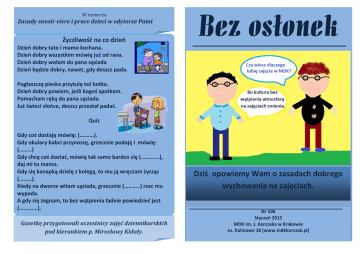 W numerze Zasady savoir vivre i prace dzieci w edytorze Paint Życzliwość na co dzień Bez osłonek Dzień dobry tato i mamo kochana. Dzień dobry wszystkim mówię już od rana. Dzień dobry wołam do pana sąsiada Dzień będzie dobry, nawet, gdy deszcz pada. Pogłaszczę pieska przytulę też kotka. Dzień dobry powiem, jeśli kogoś spotkam. Pomacham ręką do pana sąsiada. Już świeci słońce, deszcz przestał padać. Quiz Gdy coś dostaję mówię: (……….). Gdy okulary babci przynoszę, grzecznie podaję i mówię: (………) Gdy chcę coś dostać, mówię tak samo bardzo cię (………….), daj mi to mamo. Gdy się kanapką dzielę z kolegą, to mu ją wręczam życząc (………). Kiedy na dworze witam sąsiada, grzecznie (………..) rzec mu wypada. A gdy się żegnam, to bez wątpienia ładnie powiedzieć jest (………….). Gazetkę przygotowali uczestnicy zajęć dziennikarskich pod kierunkiem p. Mirosławy Kidały. Dziś opowiemy Wam o zasadach dobrego wychowania na zajęciach. Nr 106 Styczeń 2015 MDK im. J. Korczaka w Krakowie os. Kalinowe 18 (www.mdkkorczak.pl) Zasady savoir vivre Witam się z nauczycielami i pracownikami MDK oraz ze swoimi koleżankami i kolegami. Pamiętaj! "Natura dała nam dwoje oczu, dwoje uszu, ale tylko jeden język, po to, abyśmy więcej patrzyli i słuchali, niż mówili”. /Sokrates / Dobrze żyje, kto się myje” /Marcin Brykczyński/ Jeżeli spóźnię się na zajęcia, witam się, przepraszam i wyjaśniam powód spóźnienia. Okrycie wierzchnie zostawiam w szatni. Zwracając się do osób dorosłych oraz koleżanek i kolegów używam zwrotów grzecznościowych: * dzień dobry (cześć do koleżanek i kolegów), do widzenia * przepraszam, proszę, dziękuję. Nie biegam po terenie budynku MDK, nie hałasuję, nie śmiecę. Przestrzegam regulaminu pomieszczeń. Nie używam wulgarnych słów. Nie przerywam mówiącemu. Dbam o higienę osobistą i ubranie, nie przesadzam z ilością ozdób. Jestem życzliwy dla innych. "Zdrowe zęby to fortuna! Gdy dbasz o nie należycie, to są wdzięczne i z radością służą ci przez całe życie.” /Małgorzata Strzałkowska/ "Ruch jest w stanie zastąpić prawie każdy lek, ale wszystkie leki razem wzięte nie zastąpią ruchu.” /Wojciech Oczko/ Proszę, przepraszam nic nie kosztuje, a komuś wielkie szczęście spowoduje.