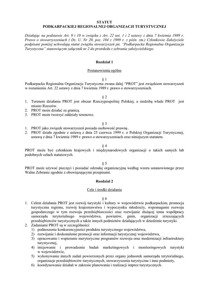 STATUT PODKARPACKIEJ REGIONALNEJ ORGANIZACJI TURYSTYCZNEJ Działając na podstawie Art. 9 i 10 w związku z Art. 22 ust. 1 i 2 ustawy z dnia 7 kwietnia 1989 r. Prawo o stowarzyszeniach ( Dz. U. Nr 20, poz. 104 z 1989 r. z późn. zm.) Członkowie Założyciele podpisani poniżej uchwalają statut związku stowarzyszeń pn. “Podkarpacka Regionalna Organizacja Turystyczna” stanowiącym załącznik nr 2 do protokołu z zebrania założycielskiego. Rozdział 1 Postanowienia ogólne §1 Podkarpacka Regionalna Organizacja Turystyczna zwana dalej “PROT” jest związkiem stowarzyszeń w rozumieniu Art. 22 ustawy z dnia 7 kwietnia 1989 r. prawo o stowarzyszeniach. §2 1. Terenem działania PROT jest obszar Rzeczypospolitej Polskiej, a siedzibą władz PROT jest miasto Rzeszów. 2. PROT może działać za granicą. 3. PROT może tworzyć oddziały terenowe. §3 1. PROT jako związek stowarzyszeń posiada osobowość prawną . 2. PROT działa zgodnie z ustawą z dnia 25 czerwca 1999 r. o Polskiej Organizacji Turystycznej, ustawą z dnia 7 kwietnia 1989 r. prawo o stowarzyszeniach oraz niniejszym statutem. §4 PROT może być członkiem krajowych i międzynarodowych organizacji o takich samych lub podobnych celach statutowych. §5 PROT może używać pieczęci i posiadać odznakę organizacyjną według wzoru ustanowionego przez Walne Zebranie zgodnie z obowiązującymi przepisami. Rozdział 2 Cele i środki działania §6 1. Celem działania PROT jest rozwój turystyki i kultury w województwie podkarpackim, promocja turystyczna regionu, rozwój krajoznawstwa i wypoczynku młodzieży, wspomaganie rozwoju gospodarczego w tym rozwoju przedsiębiorczości oraz rozwijanie służącej temu współpracy samorządu terytorialnego województwa, powiatów, gmin, organizacji zrzeszających przedsiębiorców turystycznych a także innych podmiotów działających w dziedzinie turystyki. 2. Zadaniami PROT są w szczególności: 1) podnoszenie konkurencyjności produktu turystycznego województwa, 2) rozwijanie i doskonalenie promocji oraz informacji turystycznej województwa, 3) opracowanie i wspieranie merytoryczne programów rozwoju oraz modernizacji infrastruktury turystycznej, 4) inicjowanie i prowadzenie badań marketingowych i monitoringowych turystyki w województwie, 5) wykonywanie innych zadań powierzonych przez organy jednostek samorządu terytorialnego, organizacje przedsiębiorców turystycznych, stowarzyszenia turystyczne i inne podmioty, 6) koordynowanie działań w zakresie planowania i realizacji imprez turystycznych. §7 PROT realizuje swoje cele poprzez: 1) rozwijanie istniejących produktów turystycznych województwa, 2) tworzenie nowych produktów turystycznych regionu, 3) udział w działaniach na rzecz ochrony cennych zasobów kulturowych i przyrodniczych terenu jako składowych konkurencyjnego produktu turystycznego, 4) udział w działaniach na rzecz poprawy środowiska naturalnego służących podniesieniu wizerunku turystycznego regionu, 5) udział w krajowych i zagranicznych targach turystycznych, 6) prowadzenie Podkarpackiego Centrum Informacji Turystycznej, 7) organizacja objazdów studyjnych, 8) wspieranie promocji turystycznej prowadzonej przez samorządy terytorialne, podmioty gospodarcze i inne instytucje, 9) prowadzenie działalności wydawniczej, współpraca ze środkami masowego przekazu i realizowanie innych form promocji i reklamy, 10) upowszechnianie wyników zrealizowanych badań marketingowych w województwie, 11) prowadzenie kursów i szkoleń służących rozwojowi turystyki, 12) współpracę z organami administracji rządowej, organami administracji samorządowej, z Polską Organizacją Turystyczną i lokalnymi organizacjami turystycznymi oraz podmiotami gospodarczymi, a także z organizacjami działającymi w zakresie turystyki,” 13) prowadzenie działalności gospodarczej, z której dochody są przeznaczone na realizację celów statutowych, a w szczególności: a) wydawanie książek 22.11. Z PKD, b) wydawanie gazet 22.12. Z PKD, c) wydawanie czasopism i wydawnictw periodycznych 22.13. Z PKD d) działalność biur podróży 63.30. A PKD, e) działalność agencji podróży 63.30. B PKD, f) działalność biur turystycznych 63.30. C PKD, g) pozostałą działalność turystyczną 63.30. D PKD, h) prowadzenie prac badawczo rozwojowych w dziedzinie nauk o ziemi 73.10 C PKD i) działalność związaną z organizowaniem targów i wystaw 74.84. A PKD j) pozostałą działalność komercyjną gdzie indziej nie sklasyfikowaną 74.84. B PKD k) działalność pozostałych organizacji członkowskich, gdzie indziej nie sklasyfikowaną 91.33. Z PKD l) pozostałą działalność związaną ze sportem ł) pozostałą działalność rekreacyjną, gdzie indziej nie sklasyfikowaną 92.72. Z PKD 14) pozyskiwanie środków pomocowych dla realizacji celów statutowych. Rozdział 3 Członkowie, ich prawa i obowiązki §8 1. Członkowie PROT dzielą się na: 1) zwyczajnych, 2) wspierających, 3) honorowych. 2. Członkiem zwyczajnym mogą być stowarzyszenia, gminy, powiaty, Województwo Podkarpackie, inne osoby prawne a także fizyczne prowadzące działalność gospodarczą po zgłoszeniu woli wstąpienia do PROT w formie pisemnej, po opłaceniu wpisowego i przyjęciu przez Zarząd PROT. 3. Członek zwyczajny PROT ma prawo: 1) wybierać i być wybieranym do władz PROT, 2) zgłaszać wnioski dotyczące działalności PROT, 3) brać udział w szkoleniach, konferencjach i innych imprezach organizowanych przez PROT, 4) wglądu do protokołów Walnych Zebrań i sprawozdań z działalności PROT, 5) korzystania z pomocy organizacyjno-technicznej oraz poradnictwa, 6) korzystania z odznaki PROT. 4. Członkiem wspierającym może być osoba fizyczna, niezależnie od miejsca zamieszkania i osoba prawna, niezależnie od siedziby, która popiera działalność PROT i deklaruje wsparcie finansowe na rzecz PROT (corocznie pisemnie ). 5. Przyjmowanie i skreślenie z listy członków wsp