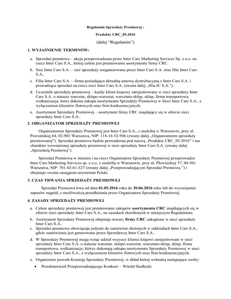 Regulamin Sprzedaży Premiowej : Produkty CRC_05.2016 (dalej “Regulamin”) 1. WYJAŚNIENIE TERMINÓW: a. Sprzedaż premiowa – akcja przeprowadzana przez Inter Cars Marketing Services Sp. z o.o. na rzecz Inter Cars S.A., której celem jest premiowanie asortymentu firmy CRC. b. Sieć Inter Cars S.A. – sieć sprzedaży zorganizowana przez Inter Cars S.A. oraz filie Inter Cars S.A.. c. Filia Inter Cars S.A. – firma posiadająca aktualną umowę dystrybucyjną z Inter Cars S.A. i prowadząca sprzedaż na rzecz sieci Inter Cars S.A. (zwana dalej „filia IC S.A.”). d. Uczestnik sprzedaży premiowej – każdy klient krajowy zarejestrowany w sieci sprzedaży Inter Cars S.A. o statusie warsztat, sklepo-warsztat, warsztato-sklep, sklep, firma transportowa, wulkanizacja, który dokona zakupu asortymentu Sprzedaży Premiowej w Sieci Inter Cars S.A., z wyłączeniem klientów flotowych oraz firm konkurencyjnych. e. Asortyment Sprzedaży Premiowej – asortyment firmy CRC znajdujący się w ofercie sieci sprzedaży Inter Cars S.A.. 2. ORGANIZATOR SPRZEDAŻY PREMIOWEJ Organizatorem Sprzedaży Premiowej jest Inter Cars S.A., z siedzibą w Warszawie, przy ul. Powsińskiej 64, 02-903 Warszawa, NIP: 118-14-52-946 (zwany dalej „Organizatorem sprzedaży premiowanej”). Sprzedaż premiowa będzie prowadzona pod nazwą „Produkty CRC_05.2016” i ma charakter wewnętrznej sprzedaży premiowej w sieci sprzedaży Inter Cars S.A. (zwany dalej „Sprzedażą Premiową”). Sprzedaż Premiową w imieniu i na rzecz Organizatora Sprzedaży Premiowej przeprowadza Inter Cars Marketing Services sp. z o.o. z siedzibą w Warszawie, przy ul. Płowieckiej 57, 04-501 Warszawa, NIP: 701-02-61-527 (zwany dalej „Przeprowadzającym Sprzedaż Premiową ”) i obejmuje swoim zasięgiem terytorium Polski. 3. CZAS TRWANIA SPRZEDAŻY PREMIOWEJ Sprzedaż Premiowa trwa od dnia 01.05.2016 roku do 30.06.2016 roku lub do wyczerpania zapasów nagród, z możliwością przedłużenia przez Organizatora Sprzedaży Premiowej. 4. ZASADY SPRZEDAŻY PREMIOWEJ a. Celem sprzedaży premiowej jest premiowanie zakupów asortymentu CRC znajdujących się w ofercie sieci sprzedaży Inter Cars S.A., na zasadach określonych w niniejszym Regulaminie. b. Asortyment Sprzedaży Premiowej obejmuje towary firmy CRC zakupione w sieci sprzedaży Inter Cars S.A.. c. Sprzedaż premiowa obowiązuje jedynie do zamówień złożonych w oddziałach Inter Cars S.A., gdzie zamówienie jest generowane przez Sprzedawcę Inter Cars S.A.. d. W Sprzedaży Premiowej mogą wziąć udział wszyscy klienci krajowi zarejestrowani w sieci sprzedaży Inter Cars S.A. o statusie warsztat, sklepo-warsztat, warsztato-sklep, sklep, firma transportowa, wulkanizacja, którzy dokonają zakupu asortymentu Sprzedaży Premiowej w sieci sprzedaży Inter Cars S.A., z wyłączeniem klientów flotowych oraz firm konkurencyjnych. e. Organizator powoła Komisję Sprzedaży Premiowej, w skład której wchodzą następujące osoby: Przedstawiciel Przeprowadzającego Konkurs – Witold Siedlecki Przedstawiciel Przeprowadzającego Konkurs – Małgorzata Olejniczak f. Komisja Sprzedaży Premiowej nadzoruje zgodność wyłonienia laureatów zgodnie z niniejszym Regulaminem. g. Prace Komisji Konkursowej są niejawne. h. Platformą informacyjną w ramach Sprzedaży Premiowej jest strona internetowa www.intercars.com.pl , która jest obsługiwana przez Przeprowadzającego Konkurs. i. Informacje o organizacji Konkursu i jego przebiegu będą emitowane (ogłaszane) za pośrednictwem środków masowego przekazu, w tym: akcji mailingowej, strony internetowej. j. Nagrody w Sprzedaży Premiowej będą przyznawane zgodnie z zasadami ustalonymi poniżej. k. Nieterminowe płatności za zakupy asortymentu Sprzedaży Premiowej lub przeterminowane należności wobec Organizatora Sprzedaży Premiowej, powodują wykluczenie Uczestnika z udziału w Sprzedaży Premiowej. 5. NAGRODY a. Za jednorazowy zakup produktów CRC za min. 200 zł netto w okresie obowiązywania akcji klient otrzyma pokrowiec na siedzenie CRC za 1 zł (netto). b. Uczestnik sprzedaży premiowej musi wyrazić zgodę na zakup nagrody w cenie 1 zł netto w momencie składania zamówienia u sprzedawcy Inter Cars S.A.. c. Liczba zestawów nagród przyznanych Uczestnikowi Sprzedaży Premiowej zależy od ostatecznej ilości zakupionego towaru, dokonanych w czasie trwania Sprzedaży Premiowej. d. Promocja dostępna jest dla klientów w oddziałach Inter Cars S.A. oraz w tzw. sprzedaży przez IC KATALOG ONLINE. e. Zakupy asortymentu Sprzedaży Premiowej dokonanej przez klienta nie sumują się przez cały okres obowiązywania Sprzedaży Premiowej. f. Organizator Sprzedaży Premiowej zastrzega że wszelkie należności podatkowe które mogą zaistnieć w związku z przekazaniem nagród pozostają po stronie Laureata Sprzedaży Premiowej. 6. ODPOWIEDZIALNOŚĆ ORGANIZATORA Odpowiedzialność Organizatora Sprzedaży Premiowej wobec Uczestników z tytułu Sprzedaży Premiowej, w żadnym przypadku nie przekroczy wartości nagród określonych w niniejszym Regulaminie. 7. REKLAMACJE I ROSZCZENIA a. Uczestnikowi przysługuje prawo złożenia reklamacji. Reklamacje przyjmowane będą wyłącznie w trybie korespondencji przesłanej listem poleconym na adres Przeprowadzającego Sprzedaż Premiową z dopiskiem „Produkty CRC_05.2016”, nie później niż do dnia 14.07.2016 r., przy czym o dotrzymaniu terminu będzie decydować data stempla pocztowego. Reklamacja zgłoszona po tym terminie nie zostanie rozpatrzona. b. Reklamacja powinna być sporządzona na piśmie i zawierać imię, nazwisko i dokładny adres Uczestnika, jak również dokładny opis przyczyny reklamacji. c. Przeprowadzający Sprzedaż Premiową rozpatrzy reklamację w terminie 7 (siedmiu) dni roboczych od daty otrzymania, przy czym okres ten może zostać wydłużony, gdy rozpoznanie reklamacji wymaga dłuższego czasu. d. Po rozpatrzeniu reklamacji Przeprowadzający Sprzedaż Premiow