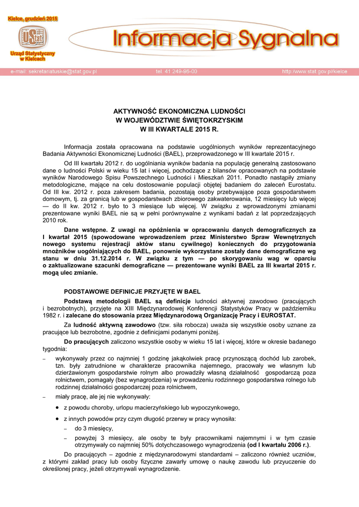 AKTYWNOŚĆ EKONOMICZNA LUDNOŚCI W WOJEWÓDZTWIE ŚWIĘTOKRZYSKIM W III KWARTALE 2015 R. Informacja została opracowana na podstawie uogólnionych wyników reprezentacyjnego Badania Aktywności Ekonomicznej Ludności (BAEL), przeprowadzonego w III kwartale 2015 r. Od III kwartału 2012 r. do uogólniania wyników badania na populację generalną zastosowano dane o ludności Polski w wieku 15 lat i więcej, pochodzące z bilansów opracowanych na podstawie wyników Narodowego Spisu Powszechnego Ludności i Mieszkań 2011. Ponadto nastąpiły zmiany metodologiczne, mające na celu dostosowanie populacji objętej badaniem do zaleceń Eurostatu. Od III kw. 2012 r. poza zakresem badania, pozostają osoby przebywające poza gospodarstwem domowym, tj. za granicą lub w gospodarstwach zbiorowego zakwaterowania, 12 miesięcy lub więcej — do II kw. 2012 r. było to 3 miesiące lub więcej. W związku z wprowadzonymi zmianami prezentowane wyniki BAEL nie są w pełni porównywalne z wynikami badań z lat poprzedzających 2010 rok. Dane wstępne. Z uwagi na opóźnienia w opracowaniu danych demograficznych za I kwartał 2015 (spowodowane wprowadzeniem przez Ministerstwo Spraw Wewnętrznych nowego systemu rejestracji aktów stanu cywilnego) koniecznych do przygotowania mnożników uogólniających do BAEL, ponownie wykorzystane zostały dane demograficzne wg stanu w dniu 31.12.2014 r. W związku z tym — po skorygowaniu wag w oparciu o zaktualizowane szacunki demograficzne — prezentowane wyniki BAEL za III kwartał 2015 r. mogą ulec zmianie. PODSTAWOWE DEFINICJE PRZYJĘTE W BAEL Podstawą metodologii BAEL są definicje ludności aktywnej zawodowo (pracujących i bezrobotnych), przyjęte na XIII Międzynarodowej Konferencji Statystyków Pracy w październiku 1982 r. i zalecane do stosowania przez Międzynarodową Organizację Pracy i EUROSTAT. Za ludność aktywną zawodowo (tzw. siła robocza) uważa się wszystkie osoby uznane za pracujące lub bezrobotne, zgodnie z definicjami podanymi poniżej. Do pracujących zaliczono wszystkie osoby w wieku 15 lat i więcej, które w okresie badanego tygodnia: – wykonywały przez co najmniej 1 godzinę jakąkolwiek pracę przynoszącą dochód lub zarobek, tzn. były zatrudnione w charakterze pracownika najemnego, pracowały we własnym lub dzierżawionym gospodarstwie rolnym albo prowadziły własną działalność gospodarczą poza rolnictwem, pomagały (bez wynagrodzenia) w prowadzeniu rodzinnego gospodarstwa rolnego lub rodzinnej działalności gospodarczej poza rolnictwem, – miały pracę, ale jej nie wykonywały: z powodu choroby, urlopu macierzyńskiego lub wypoczynkowego, z innych powodów przy czym długość przerwy w pracy wynosiła: – do 3 miesięcy, – powyżej 3 miesięcy, ale osoby te były pracownikami najemnymi i w tym czasie otrzymywały co najmniej 50% dotychczasowego wynagrodzenia (od I kwartału 2006 r.). Do pracujących – zgodnie z międzynarodowymi standardami – zaliczono również uczniów, z którymi zakład pracy lub osoby fizyczne zawarły umowę o naukę zawodu lub przyuczenie do określonej pracy, jeżeli otrzymywali wynagrodzenie. 1 Ze względu na przyjęte założenia metodologiczne, liczba pracujących uzyskana z BAEL nie obejmuje niektórych kategorii osób, które są wliczane do pracujących w sprawozdawczości z zakresu zatrudnienia, m.in.: – pracujących mieszkających w hotelach pracowniczych, – pracujących za granicą na rzecz polskich pracodawców. Bezrobotni, wg BAEL, to osoby w wieku 15-74 lata (od I kwartału 2001 r.), które spełniły jednocześnie 3 warunki: – w okresie badanego tygodnia nie były osobami pracującymi, – aktywnie poszukiwały pracy w ciągu 4 tygodni (wliczając jako ostatni tydzień badany), – były gotowe podjąć pracę w ciągu 2 tygodni następujących po badanym tygodniu. Do bezrobotnych zalicza się także osoby, które nie poszukiwały pracy, ponieważ miały pracę załatwioną i oczekiwały na jej rozpoczęcie przez okres nie dłuższy niż 3 miesiące oraz były gotowe tę pracę podjąć (do 2003 r. włącznie definicja nie uwzględniała ich gotowości do podjęcia pracy). Od I kw. 2008 r. czas poszukiwania pracy liczony jest od momentu zakończenia przerwy w poszukiwaniu pracy, o ile wystąpiła i trwała co najmniej 4 tygodnie. W związku z tym dane te nie są porównywalne z wynikami z lat poprzednich. Ludność bierna zawodowo to osoby w wieku 15 lat i więcej, które nie zostały zaklasyfikowane jako pracujące lub bezrobotne wg powyższych kryteriów, tzn. osoby, które w okresie badanego tygodnia: – nie pracowały, nie miały pracy i jej nie poszukiwały, – nie pracowały, poszukiwały pracy, ale nie były gotowe do jej podjęcia w ciągu 2 tygodni następujących po badanym tygodniu, – nie pracowały i nie poszukiwały pracy, ponieważ miały pracę załatwioną i oczekiwały na jej rozpoczęcie w okresie: dłuższym niż 3 miesiące, do 3 miesięcy, ale nie były gotowe tej pracy podjąć (od 2004 r.). Współczynnik aktywności zawodowej to udział aktywnych zawodowo (ogółem lub danej grupy) w liczbie ludności w wieku 15 lat i więcej (ogółem lub danej grupy). Wskaźnik zatrudnienia to udział pracujących (ogółem lub danej grupy) w liczbie ludności w wieku 15 lat i więcej (ogółem lub danej grupy). Stopa bezrobocia to udział bezrobotnych (ogółem lub danej grupy) w liczbie ludności aktywnej zawodowo w wieku 15 lat i więcej (ogółem lub danej grupy). Wiek produkcyjny: 18-59 lat dla kobiet, 18-64 lata dla mężczyzn; młodzież: 15-24 lata; osoby starsze: 55 lat i więcej. Uwaga: Sumy niektórych danych mogą być różne od z zaokrągleń dokonywanych przy uogólnianiu wyników badania. wielkości „ogółem”. Wynika to Dane opublikowane w tym opracowaniu przedstawiają wyniki przeliczone zgodnie z nową metodologią i nową podstawą uogólniania danych. Podstawowe wyniki BAEL dla osób w wieku 15 lat i więcej Wyszczegól