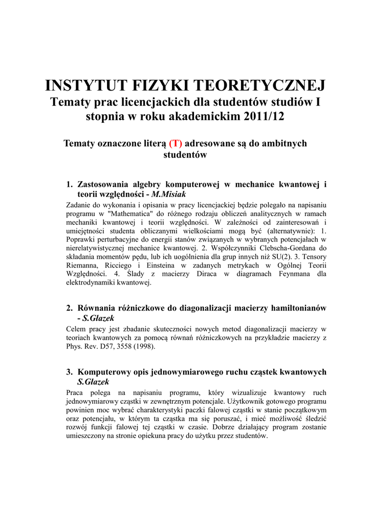 INSTYTUT FIZYKI TEORETYCZNEJ Tematy prac licencjackich dla studentów studiów I stopnia w roku akademickim 2011/12 Tematy oznaczone literą (T) adresowane są do ambitnych studentów 1. Zastosowania algebry komputerowej w mechanice kwantowej i teorii względności - M.Misiak Zadanie do wykonania i opisania w pracy licencjackiej będzie polegało na napisaniu programu w "Mathematica" do różnego rodzaju obliczeń analitycznych w ramach mechaniki kwantowej i teorii względności. W zależności od zainteresowań i umiejętności studenta obliczanymi wielkościami mogą być (alternatywnie): 1. Poprawki perturbacyjne do energii stanów związanych w wybranych potencjałach w nierelatywistycznej mechanice kwantowej. 2. Współczynniki Clebscha-Gordana do składania momentów pędu, lub ich uogólnienia dla grup innych niż SU(2). 3. Tensory Riemanna, Ricciego i Einsteina w zadanych metrykach w Ogólnej Teorii Względności. 4. Ślady z macierzy Diraca w diagramach Feynmana dla elektrodynamiki kwantowej. 2. Równania różniczkowe do diagonalizacji macierzy hamiltonianów - S.Głazek Celem pracy jest zbadanie skuteczności nowych metod diagonalizacji macierzy w teoriach kwantowych za pomocą równań różniczkowych na przykładzie macierzy z Phys. Rev. D57, 3558 (1998). 3. Komputerowy opis jednowymiarowego ruchu cząstek kwantowych S.Głazek Praca polega na napisaniu programu, który wizualizuje kwantowy ruch jednowymiarowy cząstki w zewnętrznym potencjale. Użytkownik gotowego programu powinien moc wybrać charakterystyki paczki falowej cząstki w stanie początkowym oraz potencjału, w którym ta cząstka ma się poruszać, i mieć możliwość śledzić rozwój funkcji falowej tej cząstki w czasie. Dobrze działający program zostanie umieszczony na stronie opiekuna pracy do użytku przez studentów. 4. Osobliwości równania Schoedingera z potencjałem delta w funkcji uciąglonego wymiaru przestrzeni - S.Głazek Analityczne określenie zregularyzowanego potencjału delta w równaniu Schroedingera jako funkcji parametru określającego wymiar przestrzeni i opis generowanych rozbieżności ultrafioletowych w funkcji tego wymiaru. Wynikiem powinien być prosty przykład, w którym specjaliści będą mogli zaobserwować zależność rozbieżności ultrafioletowych od wymiaru przestrzeni, a studenci będę mieli okazje zapoznać się z podstawami regularyzacji wymiarowej. 5. Związki pomiędzy kondensacją Bosego-Einsteina a nadpłynnością - K.Byczuk Praca ma polegać na przeglądzie literatury i uporządkowaniu wiedzy na temat: czy istnienie kondensacji Bosego Einsteina (makroskopowe obsadzenie stanu o najniższej energii) implikuje istnienie nadpłynności (czyli przepływu cieczy bez lepkości i kwantyzacją wirowości). Chcemy również wyprowadzić związek pomiędzy pozadiagonalnym porządkiem dalekiego zasięgu dla kondensatu, a gęstością składowej nadpłynnej w modelu dwucieczowym Tiszy-Landaua. 6. Układy z nieporządkiem, lokalizacja Andersona i teorie pola średniego – K.Byczuk Obecność nieporządku w nieskończenie wielkim układzie kwantowym prowadzi do istnienia gęstego punktowego widma wzbudzeń. Elektrony znajdujące się w tych stanach są zlokalizowane, a cały układ jest izolatorem Andersona. Istnieją teorie typu pola średniego opisujące ten efekt na poziomie jedno lub dwucząstkowym. Chcemy zbadać jakie są związki pomiędzy tymi podejściami w oparciu o znaną literaturę i własne wyprowadzenia. 7. Badanie splątania kwantowego w układach kilku cząstek K.Byczuk - Splątanie kwantowe jest potencjalnym źródłem możliwości dla komputerów kwantowych. Samo splątanie musi istnieć w prawie każdym kwantowym układzie z oddziałującymi cząstkami. Przy użyciu entropii von Neumanna oraz entropii względnej chcemy scharakteryzować ilość splątania w kwantowych układach wielu ciał. Chcemy ustalić jak na ilość splątania wpływa porządkowanie dalekiego zasięgu w układzie. 8. Symulacje Monte-Carlo w ciągłym czasie dla kwantowego oscylatora harmonicznego w polu elektrycznym - K.Byczuk Na przykładzie kwantowego oscylatora harmonicznego chcemy przetestować symulacje Monte Carlo w ciągłym czasie. Problem ten stanowi wstęp do badania układów wielu oddziałujących bozonów i ich kondensatów. 9. Pękanie mączki ziemniaczanej - P.Szymczak Gęsty roztwór mączki ziemniaczanej jest bardzo wdzięcznym obiektem do badania procesu pękania. W zależności od warunków fizycznych (kształt naczynia, tempo wysuszania etc.) uzyskuje się bardzo różne struktury spontanicznie powstających pęknięć: od przypadkowych do wysoce regularnych, takich jak heksagonalne kolumny, analogiczne do powstających w stygnącej lawie (patrz np. Grobla Olbrzymów w Irlandii). Praca będzie poświęcona teoretycznemu i/lub eksperymentalnemu badaniu powstawania i ewolucji struktury takich pęknięć. 10. Paradoks Levinthala i zwijanie białek - P.Szymczak W warunkach fizjologicznych cząsteczki białek spontanicznie zwijają się przyjmując ściśle określoną, charakterystyczną dla danego białka strukturę (tzw. strukturę natywną). Pod koniec lat 60-tych Cyrus Levinthal zauważył, że liczba różnych możliwych stanów konformacyjnych białek jest tak wielka (~10^140), że - gdyby założyć że przejście z jednej konformacji w drugą zajmuje zaledwie pikosekundę, to i tak losowe poszukiwanie natywnej konformacji powinno zająć białku czas dużo dłuższy od wieku Wszechświata. A jednak białka zwijają się w czasach rzędu milisekund. Wykorzystując proste modele, postaramy się wyjaśnić tę pozorną sprzeczność. 11. Spontaniczne łamanie symetrii chiralnej - P.Szymczak Przyczyna homochiralności wielu podstawowych składników materii ożywionej pozostaje do dziś niewyjaśniona (naturalne cukry są prawie wyłącznie prawoskrętne a aminokwasy - lewoskrętne). Przyjrzymy się mechanizmom, zarówno fizycznym (wpływ pól zewnętrznych bą