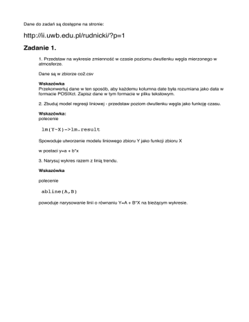 Dane do zadań są dostępne na stronie: $ $ http://ii.uwb.edu.pl/rudnicki/?p=1$ $ Zadanie 1. ! $ 1. Przedstaw na wykresie zmienność w czasie poziomu dwutlenku węgla mierzonego w atmosferze. $ $ Dane są w zbiorze co2.csv $ $ Wskazówka! Przekonwertuj dane w ten sposób, aby każdemu kolumna date była rozumiana jako data w formacie POSIXct. Zapisz dane w tym formacie w pliku tekstowym. $ $ 2. Zbuduj model regresji liniowej - przedstaw poziom dwutlenku węgla jako funkcję czasu. $ $ Wskazówka: ! polecenie $ $ lm(Y~X)->lm.result ! $ Spowoduje utworzenie modelu liniowego zbioru Y jako funkcji zbioru X $ $ w postaci y=a + b*x$ $ 3. Narysuj wykres razem z linią trendu. $ $ Wskazówka! $ polecenie $ $ abline(A,B) ! $ $ $ $ $ $ $ $ powoduje narysowanie linii o równaniu Y=A + B*X na bieżącym wykresie. $ Zadanie 2! $ Przeczytaj dane ze zbioru TempAnomalies.csv. $ Dane pokazują odchylenie globalnej średniej temperatury w każdym miesiącu od średniej temperatury w danym miesiącu z okresu bazowego 1960-1990. $ $ Narysuj wykres tych danych. $ Narysuj wykres danych z lat 1970-2014. $ Zbuduj model liniowy dla okresu 1970-2014$ Zbuduj modele liniowe dla wszystkich 30-letnich okresów z lat 1970-2014. $ $ $ $ $ Zadanie 3! $ Przeczytaj dane ze zbioru SeaIce.txt. $ $ Dane pokazują powierzchnię lodu morskiego w Arktyce w latach 1978-2012, z rozdzielczością miesięczną. $ $ Narysuj wykres powierzchni lodu w w styczniu. $ Narysuj powierzchnię lodu we wrześniu. $ $ Zbuduj model liniowy dla powierzchni lodu we wrześniu. Zadanie 4. ! Zbiór EuStockMarkets przedstawia zmiany wartości 4 europejski indeksów giełdowych w latach 1991-1998. Dane są pokazane dla 260 dni w roku (bez weekendów). Początek danych wypada w połowie roku 1991. $ $ 1. Dla zbioru EuStockMarkets przeprowadź następujące analizy dla każdego indeksu:$ $ Znajdź minimum, maksimum $ Wzrost indeksów pomiędzy minimum i maksimum. $ Zbuduj dzienną różnicę wartości indeksu, $ Stopę zwrotu zwrotu z kapitału zainwestowanego w minimum i wyciągniętego w maksimum. $ Liczbę dni wzrostów i spadków w każdym roku i w całym zbiorze. $ Największy procentowy wzrost i spadek. $ Dzień (numer dnia) dla którego nastąpił największy wzrost i spadek, dla każdego roku. $ $ Wskazówki! 1. Użyj wektorów logicznych (masek logicznych) powstałych jako wynik operacji testów. $ $ 2. Przesunięcie wektora o długości N o jedną wartość można zrobić tworząc dwie kopie wektorów o długości N+1, jedną zaczynającą się w pozycji 1, drugą zaczynającą się w pozycji 2. $ $ $ 2. Napisz funkcję, wykonującą każdą z tych analiz. $ $ 3. Napisz funkcję, która zwraca pełen komplet analiz dla wybranej zmiennej ze zbioru EuStockMarkets.