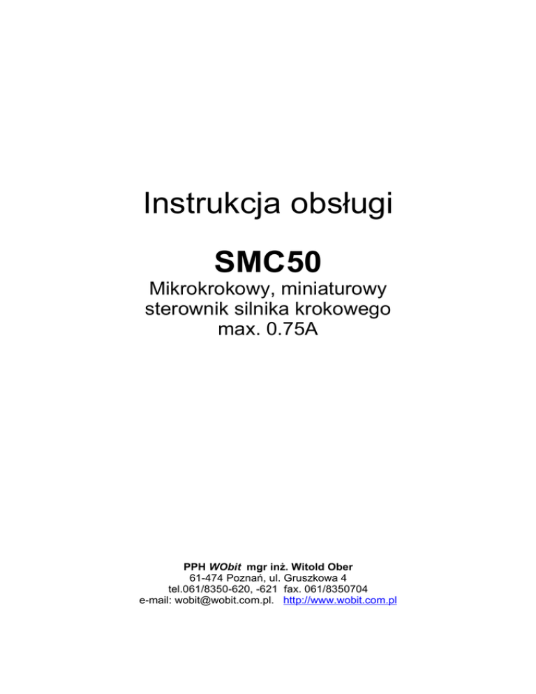 Instrukcja obsługi SMC50 Mikrokrokowy, miniaturowy sterownik silnika krokowego max. 0.75A PPH WObit mgr inż. Witold Ober 61-474 Poznań, ul. Gruszkowa 4 tel.061/8350-620, -621 fax. 061/8350704 e-mail: [email protected]. http://www.wobit.com.pl P.P.H. WObit mgr inż Witold Ober http://www.wobit.com.pl 61-474 Poznań, ul. Gruszkowa 4 tel. 061/8350800, 8350620 fax 061/8350704 Spis treści 1. Charakterystyka ogólna sterownika 2. Opis złącz 3. Ustawianie prądu 4. Ustawianie podziału 5. Opis wejść sterujących 6. Zasilanie 7. Podłączenie silnika 8. Rysunek wymiarowy 9. Wskazówki użytkowe i zalecenia nt. bezpieczeństwa 10. Dane techniczne 11. Kompletacja zestawu Instrukcja SMC50 V1.0 2 P.P.H. WObit mgr inż Witold Ober http://www.wobit.com.pl 61-474 Poznań, ul. Gruszkowa 4 tel. 061/8350800, 8350620 fax 061/8350704 1. Charakterystyka ogólna sterownika SMC50 jest sterownikiem przeznaczonym do współpracy z dwufazowym silnikiem krokowym. Umożliwia sterowanie pełnokrokowe lub krokiem podzielonym na 2, 4 lub 8 części, wymuszając odpowiednią wartość prądu w uzwojeniu silnika niezależnie od napięcia zasilania sterownika. Każdy impuls prostokątny pojawiający się na wejściu kroku (CLK) powoduje przeskok silnika o jeden krok lub mikrokrok, w zależności od głębokości podziału krokowego ustawionego w sterowniku za pomocą zworek (M1 i M2). Prąd znamionowy silnika ustalany jest za pomocą potencjometru znajdującego się na płytce drukowanej sterownika. Potencjometr umożliwia zmianę prądu fazy sterownika w zakresie 0,15A do 0,75A. Sterownik posiada wskaźnik napięcia zasilania w postaci czerwonej diody LED. SMC50 oferowany jest w dwóch wersjach, jako moduł przystosowany do wpięcia w płytkę drukowaną (M), oraz jako sterownik na profilu L kształtnym (B) z uchwytem do montażu na szynie monterskiej (35mm). Sterownik SMC50 sprzedawany jest jako komponent do budowy systemu napędowego, i powinien być zamontowany zgodnie z zasadami montażu urządzeń elektrycznych. Użytkownik odpowiada za zapewnienie zgodności z normami emisji zakłóceń i kompatybilności elektromagnetycznej (odpowiednie prowadzenie połączeń kablowych, stosowanie ekranów i pierścieni ferrytowych). Własności: · szeroki zakres napięcia zasilania +15V.. +28V (30V max.) · miniaturowe rozmiary (płytka 50,5x47,6mm wysokość z elementami 22mm) · interfejs sterujący KROK/KIERUNEK · wysoka częstotliwość kroku do 500kHz · prąd znamionowy max 0.75A na fazę · ustawianie prądu za pomocą miniaturowego potencjometru na płytce sterownika · zaawansowana technologia, montaż SMD · mikrokrok z podziałem do 1/8 · stworzony dla obsługi silników 2fazowych · automatyczne kształtowanie sinusoidy · podbicie prądu dla pracy mikrokrokowej (141% wartości prądu pełnokrokowego) · wskaźnik LED dla zasilania · miksowany tryb gaszenia prądu · zabezpieczenie termiczne końcówki mocy · zabezpieczenie przeciwprzebiciowe końcówki mocy · zabezpieczenie zaniku napięcia zasilania logiki układu · podłączenie sygnałów sterujących za pomocą dwurzędowego złącza grzebieniowego przystosowanego do zaciśnięcia taśmy 10 żyłowej (złącze IDC10) · aluminiowy profil L kształtny (B), lub moduł do wpięcia w płytę (M) · uchwyt do montażu na szynie DIN (35mm) – dla wersji B Instrukcja SMC50 V1.0 3 P.P.H. WObit mgr inż Witold Ober http://www.wobit.com.pl 61-474 Poznań, ul. Gruszkowa 4 tel. 061/8350800, 8350620 fax 061/8350704 2. Opis złącz Złącze SV3 1 – 4: V+ Napięcie zasilania z zakresu 15 – 28VDC 5 – 8: GND masa napięcia zasilania 9 – 12: A początek uzwojenia fazy A silnika 13 – 16: /A koniec uzwojenia fazy A silnika 17 – 20: B początek uzwojenia fazy B silnika 21 – 24: /B koniec uzwojenia fazy B silnika Złącze SV2 1, 3, 5, 7, 9 – GND masa sygnałów sterujących 2 – M2 wejście ustalające głębokość podziału krokowego 4 – M1 wejście ustalające głębokość podziału krokowego 6 – EN wejście zezwolenia na ruch (Enable) 8 – DIR wejście sygnału kierunku 10 – CLK wejście sygnału kroku Złącze SV1 – złącze wyboru aktywnego zbocza sygnału zegarowego zwarte 1 i 2 – aktywne zbocze opadające zwarte 2 i 3 – aktywne zbocze narastające Instrukcja SMC50 V1.0 4 P.P.H. WObit mgr inż Witold Ober http://www.wobit.com.pl 61-474 Poznań, ul. Gruszkowa 4 tel. 061/8350800, 8350620 fax 061/8350704 3. Ustawianie prądu fazy Prąd fazy ustawiany jest za pomocą miniaturowego potencjometru R19 znajdującego się na płytce drukowanej sterownika. Prąd przestawiany jest liniowo w zakresie od 0.15A do 0.75A. 4. Ustawianie podziału Podział kroku ustawiany jest za pomocą wejść M1 i M2 zgodnie z poniższą tabelą. Podział 1 ½ ¼ 1/8 5. M1 M2 Opis wejść sterujących Przykładowy sposób sterowania wejść sterownika przedstawia poniższy rysunek. Do generowania sygnałów sterujących można użyć generatora (np. GEN2 produkcji WObit), mikroindeksera umożliwiającego programowanie trajektorii ruchu (MI1.3.2 produkcji WObit), sterownika PLC z odpowiednim wyjściem (umożliwiającym generowanie szybkich impulsów prostokątnych) lub z mikrokontrolera. +5V +5V SMC50 4.7k 10k NPN Układ wejść sygnałowych sterownika Przykładowe sterowanie tranzystorem NPN Instrukcja SMC50 V1.0 5 P.P.H. WObit mgr inż Witold Ober http://www.wobit.com.pl 61-474 Poznań, ul. Gruszkowa 4 tel. 061/8350800, 8350620 fax 061/8350704 6. Zasilanie Do zasilania sterownika nie należy używać zasilaczy stabilizowanych, chyba że specjalizowanych do tego celu (przystosowanych do współpracy z sterownikami silników krokowych). Należy użyć zasilacza niestabilizowanego posiadającego na wyjściu duże kondensatory elektrolityczne konieczne m.in. do odebrania generowanej przez silnik energii. Należy zwrócić uwagę na maksymalne napięcie zasilania. Bezpieczne napięcie zasilania jest niższe od dopuszczalnego maksymalnego, gdyż do napięcia zasila