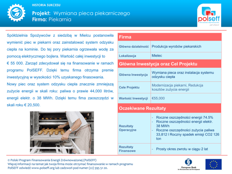 HISTORIA SUKCESU HISTORIE SUKCESÓW Projekt: Wymiana pieca do piekarniczego Projekt: Wymiana obrabiarki metalu Firma: Firma: Piekarnia Producent gotowych elementów z blach Spółdzielnia Spożywców z siedzibą w Mielcu postanowiła Przed wymienić piec w piekarni oraz zainstalować system odzysku modernizacją ciepła na kominie. Do tej pory piekarnia ogrzewała wodę za Po Firma modernizacji Główna działalność Produkcja wyrobów piekarskich pomocą elektrycznego bojlera. Wartość całej inwestycji to Lokalizacja € 55 000. Zarząd zdecydował się na finansowanie w ramach Główna Inwestycja oraz Cel Projektu programu PolSEFF. Dzięki temu firma otrzyma premie inwestycyjną w wysokości 10% uzyskanego finasowania. Nowy piec oraz system odzysku ciepła znacznie zmniejszą zużycie energii w skali roku: paliwa o prawie 44,000 litrów, energii elektr. o 38 MWh. Dzięki temu fima zaoszczędzi w skali roku € 20,500. Mielec Główna Inwestycja Wymiana pieca oraz instalacja systemu odzysku ciepła Cele Projektu Modernizacja piekarni, Redukcja kosztów zużycia energii Wartość Inwestycji €55,000 Oczekiwane Rezultaty Rezultaty Operacyjne ‐ Roczne oszczędności energii 74.5% ‐ Roczne oszczędności energii elektr. 38 MWh ‐ Roczne oszczędności zużycia paliwa 33,812 l Roczny spadek emisji CO2 126 ton Rezultaty Finansowe ‐ Prosty okres zwrotu w ciągu 2 lat © Polski Program Finansowania Energii Zrównoważonej (PolSEFF) Więcej informacji na temat jak twoja firma może otrzymać finansowanie w ramach programu PolSEFF odwiedź www.polseff.org lub zadzwoń pod numer (22) 395 51 20.