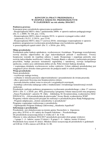 KONCEPCJA PRACY PRZEDSZKOLA W ZESPOLE SZKOLNO- PRZEDSZKOLNYM W ZAJEZIERZU na rok szkolny 2016/2017. Podstawa prawna: Koncepcja pracy przedszkola opracowana na podstawie: - Rozporządzenia MEN z dnia 7 października 2009r. w sprawie nadzoru pedagogicznego (Dz. U. z 2009r. Nr 168, poz. 1324), - Rozporządzenia MEN z dnia 6 sierpnia 2015r. w sprawie wymagań wobec szkół i placówek ( D.Z.U. Z.2015r., poz.1214) - Rozporządzenia MEN z dnia 17 czerwca 2016r. zmieniające rozporządzenie w sprawie podstawy programowej wychowania przedszkolnego oraz kształcenia ogólnego w poszczególnych typach szkół (Dz. U. z 2016r. poz. 895), Misja przedszkola: Przedszkole pełni funkcje opiekuńcze, wychowawcze i kształcące. Wspomaga wszechstronny rozwój dziecka odpowiednio do jego indywidualnych potrzeb i możliwości. Tworzy bezpieczne warunki do wspólnej zabawy i nauki. Rozpoznaje i zaspokaja potrzeby oraz rozwija indywidualne możliwości i talenty. Promuje dbanie o zdrowie i zachowania przyjazne przyrodzie, buduje poczucie tożsamości regionalnej i narodowej, rozwija kompetencje społeczne, a także uczy odróżniania dobra od zła. Pełni również funkcję doradczą i wspierającą działania wychowawcze wobec rodziców. Celem edukacji przedszkolnej jest osiągnięcie przez dziecko stanu gotowości do podjęcia nauki w szkole podstawowej. Wizja przedszkola: Nasze przedszkole: - wychowuje małego twórcę, - rozbudza w dziecku poczucie odpowiedzialności i przynależności do świata przyrody. - dba o sprawność fizyczną oraz bezpieczeństwo dzieci, - pozwala dziecku szukać coraz to nowych i oryginalnych rozwiązań, - kształtuje człowieka radzącego sobie z trudnościami i świadomego konsekwencji swoich zachowań, Przedszkole realizuje podstawę programową wychowania przedszkolnego z dnia 17 czerwca 2016 r. (Dz. U. z 2016r. poz. 895), poszerzoną o programy własne nauczycieli oraz programy: „Nasze Przedszkole", autorów W. Żaby – Żabińskiej, M. Kwaśniewskiej, wydawnictwo MAC EDUKACJA, „Od przedszkolaka do pierwszaka” Iwony Brody wydawnictwa WSiP. Programy własne nauczycieli przyjęte do realizacji w przedszkolu przez Radę Pedagogiczną: - Program adaptacyjny „Jestem samodzielny w przedszkolu” Programy wspierające realizowane w przedszkolu: - Ogólnopolski Program Edukacji Zdrowotnej „Akademia Aquafresh” Informacja o przedszkolu: Przedszkole jest zlokalizowane na terenie gminy Sieciechów w Zajezierzu przy ulicy 28 PAL-u 18 i należy do Zespołu Szkolono - Przedszkolnego. Do przedszkola uczęszczają dzieci w wieku od 3 do 6 lat. Obecnie w roku szkolnym 2016/2017 przedszkole prowadzi dwie grupy wiekowe: - I grupa 3 - 4 - latków, razem 23 dzieci i II grupa 5 - 6 – latków, razem 18 dzieci. Przedszkole liczy razem 41 dzieci. Młodsze dzieci uczęszczają do przedszkola w godzinach od 8.00 do 13.00 a starsze od 8.00 do 14. 00. 1 Źródła opracowania koncepcji: Przedszkole działa zgodnie z przyjętą przez Radę Pedagogiczną koncepcją oraz o wnioski z prowadzonego przez dyrektora nadzoru pedagogicznego w tym : - Prowadzenia ścisłej współpracy z rodzicami w celu ujednolicenia oddziaływań wychowawczych. - Empiryczne poznawanie świata , jako element kształtowania świadomego i przyjaznego odnoszenia się dzieci do natury oraz rozumienie jej wpływu na nasze zdrowie. - Organizowanie działań zmierzających do dbałości o prawidłowy rozwój fizyczny, społeczny i zdrowie emocjonalne dzieci. - Modernizacja bazy przedszkola w celu zapewnienia komfortowych warunków dla dzieci. - Rozwijanie aktywnych postaw twórczych dzieci oraz umiejętności samodzielnego podejmowania decyzji w zakresie realizacji potrzeb teatralnych, plastycznych i muzycznych. Priorytety – kierunki planowanych zmian - Aktualizacja i doskonalenie systemu pomocy psychologiczno-pedagogicznej. - Doskonalenie procesów wspomagania i edukacji dzieci, w tym poszerzenie nowatorstwa pedagogicznego w przedszkolu. - Budowanie skutecznego systemu współpracy z rodzicami w celu ujednolicenia oddziaływań wychowawczych. - Promocja zdrowia i świadomości ekologicznej. - Poszerzenie katalogu własnych tradycji. - Doskonalenie organizacji pracy zespołowej. - Doskonalenie metod i form współpracy ze środowiskiem rodzinnym i lokalnym. Cele ogólne: - Przedszkole tworzy procesy indywidualnego wspomagania rozwoju i edukacji odpowiednio do potrzeb i możliwości dziecka. - Zapewnia bezpieczne i higieniczne warunki dla prawidłowego rozwoju. - Wspiera uzdolnienie oraz wspomaga dzieci zgodnie z ich wrodzonym potencjałem i możliwościami. -Dziecko jest aktywne i twórcze w nabywaniu wiadomości umiejętności i postaw w zakresie, co najmniej podstawy programowej wychowania przedszkolnego. - Przedszkole jest integralnym elementem środowiska, w którym działa, współpracuje z nim na rzecz rozwoju własnego i lokalnego. - Przedszkole monitoruje i doskonali efekty swojej pracy. - Zarządzanie przedszkolem zapewnia jego sprawne funkcjonowanie i jest zgodne z obowiązującymi przepisami prawa, polityką oświatową państwa i przyjętą koncepcją rozwoju. Wyznacznikiem realizacji celów będą poniższe kryteria sukcesu: - Dzieci są radosne, uczęszczają do przedszkola. - Spełniona jest większość oczekiwań rodziców. - Dzieci potrafią samodzielnie podejmować decyzje. - Dzieci zgodnie funkcjonują w grupie. - Dzieci szanują dorosłych i rówieśników. - Dzieci mają rozbudzone zainteresowania. - Dzieci są dobrze przygotowane do roli ucznia. - Rodzice są aktywni, włączają się w proces edukacyjny. 2 - Kadra pedagogiczna doskonali się i podnosi kwalifikacje. - Kadra jest otwarta na zmiany i poszukuje nowatorskich metod pracy. - Przedszkole ma dobrą opinię w środowisku. Realizując powyższe priorytety i cele, należy dążyć do tego, aby stworzona serdeczna, pełna zaufania atmosfera pomiędzy całym personelem sprawiła przedszkole otwarte i przyjazne dzieciom i rodzicom. Obszary dz