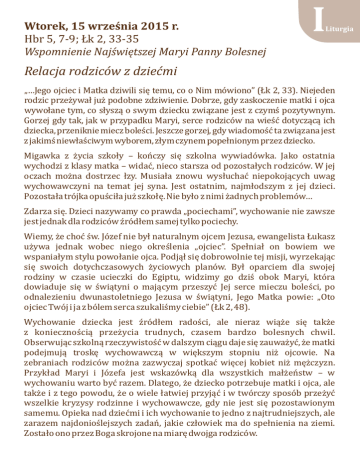 Wtorek, 15 września 2015 r. Hbr 5, 7-9; Łk 2, 33-35 Wspomnienie Najświętszej Maryi Panny Bolesnej I Liturgia Relacja rodziców z dziećmi „…Jego ojciec i Matka dziwili się temu, co o Nim mówiono” (Łk 2, 33). Niejeden rodzic przeżywał już podobne zdziwienie. Dobrze, gdy zaskoczenie matki i ojca wywołane tym, co słyszą o swym dziecku związane jest z czymś pozytywnym. Gorzej gdy tak, jak w przypadku Maryi, serce rodziców na wieść dotyczącą ich dziecka, przeniknie miecz boleści. Jeszcze gorzej, gdy wiadomość ta związana jest z jakimś niewłaściwym wyborem, złym czynem popełnionym przez dziecko. Migawka z życia szkoły – kończy się szkolna wywiadówka. Jako ostatnia wychodzi z klasy matka – widać, nieco starsza od pozostałych rodziców. W jej oczach można dostrzec łzy. Musiała znowu wysłuchać niepokojących uwag wychowawczyni na temat jej syna. Jest ostatnim, najmłodszym z jej dzieci. Pozostała trójka opuściła już szkołę. Nie było z nimi żadnych problemów… Zdarza się. Dzieci nazywamy co prawda „pociechami”, wychowanie nie zawsze jest jednak dla rodziców źródłem samej tylko pociechy. Wiemy, że choć św. Józef nie był naturalnym ojcem Jezusa, ewangelista Łukasz używa jednak wobec niego określenia „ojciec”. Spełniał on bowiem we wspaniałym stylu powołanie ojca. Podjął się dobrowolnie tej misji, wyrzekając się swoich dotychczasowych życiowych planów. Był oparciem dla swojej rodziny w czasie ucieczki do Egiptu, widzimy go dziś obok Maryi, która dowiaduje się w świątyni o mającym przeszyć Jej serce mieczu boleści, po odnalezieniu dwunastoletniego Jezusa w świątyni, Jego Matka powie: „Oto ojciec Twój i ja z bólem serca szukaliśmy ciebie” (Łk 2, 48). Wychowanie dziecka jest źródłem radości, ale nieraz wiąże się także z koniecznością przeżycia trudnych, czasem bardzo bolesnych chwil. Obserwując szkolną rzeczywistość w dalszym ciągu daje się zauważyć, że matki podejmują troskę wychowawczą w większym stopniu niż ojcowie. Na zebraniach rodziców można zazwyczaj spotkać więcej kobiet niż mężczyzn. Przykład Maryi i Józefa jest wskazówką dla wszystkich małżeństw – w wychowaniu warto być razem. Dlatego, że dziecko potrzebuje matki i ojca, ale także i z tego powodu, że o wiele łatwiej przyjąć i w twórczy sposób przeżyć wszelkie kryzysy rodzinne i wychowawcze, gdy nie jest się pozostawionym samemu. Opieka nad dziećmi i ich wychowanie to jedno z najtrudniejszych, ale zarazem najdonioślejszych zadań, jakie człowiek ma do spełnienia na ziemi. Zostało ono przez Boga skrojone na miarę dwojga rodziców. Modlitwa wiernych Przyzywając wstawiennictwa Maryi, która pozwoliła, by Jej serce przeniknął miecz cierpienia, bo tego wymagało nasze zbawienie, prośmy dobrego Boga w intencji Kościoła, świata i nas samych: 1. Módlmy się za papieża Franciszka, by wszyscy wierni kierując się posłuszeństwem wiary, przyjmowali jego nauczanie jako głos namiestnika Chrystusowego na ziemi. Ciebie prosimy… 2. Módlmy się za wszystkie małżeństwa, przeżywające trudności związane z wychowaniem dzieci, aby mężowie i żony darzyli się wzajemnym wsparciem i razem z ufnością zwracali się do Boga. 3. Módlmy się za rodziny przeżywające poważne problemy i kryzysy, aby miały odwagę skorzystać z pomocy duszpasterzy, doradców życia rodzinnego i terapeutów chrześcijańskich. 4. Módlmy się za dzieci i młodzież, by pamiętając o IV przykazaniu Bożym okazywały swoim rodzicom szacunek i posłuszeństwo wynikające z prawdziwej miłości. 5. Módlmy się za ojców i matki, którzy tu na ziemi musieli odprowadzić dzieci do bram wieczności, by Zmartwychwstały Chrystus obdarzył ich łaską nadprzyrodzonej nadziei i pozwolił po trudach ziemskiego życia spotkać się w niebie ze swymi dziećmi. 6. Módlmy się za nas samych, abyśmy nigdy nie zasmucali naszych bliskich, ale poprzez nasze słowa i czyny wnosili w ich życie radość i pociechę. Duchu Święty Boże, Ty jesteś pocieszycielem naszych serc. Nawiedź wszystkie serca, zwłaszcza te, które są pogrążone w smutku, przepełnione cierpieniem, lękiem, obawą o przyszłość i napełnij je swoją nadprzyrodzoną radością. Który żyjesz i królujesz na wieki wieków. Opracowanie: Teksty rozważań i modlitwa wiernych: ks. Marek Studenski
