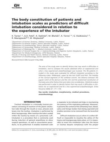 ORIGINAL ARTICLE Folia Morphol. Vol. 67, No. 3, pp. 171–174 Copyright © 2008 Via Medica ISSN 0015–5659 www.fm.viamedica.pl The body constitution of patients and intubation scales as predictors of difficult intubation considered in relation to the experience of the intubator K. Torres1, 2, A.A. Patel1, K. Styliński3, M. Błoński3, A. Torres1, 4, G. Staśkiewicz1, 5, R. Maciejewski6–8, M. Wojtaszek9 1Department of Human Anatomy, Medical University, Lublin, Poland of General Surgery, District Specialist Hospital, Lublin, Poland 3Department of Anesthesiology, District Specialist Hospital, Lublin, Poland 4Department of Gynecology, Medical University, Lublin, Poland 5Department of Radiology No. 1, Medical University, Lublin, Poland 6Department of General Surgery No. 2, Gastroenterology and Digestive System Neoplasms, Lublin, Poland 7Department for Medical Emergencies, UITM Rzeszów, Poland 8Faculty of Nursing and Heath Science, Medical University, Lublin, Poland 9Department of Anesthesiology, District Specialist Hospital, Rzeszów, Poland 2Department [Received 20 March 2008; Accepted 15 May 2008] The aims of the study were to identify factors that may result in difficulties in intubation, and to compare the results obtained when an experienced and when a less experienced anaesthesiologist was involved. The 96 patients included in the study were evaluated for difficult intubation according to the following scales: Mallampati, upper lip bite test (ULBT) and Patil. The mobility of the cervical segments of the vertebral column, the distance between the jugular notch of the sternum and the chin and the anatomical constitution of the body were other factors that were taken into consideration. Statistical analysis was performed in order to identify factors that may result in difficulties in intubation for an experienced and for a less experienced anaesthesiologist. (Folia Morphol 2008; 67: 171–174) Key words: intubation, morphometry, medical procedures, anaesthesiology INTRODUCTION a respirator to be initiated and helps in maintaining the patency of the respiratory pathways. Moreover, it prevents the content of the alimentary tract, blood, saliva and foreign bodies from being aspirated and enables secretion to be removed from the bronchial tree. Difficult intubation occurs when it is either difficult or impossible to visualise the aditus of the larynx and laryngoscopy takes place, or it is impossible to insert the intubation tube into the larynx or trachea despite compliance with the proper Tracheal intubation is a minimally invasive procedure consisting of insertion of the plastic intubation tube through the mouth or nose, pharynx and larynx into the trachea. Intubation is performed by direct laryngoscopy. After insertion the tube is sealed within the trachea by means of a pneumatic cuff. Intubation is a procedure that is commonly used during induction of general anaesthesia to allow surgical operations, as well as resuscitation procedures, to be performed. It enables treatment with Address for correspondence: K. Torres, Jaczewskiego 4, 20–090 Lublin, tel: 664 055 555, e-mail: [email protected] 171 Folia Morphol., 2008, Vol. 67, No. 3 intubation. The second aim was to compare the influence of various laryngoscopic conditions on intubation performed by experienced and less experienced specialists and in anaesthesiology. algorithms and procedures and the use of all possible auxiliary actions, such as the ‘burp’. Difficult intubation is defined by the American Society of Anesthesiologists as more than three attempts or as laryngoscopy of more than 10 min. Cormack and Lehane [2] based their definition on the following views as seen in direct laryngoscopy: 1 — the aditus to larynx is fully visible; 2 — only the posterior part of the aditus to the larynx is visible; 3 — only the epiglottis is visible; 4 — the soft palate is visible. The definition developed by Wilson is based on the following five-degree scale: 1 — the vocal folds are visible; 2 — half the vocal folds are visible; 3 — the arytenoid cartilage is visible; 4 — the epiglottis is visible; 5 — the epiglottis is not visible. Although there are many definitions, that put forward by Benumof in 1995 seems the best, as it defines difficult intubation on the basis of the degree of larynx visualisation in laryngoscopy, duration of laryngoscopy and the number of intubation attempts, and so is, in fact, a compilation of the definitions by both ASA and Cormack and Lehan. As difficult intubation is a serious medical problem, tests enabling it to be predicted have been developed. The effectiveness of these scales and tests varies and it is debatable whether they should be utilised by specialists in their daily practice. The most popular scale is the Mallampati classification, which takes into consideration the relationship between the root of the tongue and the edge of the pharynx. Examination of the patient may be conducted in the sitting or lying position, the mouth open to its maximum extent and the tongue protruding. The view is divided into four grades, and difficult intubation is considered likely when grades III and IV are identified. The sensitivity of this method is estimated as approximately 50% (modification by Samsoon and Young) [7, 10]. Equally popular and easy to perform is Patil’s test, also known as thyromental distance. The regular length of the thyromental distance is 6 cm to 6.5 cm, amounting to the width of three fingers of an adult male. A length less than this may predict difficulties during laryngoscopy. The upper lip bite test (ULBT) is an attempt to bite the upper lip with the teeth of the jaw [5]. The test results are estimated on a threedegree scale. Degree III includes those cases where difficult intubation is likely to occur. The first aim of the study was to estimate the usefulness of quick screening tests, in which the examination takes approximately 3 min, as well as several constitutiona