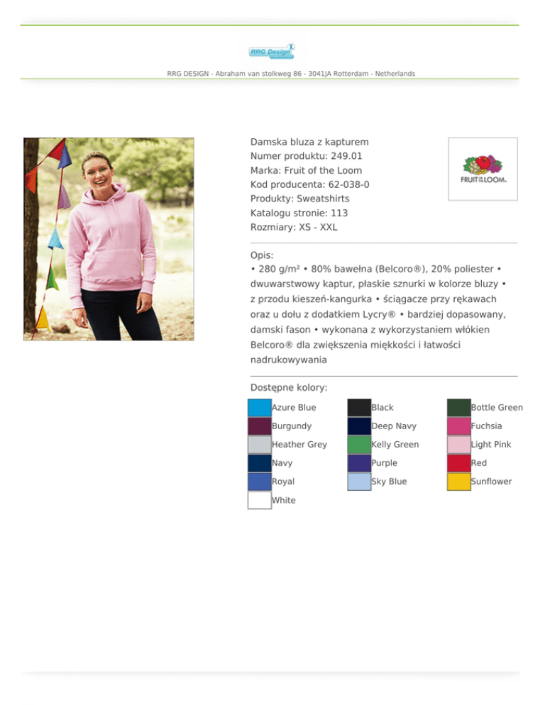 RRG DESIGN - Abraham van stolkweg 86 - 3041JA Rotterdam - Netherlands Damska bluza z kapturem Numer produktu: 249.01 Marka: Fruit of the Loom Kod producenta: 62-038-0 Produkty: Sweatshirts Katalogu stronie: 113 Rozmiary: XS - XXL Opis: • 280 g/m² • 80% bawełna (Belcoro®), 20% poliester • dwuwarstwowy kaptur, płaskie sznurki w kolorze bluzy • z przodu kieszeń-kangurka • ściągacze przy rękawach oraz u dołu z dodatkiem Lycry® • bardziej dopasowany, damski fason • wykonana z wykorzystaniem włókien Belcoro® dla zwiększenia miękkości i łatwości nadrukowywania Dostępne kolory: Azure Blue Black Bottle Green Burgundy Deep Navy Fuchsia Heather Grey Kelly Green Light Pink Navy Purple Red Royal Sky Blue Sunflower White