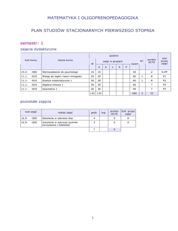 MATEMATYKA I OLIGOFRENOPEDAGOGIKA PLAN STUDIÓW STACJONARNYCH PIERWSZEGO STOPNIA semestr: 1 zajęcia dydaktyczne godziny kod kursu nazwa kursu E/- zajęć w grupach W razem A K L S punkty ECTS kod grupy zajęć 2 S-PP P 14.4- -060 Wprowadzenie do psychologii 15 15 30 11.1- -810 Wstęp do logiki i teorii mnogości 30 30 60 1 8 P1 11.1- -810 Analiza matematyczna 1 30 30 60 1 8 P2 11.1- -810 Algebra liniowa 1 30 30 60 7 P3 11.1- -810 Geometria 1 20 30 50 7 P3 125 135 260 pozostałe zajęcia kod zajęć rodzaj zajęć godz. tyg. punkty ECTS kod grupy zajęć 16.9- -000 Szkolenie w zakresie bhp 4 0 O 16.9- -000 Szkolenie w zakresie techniki korzystania z biblioteki 3 0 O 7 0 1 2 32 semestr: 2 zajęcia dydaktyczne godziny kod kursu E/- punkty ECTS kod grupy zajęć 35 1 4 S-PP 60 1 5 OH 30 2 JO 30 30 1 WF nazwa kursu zajęć w grupach W razem A 05.8- -060 Psychologiczne podstawy wychowania i nauczania 20 10 05.1- -050 Koncepcje i praktyki nauczania 30 30 09.1- -001 Język angielski B2-1 * 09.1- -002 Język francuski B2-1 * 09.1- -003 Język niemiecki B2-1 * 09.1- -004 Język rosyjski B2-1 * K L 5 30 S P Wychowanie fizyczne 1 * 16.1- -099 Rehabilitacja ruchowa 1 – sala gimnastyczna * Rehabilitacja ruchowa 1 –pływalnia * Dawne i współczesne formy aktywności fizycznej człowieka * 11.1- -810 Analiza matematyczna 2 30 30 60 7 P2 11.1- -810 Wstęp do topologii 15 15 30 4 P3 11.1- -810 Algebra liniowa 2* 30 30 60 8 P3 11.3- -090 Technologia informacyjna 10 2 TI/S-S2 135 145 * – zob. Objaśnienia 2 30 20 30 25 335 1 3 33 semestr: 3 zajęcia dydaktyczne godziny kod kursu nazwa kursu zajęć w grupach W -050 Koncepcje i praktyki wychowania 14.4- -060 Komunikacja interpersonalna 09.1- -001 Język angielski B2- 2 09.1- -002 Język francuski B2-2 09.1- -003 Język niemiecki B2-2 09.1- -004 20 punkty ECTS kod grupy zajęć 1 4 S-PP razem A 05.9- E/- K 10 L 10 S P 40 15 15 1 S-PP 30 30 2 JO 30 30 1 WF 60 1 7 P2 60 1 Język rosyjski B2-2 Wychowanie fizyczne 2 16.1- -099 Rehabilitacja ruchowa 2 – sala gimnastyczna Rehabilitacja ruchowa 2 – pływalnia Wychowanie fizyczne – zdrowie publiczne 11.1- -810 Analiza matematyczna 3* 30 30 11.1- -810 Algebra abstrakcyjna 30 30 11.3- -084 Informatyka 1 15 05.6- -052 Psychologia dziecka niepełnosprawnego 15 05.6- -052 Pedagogika specjalna 15 05.6- -810 Diagnoza możliwości matematycznych uczniów z niepełnosprawnością intelektualną 05.6- -810 Podstawy matematyki w kształceniu zintegrowanym 15 6 P3 30 3 P5 15 30 2 S-S2 30 45 3 S-S2 15 15 1 S-S2 15 30 2 S-S2 15 140 175 * – zob. Objaśnienia 3 45 25 385 1 4 32 semestr: 4 zajęcia dydaktyczne godziny kod kursu nazwa kursu punkty ECTS kod grupy zajęć 15 1 S-PP 20 2 S-PP 15 1 S-D1 3 S-D1 2 S-D2 2 JO 9 P2 3 P5 3 P5 zajęć w grupach E/- W razem A K L 15 S P 05.9- -091 Emisja głosu 05.9- -050 Profilaktyka, diagnoza i terapia pedagogiczna 10 05.1- -810 Dydaktyka matematyki 1 15 05.1- -810 Pracownia dydaktyki matematyki * 05.6- -052 Metodyka kształcenia uczniów z głębszym upośledzeniem umysłowym 1 09.1- -001 Język angielski B2-3 09.1- -002 Język francuski B2-3 09.1- -003 Język niemiecki B2-3 09.1- -004 Język rosyjski B2-3 11.1- -810 Analiza matematyczna 4 45 45 11.0- -810 Matematyka obliczeniowa 15 15 11.3- -084 Informatyka 2* 05.6- -052 Oligofrenopedagogika 15 15 30 2 S-S2 05.6- -810 Rozwijanie aktywności matematycznej uczniów z niepełnosprawnością intelektualną 15 15 30 2 S-S2 05.6- -810 Kształtowanie pojęć matematycznych u uczniów z niepełnosprawnością intelektualną 15 15 30 1 2 S-S2 05.6- -052 Podstawy edukacji integracyjnej 15 15 1 S-S2 4 33 10 30 15 15 30 30 160 145 * – zob. Objaśnienia 4 30 1 30 90 15 45 30 30 1 1 30 30 100 395 semestr: 5 zajęcia dydaktyczne godziny kod kursu nazwa kursu punkty ECTS kod grupy zajęć 20 1 S-PP 10 1 S-PP 5 S-D1 3 S-D2 2 JO E/- zajęć w grupach W razem A K L S P 12.9- -098 Profilaktyka zdrowotna i pierwsza pomoc 10 10 05.9- -819 Prawne i etyczne aspekty zawodu nauczyciela 10 05.1- -810 Dydaktyka matematyki 2* 15 05.6- -052 Metodyka kształcenia uczniów z głębszym upośledzeniem umysłowym 2 09.1- -001 Język angielski B2-4* 09.1- -002 Język francuski B2-4* 09.1- -003 Język niemiecki B2-4* 09.1- -004 Język rosyjski B2-4* 11.1- -810 Rachunek prawdopodobieństwa z elementami statystyki matematycznej 1 30 30 60 3 P4 11.1- -810 Geometria 2 30 30 60 4 P3 11.1- -810 Seminarium dyplomowe z matematyki 1 * 05.1- -810 Seminarium dyplomowe z dydaktyki matematyki 1 * 05.6- -052 Metodyka kształcenia uczniów z lekkim upośledzeniem umysłowym 05.6- -810 Terapia trudności matematycznych uczniów z niepełnosprawnością intelektualną 1 60 45 120 30 30 30 30 30 15 30 30 45 30 30 30 10 30 75 435 * – zob. Objaśnienia pozostałe zajęcia rodzaj zajęć 1 L1 110 180 kod zajęć 1 godz. tyg. 4 punkty ECTS kod grupy zajęć 0 O 10.3- -000 Szkolenie w zakresie ochrony własności intelektualnej 05.0- -052 Praktyka zawodowa pedagogiczna w szkole podstawowej specjalnej dla uczniów z upośledzeniem umysłowym 30 2 2 Z2 05.0- -052 Praktyka zawodowa pedagogiczna w gimnazjum specjalnym dla uczniów z upośledzeniem umysłowym 30 2 2 Z2 64 4 4 5 1 1 3 L2 4 S-S2 3 S-S2 27 semestr: 6 zajęcia dydaktyczne (10 tygodni) godziny kod kursu nazwa kursu zajęć w grupach W -810 Rachunek prawdopodobieństwa z elementami statystyki matematycznej 2* 10 11.1- -810 Seminarium dyplomowe z matematyki 2 05.1- -810 Seminarium dyplomowe z dydaktyki matematyki 2 05.6- -052 Diagnoza pedagogiczna dziecka i rodziny 05.6- -052 Metody terapii dzieci z trudnościami w uczeniu się 05.6- -052 Praca z dziećmi ze złożonymi niepełnosprawnościami 05.6- -810 Terapia trudności matematycznych uczniów z niepełnosprawnością intelektualną 2 punkty ECTS kod grupy zajęć 1 6 P4 razem A 11.1- E/- K L S P 20 30 L1 30 10 20 30 1 20 20 1 S-S2 20 20 2 S-S2 20 30 2 S-S2 20 20 2 S-S2 100 30 150 1 L2 14 * – zob. Objaśnienia pozostałe zajęcia kod zajęć rodzaj zajęć godz. tyg. pun