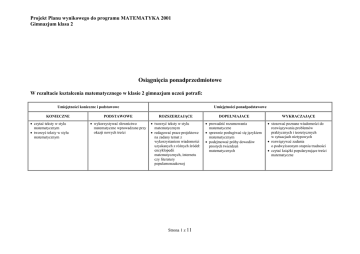 Projekt Planu wynikowego do programu MATEMATYKA 2001 Gimnazjum klasa 2 Osiągnięcia ponadprzedmiotowe W rezultacie kształcenia matematycznego w klasie 2 gimnazjum uczeń potrafi: Umiejętności konieczne i podstawowe KONIECZNE czytać teksty w stylu matematycznym tworzyć teksty w stylu matematycznym Umiejętności ponadpodstawowe PODSTAWOWE ROZSZERZAJĄCE DOPEŁNIAJACE wykorzystywać słownictwo matematyczne wprowadzane przy okazji nowych treści tworzyć teksty w stylu matematycznym redagować prace projektowe na zadany temat z wykorzystaniem wiadomości uzyskanych z różnych źródeł: encyklopedii matematycznych, internetu czy literatury popularnonaukowej prowadzić rozumowania matematyczne sprawnie posługiwać się językiem matematycznym podejmować próby dowodów prostych twierdzeń matematycznych Strona 1 z 11 WYKRACZAJĄCE stosować poznane wiadomości do rozwiązywania problemów praktycznych i teoretycznych w sytuacjach nietypowych rozwiązywać zadania o podwyższonym stopniu trudności czytać książki popularyzujące treści matematyczne Projekt Planu wynikowego do programu MATEMATYKA 2001 Gimnazjum klasa 2 Osiągnięcia przedmiotowe W rezultacie realizacji modułu uczeń potrafi: Podręcznik klasa 2 nr ewid. 39/2/2009 Tytuł modułu Umiejętności podstawowe KONIECZNE Umiejętności ponadpodstawowe ROZSZERZAJĄCE PODSTAWOWE DOPEŁNIAJACE WYKRACZAJĄCE odczytywać informacje z diagramu odczytywać informacje z tabeli przedstawiać informacje na diagramach i w tabelach odczytywać dane przedstawione na diagramie i w tabeli obliczać średnią arytmetyczną wyników wyznaczać modalną wyników wyznaczać medianę wyników interpretować wyniki w oparciu o liczby charakteryzujące zbiór wyników Mnożenie i dzielenie potęg o tych samych podstawach obliczać wartość potęgi o wykładniku naturalnym zapisywać potęgi w postaci iloczynu jednakowych czynników obliczać wartość wyrażenia arytmetycznego mnożyć i dzielić potęgi o tych samych podstawach podnosić potęgę do potęgi zapisywać potęgi na różne sposoby zamieniać jednostki z wykorzystaniem zapisu potęgowego upraszczać wyrażenie korzystając ze wzorów na iloczyn i iloraz potęg o tych samych podstawach oraz potęgę potęgi stosować poznane twierdzenia o potęgach obliczać wartości wyrażeń arytmetycznych zawierających potęgi, zgodnie z poznanymi twierdzeniami dostrzegać prawidłowości i formułować reguły Mnożenie i dzielenie potęg o tych samych wykładnikach obliczać potęgi o wykładniku naturalnym zapisywać potęgi w postaci iloczynu jednakowych czynników obliczać wartość wyrażeń arytmetycznych zgodnie z kolejnością wykonywania działań mnożyć i dzielić potęgi o tych samych wykładnikach obliczać wartość wyrażeń, stosując wzory dotyczące działań na potęgach przekształcać wyrażenia algebraiczne do najprostszej postaci doprowadzać wyrażenia algebraiczne do najprostszej postaci zgodnie z poznanymi regułami 1. Statystyka 2. 3. Strona 2 z 11 formułować reguły posługiwać się poznanymi pojęciami matematycznymi Projekt Planu wynikowego do programu MATEMATYKA 2001 Gimnazjum klasa 2 Podręcznik klasa 2 nr ewid. 39/2/2009 Tytuł modułu Umiejętności podstawowe KONIECZNE Umiejętności ponadpodstawowe PODSTAWOWE ROZSZERZAJĄCE DOPEŁNIAJACE WYKRACZAJĄCE 4. Potęga o wykładniku całkowitym obliczać potęgi liczb o wykładnikach naturalnych wyznaczyć odwrotność danej liczby przedstawić liczbę w postaci potęgi o wykładniku całkowitym obliczać potęgi o wykładniku ujemnym stosować poznane twierdzenia o potęgach do potęg o wykładnikach całkowitych korzystać z poznanych wzorów dotyczących potęg przedstawiać wyrażenia algebraiczne zawierające potęgi o wykładnikach całkowitych w najprostszej postaci zapisywać liczby z wykorzystaniem dziesiątkowego pozycyjnego systemu liczenia i całkowitych wykładników liczby 10 zapisywać liczby w notacji wykładniczej i zamieniać notację wykładniczą na postać dziesiętną formułować reguły posługiwać się poznanymi pojęciami matematycznymi 5. Wielokąty wpisane w okrąg rozpoznawać wielokąty wpisane w okrąg wskazywać środek okręgu opisanego na trójkącie wyznaczać konstrukcyjnie środek okręgu opisanego na trójkącie: ostrokątnym, prostokątnym, rozwartokątnym opisać okrąg na trójkącie korzystać z własności wielokątów wpisanych w okrąg badać własności czworokątów wpisanych w okrąg wyznaczać, o ile to możliwe, środki okręgów opisanych na czworokątach formułować warunki określające możliwości wpisywania wielokątów w okrąg dostrzegać analogie formułować hipotezy 6. Położenie prostej względem okręgu rozpoznawać na rysunku styczne i sieczne badać wzajemne położenie prostych: siecznej i stycznej do okręgu wyznaczać konstrukcyjnie styczną do okręgu znajdować punkty płaszczyzny spełniające podane warunki uzasadnić konstrukcję stycznej do okręgu 7. Wielokąty opisane na okręgu rozpoznawać trójkąty opisane na okręgu rozpoznawać wielokąty opisane na okręgu wyznaczać środek okręgu wpisanego w trójkąt rysować wielokąty opisane na okręgu wykorzystywać własności wielokątów opisanych na okręgu Strona 3 z 11 Projekt Planu wynikowego do programu MATEMATYKA 2001 Gimnazjum klasa 2 Podręcznik klasa 2 nr ewid. 39/2/2009 Tytuł modułu Umiejętności podstawowe KONIECZNE Umiejętności ponadpodstawowe ROZSZERZAJĄCE PODSTAWOWE 8. Obwód i pole koła obliczać i szacować z zadaną dokładnością długość okręgu, gdy dany jest jego promień obliczać pole koła, gdy dana jest długość promienia lub średnicy obliczać długość promienia, gdy dana jest długość okręgu obliczać długość promienia lub średnicy, gdy dane jest pole koła obliczać pole pierścienia kołowego obliczać długość łuku obliczać pole wycinka koła posługiwać się przybliżeniami dziesiętnymi liczby π 9. Mnożenie sum algeb