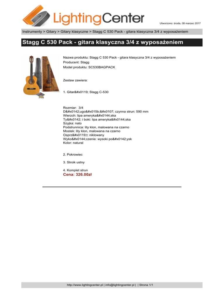 Utworzono: środa, 08 marzec 2017 Instrumenty > Gitary > Gitary klasyczne > Stagg C 530 Pack - gitara klasyczna 3/4 z wyposażeniem Stagg C 530 Pack - gitara klasyczna 3/4 z wyposażeniem Nazwa produktu: Stagg C 530 Pack - gitara klasyczna 3/4 z wyposażeniem Producent: Stagg Model produktu: SC530BAGPACK Zestaw zawiera: 1. Gitarę Stagg C-530 Rozmiar: 3/4 Długość czynna strun: 590 mm Wierzch: lipa amerykańska Tył i boki: lipa amerykańska Szyjka: nato Podstrunnica: lity klon, malowana na czarno Mostek: lity klon, malowana na czarno Osprzęt: niklowany Wykończenie: wysoki połysk Kolor: natural 2. Pokrowiec 3. Stroik ustny 4. Komplet strun Cena: 326.00zł http://www.lightingcenter.pl | [email protected] | | Strona 1/1