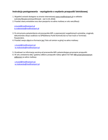 Instrukcja postępowania - wystąpienie o wydanie przepustki lotniskowej 1. Wypełnić wnioski dostępne na stronie internetowej www.modlinairport.pl w zakładce Lotnisko/Bezpieczeństwo/Wnioski - (od 11.01.2016) 2. Przesłać skany wniosków oraz skan paszportu na adres mailowy w celu weryfikacji: [email protected] [email protected] 3. Po otrzymaniu potwierdzenia od pracownika MPL o poprawności wypełnionych wniosków, oryginały dokumentów złożyć osobiście na GPK(Główny Punkt Kontroli) lub na Fast track w Terminalu Pasażerskim. 4. Przesłać swoje zdjęcie w formacie jpg ( foto od ramion w górę) na adres mailowy: [email protected];  [email protected]. 5. Oczekiwać na informację zwrotną od pracownika MPL potwierdzającą przyznanie przepustki. 6. W celu umówienia daty i godziny odbioru przepustki należy zgłosić ten fakt 48h przed planowanym odbiorem na adres mailowy: [email protected], [email protected].