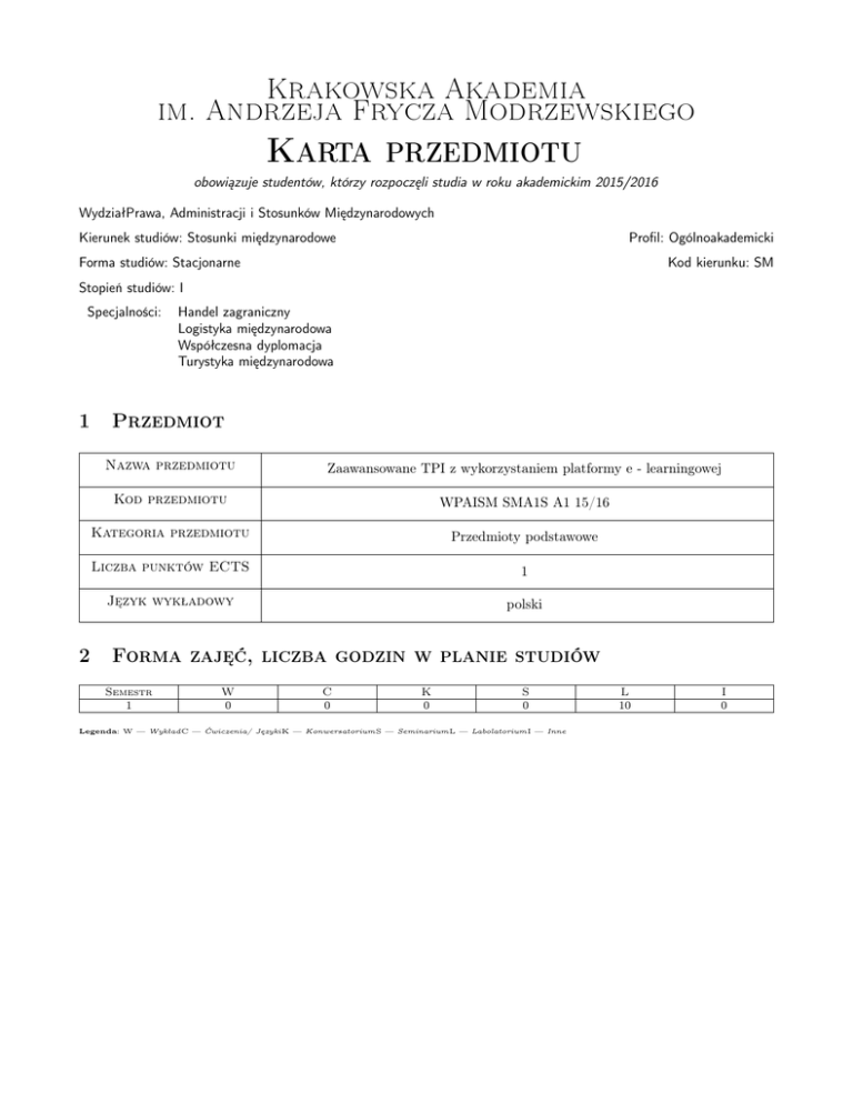 Krakowska Akademia im. Andrzeja Frycza Modrzewskiego Karta przedmiotu obowiązuje studentów, którzy rozpoczęli studia w roku akademickim 2015/2016 WydziałPrawa, Administracji i Stosunków Międzynarodowych Kierunek studiów: Stosunki międzynarodowe Profil: Ogólnoakademicki Forma studiów: Stacjonarne Kod kierunku: SM Stopień studiów: I Specjalności: 1 2 Handel zagraniczny Logistyka międzynarodowa Współczesna dyplomacja Turystyka międzynarodowa Przedmiot Nazwa przedmiotu Zaawansowane TPI z wykorzystaniem platformy e - learningowej Kod przedmiotu WPAISM SMA1S A1 15/16 Kategoria przedmiotu Przedmioty podstawowe Liczba punktów ECTS 1 Język wykładowy polski Forma zajęć, liczba godzin w planie studiów Semestr 1 W 0 C 0 K 0 S 0 Legenda: W — WykładC — Ćwiczenia/ JęzykiK — KonwersatoriumS — SeminariumL — LabolatoriumI — Inne L 10 I 0 Krakowska Akademia im. Andrzeja Frycza Modrzewskiego 3 Cele przedmiotu Cel 1 Poznanie możliwości jakie daje chmura Microsoft oraz pakiet MS Office 365. Cel 2 Wprowadzenie do tematyki nauczania na odległość, przedstawienie możliwości platform e-learningowych. 4 Wymagania wstępne 1 brak 5 Modułowe efekty kształcenia MW1 Ma wiedze z dziedziny nowych technologii internetowych, m.in. komunikowania się i nauczania z wykorzystaniem internetu. MU2 Posiada umiejętność tworzenia i redagowania dokumentów tekstowych i prezentacji multimedialnych. MU3 Potrafi posługiwać się nowoczesnymi narzędziami internetowymi związanymi z e-nauczaniem. MK4 Ma świadomość konieczności ciągłego rozwijania swoich umiejętności. 6 Treści programowe Lp L1 L2 L3 L4 7 Labolatorium Tematyka zajęć Opis szczegółowy bloków tematycznych E-learning - podstawowe definicje. Przedstawienie platform e-learningowych. Korzystanie z platformy e-learningowej na przykładzie platformy KA. Obsługa kursów e-learningowych (zaliczenie, tryby, terminy, testy) Omówienie elementu Zadanie (udzielenie odpowiedzi na zadanie, komentarz, wprowadzanie poprawek). Komunikacja na platformie (czat, forum, wiadomości). Office 365 - jak korzystać z aplikacji Office za pomocą przeglądarki. Prezi założenie konta, logowanie, rozpoczęcie pracy z szablonami, tworzenie prezentacji na zadany temat. Razem Metody dydaktyczne M2. Ćwiczenia laboratoryjne M11. Projekty M8. Praca w grupach Strona 2/4 Liczba godzin 2 2 4 2 10 Krakowska Akademia im. Andrzeja Frycza Modrzewskiego 8 Obciążenie pracą studenta Średnia liczba godzin na zrealizowanie aktywności Forma aktywności Godziny kontaktowe z nauczycielem akademickim, w tym: Godziny wynikające z planu studiów 10 Konsultacje przedmiotowe 0 Egzaminy i zaliczenia w sesji 0 Godziny bez udziału nauczyciela akademickiego wynikające z nakładu pracy studenta, w tym: Przygotowanie się do zajęć, w tym studiowanie zalecanej literatury 5 Opracowanie wyników 0 Przygotowanie raportu, projektu, prezentacji, dyskusji 10 Sumaryczna liczba godzin dla przedmiotu wynikająca z 25 całego nakładu pracy studenta 1 Sumaryczna liczba punktów ECTS dla przedmiotu 9 Metody oceny Ocena podsumowująca P17. Projekt P11. Aktywność na zajęciach Kryteria oceny Na ocenę 3 Na ocenę 3.5 Na ocenę 4 Na ocenę 4.5 Na ocenę 5 10 Co najmniej 40% obecność na zajęciach, prosty projekt zaliczeniowy wykonany w programie PowerPoint 365. Co najmniej 60% obecność na zajęciach, projekt zaliczeniowy wykonany w programie PowerPoint 365. Co najmniej 60% obecność na zajęciach, projekt zaliczeniowy wykonany z wykorzystaniem kliku programów Office 365. Co najmniej 80% obecność na zajęciach, projekt zaliczeniowy wykonany z wykorzystaniem kliku programów Office 365. Co najmniej 80% obecność na zajęciach, projekt zaliczeniowy wykonany z wykorzystaniem kliku programów Office 365 oraz prezentacja w Prezi. Macierz realizacji przedmiotu Modułowe efekty kształcenia dla przedmiotu MW1 MU1 MU2 MK1 Odniesienie do efektów kierunkowych K_W12 K_U10, K_U11 K_U10 K_K01 Treści programowe Metody dydaktyczne Sposoby oceny L1, L2, L3, L4 L2, L3, L4 L1, L2 L1, L2, L3, L4 M2, M11, M8 M2, M11, M8 M2 M2, M11, M8 P11 P17, P11 P17, P11 P11 Strona 3/4 Krakowska Akademia im. Andrzeja Frycza Modrzewskiego 11 Wykaz literatury Literatura podstawowa: [1] Microsoft — Szkolenia dotyczace usługi Office 365, źródło internetowe, 2014, Microsoft [www.przygotujsienaoffice365.pl] [2] Woźniak, Jacek — e-Learning w biznesie i edukacji, Warszawa, 2009, Wydawnictwa Akademickie i Profesjonalne Literatura uzupełniająca: [1] Wróblewski Piotr — MS Office 2013/365 PL w biurze i nie tylko, Gliwice, 2013, Helion 12 Informacje o nauczycielach akademickich Oboba odpowiedzialna za kartę mgr Sebastian Rymarczyk (kontakt: [email protected]) Oboby prowadzące przedmiot mgr Sebastian Rymarczyk (kontakt: [email protected]) Strona 4/4