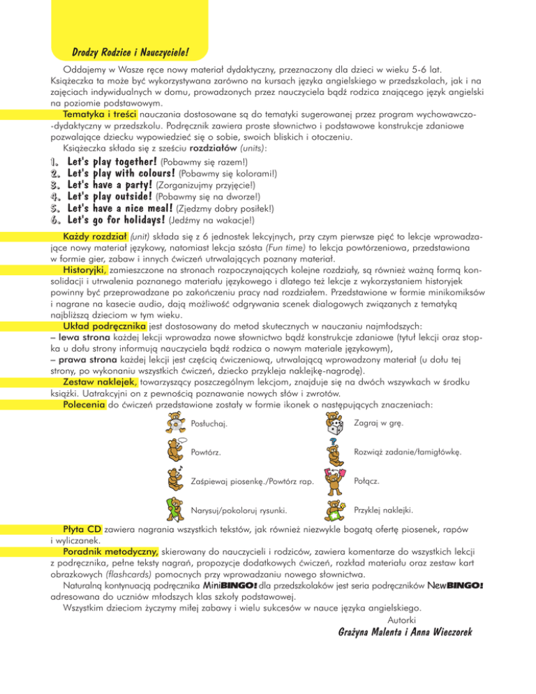 Drodzy Rodzice i Nauczyciele! Oddajemy w Wasze r´ce nowy materia∏ dydaktyczny, przeznaczony dla dzieci w wieku 5-6 lat. Ksià˝eczka ta mo˝e byç wykorzystywana zarówno na kursach j´zyka angielskiego w przedszkolach, jak i na zaj´ciach indywidualnych w domu, prowadzonych przez nauczyciela bàdê rodzica znajàcego j´zyk angielski na poziomie podstawowym. Tematyka i treÊci nauczania dostosowane sà do tematyki sugerowanej przez program wychowawczo-dydaktyczny w przedszkolu. Podr´cznik zawiera proste s∏ownictwo i podstawowe konstrukcje zdaniowe pozwalajàce dziecku wypowiedzieç si´ o sobie, swoich bliskich i otoczeniu. Ksià˝eczka sk∏ada si´ z szeÊciu rozdzia∏ów (units): 1. 2. 3. 4. 5. 6. Let's Let's Let's Let's Let's Let's play together! (Pobawmy si´ razem!) play with colours! (Pobawmy si´ kolorami!) have a party! (Zorganizujmy przyj´cie!) play outside! (Pobawmy si´ na dworze!) have a nice meal! (Zjedzmy dobry posi∏ek!) go for holidays! (Jedêmy na wakacje!) Ka˝dy rozdzia∏ (unit) sk∏ada si´ z 6 jednostek lekcyjnych, przy czym pierwsze pi´ç to lekcje wprowadzajàce nowy materia∏ j´zykowy, natomiast lekcja szósta (Fun time) to lekcja powtórzeniowa, przedstawiona w formie gier, zabaw i innych çwiczeƒ utrwalajàcych poznany materia∏. Historyjki, zamieszczone na stronach rozpoczynajàcych kolejne rozdzia∏y, sà równie˝ wa˝nà formà konsolidacji i utrwalenia poznanego materia∏u j´zykowego i dlatego te˝ lekcje z wykorzystaniem historyjek powinny byç przeprowadzane po zakoƒczeniu pracy nad rozdzia∏em. Przedstawione w formie minikomiksów i nagrane na kasecie audio, dajà mo˝liwoÊç odgrywania scenek dialogowych zwiàzanych z tematykà najbli˝szà dzieciom w tym wieku. Uk∏ad podr´cznika jest dostosowany do metod skutecznych w nauczaniu najm∏odszych: – lewa strona ka˝dej lekcji wprowadza nowe s∏ownictwo bàdê konstrukcje zdaniowe (tytu∏ lekcji oraz stopka u do∏u strony informujà nauczyciela bàdê rodzica o nowym materiale j´zykowym), – prawa strona ka˝dej lekcji jest cz´Êcià çwiczeniowà, utrwalajàcà wprowadzony materia∏ (u do∏u tej strony, po wykonaniu wszystkich çwiczeƒ, dziecko przykleja naklejk´-nagrod´). Zestaw naklejek, towarzyszàcy poszczególnym lekcjom, znajduje si´ na dwóch wszywkach w Êrodku ksià˝ki. Uatrakcyjni on z pewnoÊcià poznawanie nowych s∏ów i zwrotów. Polecenia do çwiczeƒ przedstawione zosta∏y w formie ikonek o nast´pujàcych znaczeniach: Pos∏uchaj. Zagraj w gr´. Powtórz. Rozwià˝ zadanie/∏amig∏ówk´. ZaÊpiewaj piosenk´./Powtórz rap. Po∏àcz. Narysuj/pokoloruj rysunki. Przyklej naklejki. P∏yta CD zawiera nagrania wszystkich tekstów, jak równie˝ niezwykle bogatà ofert´ piosenek, rapów i wyliczanek. Poradnik metodyczny, skierowany do nauczycieli i rodziców, zawiera komentarze do wszystkich lekcji z podr´cznika, pe∏ne teksty nagraƒ, propozycje dodatkowych çwiczeƒ, rozk∏ad materia∏u oraz zestaw kart obrazkowych (flashcards) pomocnych przy wprowadzaniu nowego s∏ownictwa. Naturalnà kontynuacjà podr´cznika Mini dla przedszkolaków jest seria podr´czników New adresowana do uczniów m∏odszych klas szko∏y podstawowej. Wszystkim dzieciom ˝yczymy mi∏ej zabawy i wielu sukcesów w nauce j´zyka angielskiego. Autorki Gra˝yna Malenta i Anna Wieczorek
