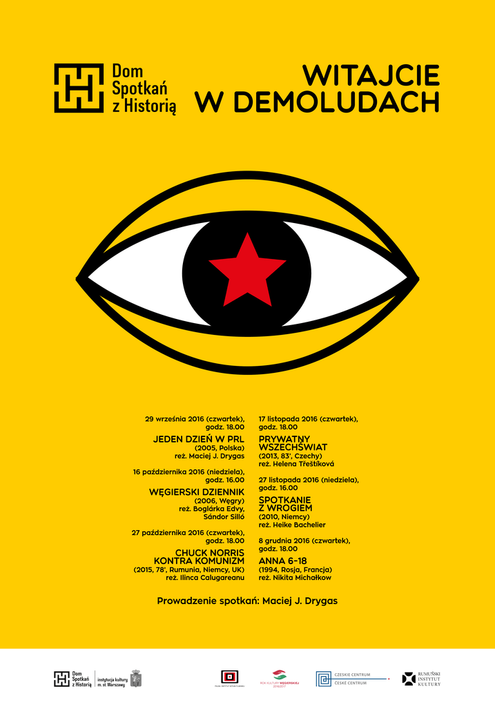 WITAJCIE W DEMOLUDACH 29 września 2016 (czwartek), godz. 18.00 Jeden dzień w PRL (2005, Polska) reż. Maciej J. Drygas 16 października 2016 (niedziela), godz. 16.00 Węgierski dziennik (2006, Węgry) reż. Boglárka Edvy, Sándor Silló 27 października 2016 (czwartek), godz. 18.00 Chuck Norris kontra komunizm (2015, 78’, Rumunia, Niemcy, UK) reż. Ilinca Calugareanu 17 listopada 2016 (czwartek), godz. 18.00 Prywatny wszechświat (2013, 83’, Czechy) reż. Helena Třeštíková 27 listopada 2016 (niedziela), godz. 16.00 Spotkanie z wrogiem (2010, Niemcy) reż. Heike Bachelier 8 grudnia 2016 (czwartek), godz. 18.00 Anna 6-18 (1994, Rosja, Francja) reż. Nikita Michałkow Prowadzenie spotkań: Maciej J. Drygas instytucja kultury m. st. Warszawy