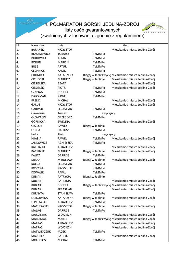 4. PÓŁMARATON GÓRSKI JEDLINA-ZDRÓJ listy osób gwarantowanych (zwolnionych z losowania zgodnie z regulaminem) LP 1. 2. 3. 4. 5. 6. 7. 8. 9. 10. 11. 12. 13. 14. 15. 16. 17. 18. 19. 20. 21. 22. 23. 24. 25. 26. 27. 28. 29. 30. 31. 32. 33. 34. 35. 36. 37. 38. 39. 40. 41. 42. 43. 44. 45. 46. Nazwisko BARAŃSKI BŁASZKIEWICZ BOROWIAK BORUŃ BUSZ CECHNICKI CHOMIAK CICHOCKI CIESIELSKA CIESIELSKI CZAPIGA DAJCZMAN FRELIK GALUS GARWOL Gawroński GŁOWACKI GÓRNICKA GRZESIK GUNIA Holly HRABIA JANKOWICZ KACPRZAK KACPRZYK KALITA KIELAR KOŁDA KOSZYKA KOWALIK KUBIAK KUBIAK KUBIAK KUBIAK KURNYTA LATKOWSKA ŁEPKOWSKI MACHOWSKI MALĄG MARCINIAK MARCINIAK MATRAS MATRAS MATWIEJCZUK MAZUREK MOLOCIOS Imię KRZYSZTOF TOMASZ ALLAN MARCIN ARTUR KAMIL KATARZYNA MARIUSZ BEATA PIOTR ROBERT PAWEŁ MICHAŁ KRZYSZTOF SEBASTIAN Tomasz GRZEGORZ EWELINA PAWEŁ DARIUSZ Piotr PAWEŁ AGNIESZKA ARKADIUSZ MARIUSZ DARIUSZ MIROSŁAW SEBASTIAN KRZYSZTOF RAFAŁ PATRYCJA PATRYCJA ROBERT SEBASTIAN STANISŁAW KATARZYNA ARKADIUSZ KRZYSZTOF DARIUSZ WOJCIECH MARTA ARKADIUSZ WOJCIECH JACEK PATRYK MICHAŁ Klub Mieszkaniec miasta Jedlina-Zdrój TeMMPo TeMMPo TeMMPo TeMMPo TeMMPo Biegaj w Jedlinie zwycięzcy Mieszkaniec miasta Jedlina-Zdrój Biegaj w Jedlinie Mieszkaniec miasta Jedlina-Zdrój Mieszkaniec miasta Jedlina-Zdrój TeMMPo Mieszkaniec miasta Jedlina-Zdrój TeMMPo TeMMPo Mieszkaniec miasta Jedlina-Zdrój Mieszkaniec miasta Jedlina-Zdrój TeMMPo zwycięzcy TeMMPo Mieszkaniec miasta Jedlina-Zdrój Biegaj w Jedlinie TeMMPo zwycięzcy TeMMPo Mieszkaniec miasta Jedlina-Zdrój TeMMPo Mieszkaniec miasta Jedlina-Zdrój Biegaj w Jedlinie Mieszkaniec miasta Jedlina-Zdrój TeMMPo Biegaj w Jedlinie Mieszkaniec miasta Jedlina-Zdrój TeMMPo TeMMPo TeMMPo Biegaj w Jedlinie Mieszkaniec miasta Jedlina-Zdrój Biegaj w Jedlinie zwycięzcy Mieszkaniec miasta Jedlina-Zdrój Mieszkaniec miasta Jedlina-Zdrój TeMMPo Biegaj w Jedlinie Mieszkaniec miasta Jedlina-Zdrój TeMMPo Biegaj w Jedlinie Mieszkaniec miasta Jedlina-Zdrój TeMMPo Mieszkaniec miasta Jedlina-Zdrój Biegaj w Jedlinie zwycięzcy Mieszkaniec miasta Jedlina-Zdrój Mieszkaniec miasta Jedlina-Zdrój Mieszkaniec miasta Jedlina-Zdrój TeMMPo Mieszkaniec miasta Jedlina-Zdrój TeMMPo 47. 48. 49. 50. 51. 52. 53. 54. 55. 56. 57. 58. 59. 60. 61. 62. 63. 64. 65. 66. 67. 68. 69. 70. NOWAKOWSKI PRZEMYSŁAW ONISZKO-KIELAR MARTA PAWLAK ADRIAN PIKUL JOANNA PŁATEK PRZEMYSŁAW ROSTKOWSKA DOROTA SACKIEWICZ-WIĄCEKAGNIESZKA SAŁATA ROMAN SARGALSKI MAREK SITKO KRZYSZTOF SITKO ARTUR SOŁTYS KRZYSZTOF SPUREK MARIUSZ SZABLEWSKA ALICJA SZARZYŃSKI DAMIAN ŚLĘZAK JAKUB TĘCZA DARIUSZ WĘCŁAWIK JANUSZ WĘCŁAWIK URSZULA WĘGRZYNOWSKI PIOTR Więcek Anna WISZ MICHAŁ ŻMUDZIŃSKI RAFAŁ ŻYŁAK ANDRZEJ TeMMPo Biegaj w Jedlinie TeMMPo Biegaj w Jedlinie Mieszkaniec miasta Jedlina-Zdrój Mieszkaniec miasta Jedlina-Zdrój TeMMPo Biegaj w Jedlinie TeMMPo TeMMPo Biegaj w Jedlinie Biegaj w Jedlinie TeMMPo TeMMPo Mieszkaniec miasta Jedlina-Zdrój Mieszkaniec miasta Jedlina-Zdrój Mieszkaniec miasta Jedlina-Zdrój Mieszkaniec miasta Jedlina-Zdrój TeMMPo Mieszkaniec miasta Jedlina-Zdrój Mieszkaniec miasta Jedlina-Zdrój Mieszkaniec miasta Jedlina-Zdrój Mieszkaniec miasta Jedlina-Zdrój Mieszkaniec miasta Jedlina-Zdrój zwycięzcy Mieszkaniec miasta Jedlina-Zdrój Biegaj w Jedlinie Mieszkaniec miasta Jedlina-Zdrój Mieszkaniec miasta Jedlina-Zdrój Biegaj w Jedlinie Biegaj w Jedlinie Biegaj w Jedlinie