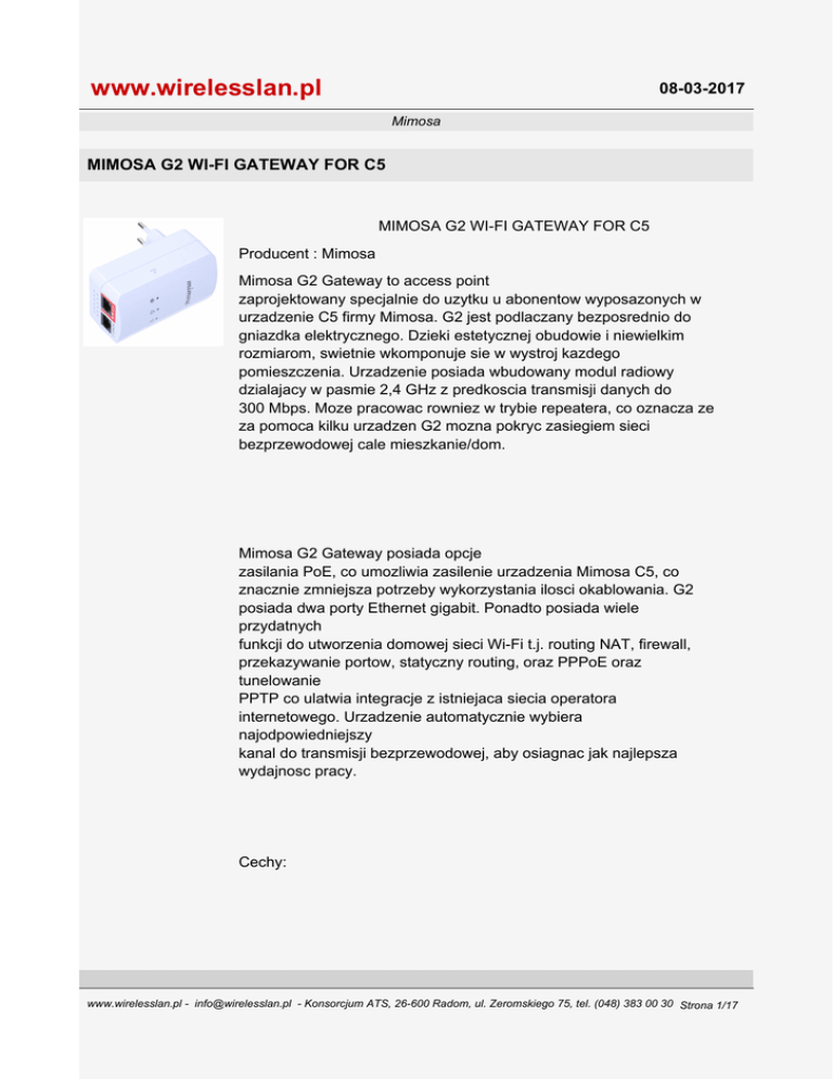 www.wirelesslan.pl 08-03-2017 Mimosa MIMOSA G2 WI-FI GATEWAY FOR C5 MIMOSA G2 WI-FI GATEWAY FOR C5 Producent : Mimosa Mimosa G2 Gateway to access point zaprojektowany specjalnie do uzytku u abonentow wyposazonych w urzadzenie C5 firmy Mimosa. G2 jest podlaczany bezposrednio do gniazdka elektrycznego. Dzieki estetycznej obudowie i niewielkim rozmiarom, swietnie wkomponuje sie w wystroj kazdego pomieszczenia. Urzadzenie posiada wbudowany modul radiowy dzialajacy w pasmie 2,4 GHz z predkoscia transmisji danych do 300 Mbps. Moze pracowac rowniez w trybie repeatera, co oznacza ze za pomoca kilku urzadzen G2 mozna pokryc zasiegiem sieci bezprzewodowej cale mieszkanie/dom. Mimosa G2 Gateway posiada opcje zasilania PoE, co umozliwia zasilenie urzadzenia Mimosa C5, co znacznie zmniejsza potrzeby wykorzystania ilosci okablowania. G2 posiada dwa porty Ethernet gigabit. Ponadto posiada wiele przydatnych funkcji do utworzenia domowej sieci Wi-Fi t.j. routing NAT, firewall, przekazywanie portow, statyczny routing, oraz PPPoE oraz tunelowanie PPTP co ulatwia integracje z istniejaca siecia operatora internetowego. Urzadzenie automatycznie wybiera najodpowiedniejszy kanal do transmisji bezprzewodowej, aby osiagnac jak najlepsza wydajnosc pracy. Cechy: www.wirelesslan.pl - [email protected] - Konsorcjum ATS, 26-600 Radom, ul. Zeromskiego 75, tel. (048) 383 00 30 Strona 1/17 www.wirelesslan.pl 08-03-2017 punkt dostepowy podlaczany bezposrednio do gniazdka elektrycznego; transmisja Wi-Fi w pasmie 2,4 GHz; przepustowosc do 300 Mb/s (standard 802.11n); tryb pracy wzmacniacza sygnalu (repeatera); wyjscie PoE (48 V, 210 mA) do zasilania urzadzenia Mimosa C5; 2 gigabitowe porty Ethernet; mozliwosc stworzenia sieci dla gosci; PPPOE i PPTP tunneling; NAT, zapora sieciowa, port forwarding, statyczny routing. Specyfikacja: www.wirelesslan.pl - [email protected] - Konsorcjum ATS, 26-600 Radom, ul. Zeromskiego 75, tel. (048) 383 00 30 Strona 2/17 www.wirelesslan.pl 08-03-2017 Mimosa G2 Wydajnosc Maksymalna przepustowosc 300 Mb/s Maksymalna ilosc klientow 100 www.wirelesslan.pl - [email protected] - Konsorcjum ATS, 26-600 Radom, ul. Zeromskiego 75, tel. (048) 383 00 30 Strona 3/17 www.wirelesslan.pl 08-03-2017 Protokol bezprzewodowy 802.11n Tryby Router + WiFi Wzmacniacz sygnalu Access Point PoE Passthrough Radio www.wirelesslan.pl - [email protected] - Konsorcjum ATS, 26-600 Radom, ul. Zeromskiego 75, tel. (048) 383 00 30 Strona 4/17 www.wirelesslan.pl 08-03-2017 MIMO / modulacja 2x2:2 MIMO OFDM do 64-QAM Szerokosc kanalu 20/40 MHz Zakres czestotliwosci 2400 - 2484 MHz www.wirelesslan.pl - [email protected] - Konsorcjum ATS, 26-600 Radom, ul. Zeromskiego 75, tel. (048) 383 00 30 Strona 5/17 www.wirelesslan.pl 08-03-2017 Maksymalna moc nadawcza 16 dBm Czulosc odbioru (przy MCS0) -84 dBm przy kanale 40 MHz -88 dBm przy kanale 20 MHz Antena Typ www.wirelesslan.pl - [email protected] - Konsorcjum ATS, 26-600 Radom, ul. Zeromskiego 75, tel. (048) 383 00 30 Strona 6/17 www.wirelesslan.pl 08-03-2017 Wewnetrzna Rodzaj Dookolna Cechy fizyczne Wymiary Szerokosc: 57 mm Wysokosc: 42 mm Dlugosc: 92 mm www.wirelesslan.pl - [email protected] - Konsorcjum ATS, 26-600 Radom, ul. Zeromskiego 75, tel. (048) 383 00 30 Strona 7/17 www.wirelesslan.pl 08-03-2017 Waga 0,147 kg Obudowa Wykonana z tworzywa sztucznego odpornego na promieniowanie UV Montaz Podlaczanie bezposrednio do gniazdka elektrycznego www.wirelesslan.pl - [email protected] - Konsorcjum ATS, 26-600 Radom, ul. Zeromskiego 75, tel. (048) 383 00 30 Strona 8/17 www.wirelesslan.pl 08-03-2017 Zasilanie Maksymalny pobor mocy 14 W Wejscie 100 - 240 V AC 0,6 A 50 - 60 Hz Zabezpieczenie nadnapieciowe i nadpradowe www.wirelesslan.pl - [email protected] - Konsorcjum ATS, 26-600 Radom, ul. Zeromskiego 75, tel. (048) 383 00 30 Strona 9/17 www.wirelesslan.pl 08-03-2017 Wyjscie 48 V, 210 mA Cechy srodowiskowe Dopuszczalna temperatura pracy Od 0 do 40 st. C Dopuszczalna wilgotnosc powietrza www.wirelesslan.pl - [email protected] - Konsorcjum ATS, 26-600 Radom, ul. Zeromskiego 75, tel. (048) 383 00 30 Strona 10/17 www.wirelesslan.pl 08-03-2017 5%-95% niekondensujaca Dopuszczalna temperatura przechowywania od -25 do 65 st. C Funkcjonalnosc Interfejs sieciowy WAN - gigabitowy port Ethernet 10/100/1000-BASE-T LAN - gigabitowy port Ethernet 10/100/1000-BASE-T www.wirelesslan.pl - [email protected] - Konsorcjum ATS, 26-600 Radom, ul. Zeromskiego 75, tel. (048) 383 00 30 Strona 11/17 www.wirelesslan.pl 08-03-2017 Wyjscie PoE 48 V PoE na porcie WAN do urzadzen Mimosa C5 Pre konfiguracja Plug and play do szybkiej instalacji Informacje do logowania wydrukowane na urzadzeniu Zarzadzanie kanalami Automatyczne wybieranie najlepszego kanalu www.wirelesslan.pl - [email protected] - Konsorcjum ATS, 26-600 Radom, ul. Zeromskiego 75, tel. (048) 383 00 30 Strona 12/17 www.wirelesslan.pl 08-03-2017 Automatyczne unikanie interferencji Tryb automatyczny Automatyczna konfiguracja wzmacniania sygnalu oraz trybu access point Zarzadzanie Mimosa Cloud monitoring Wylaczanie konfiguracji z poziomu LAN Zarzadzanie lista kontroli dostepu SNMP v1, v2c, v3 Syslog www.wirelesslan.pl - [email protected] - Konsorcjum ATS, 26-600 Radom, ul. Zeromskiego 75, tel. (048) 383 00 30 Strona 13/17 www.wirelesslan.pl 08-03-2017 SSID Predefiniowana siec domowa i dla gosci Izolacja gosci Do 4 SSID Routing NAT, DHCP serwer, zapora sieciowa (stateful packet inspection), port forwarding, statyczny routing Tunneling / uwierzytelnianie PPPoE, PPTP www.wirelesslan.pl - [email protected] - Konsorcjum ATS, 26-600 Radom, ul. Zeromskiego 75, tel. (048) 383 00 30 Strona 14/17 www.wirelesslan.pl 08-03-2017 Zabezpieczenia WPA/WPA2 Personal (PSK) WPA/WPA2 Enterprise (802.1x) AES, TKIP, WEP 64/128 QoS EDCA WMM pre konfigurowana 4 poziomowa funkcja QoS Ograniczenie przepustowosci WMM oszczedzanie energii Certyfikaty www.wirelesslan.pl - [email protected] - Konsorcjum ATS, 26-600 Radom, ul. Zeromskiego 75, tel. (048) 383 00 30 Strona 15/17 www.wirelesslan
