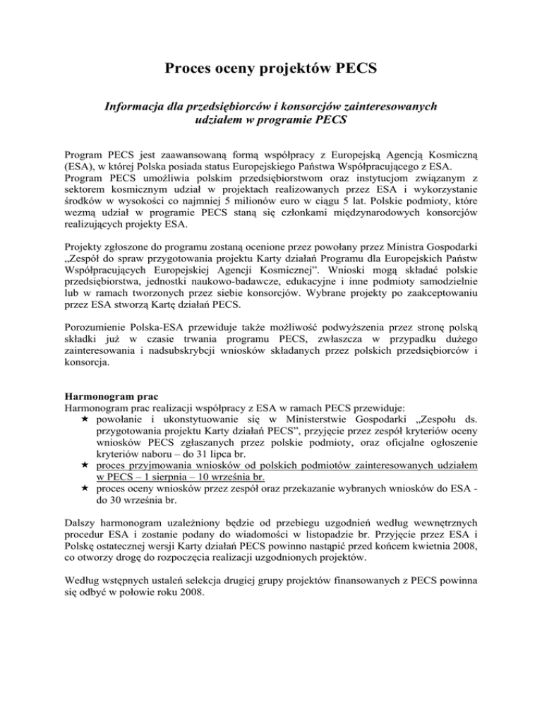 Proces oceny projektów PECS Informacja dla przedsiębiorców i konsorcjów zainteresowanych udziałem w programie PECS Program PECS jest zaawansowaną formą współpracy z Europejską Agencją Kosmiczną (ESA), w której Polska posiada status Europejskiego Państwa Współpracującego z ESA. Program PECS umożliwia polskim przedsiębiorstwom oraz instytucjom związanym z sektorem kosmicznym udział w projektach realizowanych przez ESA i wykorzystanie środków w wysokości co najmniej 5 milionów euro w ciągu 5 lat. Polskie podmioty, które wezmą udział w programie PECS staną się członkami międzynarodowych konsorcjów realizujących projekty ESA. Projekty zgłoszone do programu zostaną ocenione przez powołany przez Ministra Gospodarki „Zespół do spraw przygotowania projektu Karty działań Programu dla Europejskich Państw Współpracujących Europejskiej Agencji Kosmicznej”. Wnioski mogą składać polskie przedsiębiorstwa, jednostki naukowo-badawcze, edukacyjne i inne podmioty samodzielnie lub w ramach tworzonych przez siebie konsorcjów. Wybrane projekty po zaakceptowaniu przez ESA stworzą Kartę działań PECS. Porozumienie Polska-ESA przewiduje także możliwość podwyższenia przez stronę polską składki już w czasie trwania programu PECS, zwłaszcza w przypadku dużego zainteresowania i nadsubskrybcji wniosków składanych przez polskich przedsiębiorców i konsorcja. Harmonogram prac Harmonogram prac realizacji współpracy z ESA w ramach PECS przewiduje: powołanie i ukonstytuowanie się w Ministerstwie Gospodarki „Zespołu ds. przygotowania projektu Karty działań PECS”, przyjęcie przez zespół kryteriów oceny wniosków PECS zgłaszanych przez polskie podmioty, oraz oficjalne ogłoszenie kryteriów naboru – do 31 lipca br. proces przyjmowania wniosków od polskich podmiotów zainteresowanych udziałem w PECS – 1 sierpnia – 10 września br. proces oceny wniosków przez zespół oraz przekazanie wybranych wniosków do ESA do 30 września br. Dalszy harmonogram uzależniony będzie od przebiegu uzgodnień według wewnętrznych procedur ESA i zostanie podany do wiadomości w listopadzie br. Przyjęcie przez ESA i Polskę ostatecznej wersji Karty działań PECS powinno nastąpić przed końcem kwietnia 2008, co otworzy drogę do rozpoczęcia realizacji uzgodnionych projektów. Według wstępnych ustaleń selekcja drugiej grupy projektów finansowanych z PECS powinna się odbyć w połowie roku 2008. Składanie wniosków Do opublikowanego w końcu lipca dokumentu precyzującego kryteria oceny projektów PECS, zostanie dołączony specjalny formularz zgłoszeniowy, na którym powinien się znaleźć: opis projektu, wstępny szacunek i struktura kosztów oraz kalendarz jego realizacji. Proces składania wniosków zakończy się 10 września 2007 roku. Kryteria oceny projektów Wnioski będą oceniane według kryteriów, które zostaną przyjęte przez zespół w Ministerstwie Gospodarki. Wstępne propozycje obejmują preferencje dla projektów z następujących dziedzin: inżynierii kosmicznej (wraz z segmentem naziemnym), satelitarnych obserwacji Ziemi, telekomunikacji, nawigacji satelitarnej oraz projekty związane z programem edukacyjnym ESA w w/w obszarach. Oczekuje się, iż wnioski będą odnosić się do planowanych i bieżących projektów ESA, znajdujących się w chwili rozpatrywania wniosku w fazie realizacyjnej A i B oraz we wstępnej fazie C. Preferencje mają uzyskać projekty prowadzone w ramach konsorcjów (tworzonych przez polskie podmioty), których liderem jest jednostka z sektora przemysłowego. Projekty oceniane będą pod kątem korzyści ekonomicznych, technologicznych i społecznych, które ich realizacja może przynieść w dłuższej perspektywie rynkowi i użytkownikowi polskiemu, ze szczególnym uwzględnieniem możliwości wykorzystania wartości innowacyjnych produktów finalnych projektu przez partnera polskiego. Ostateczne wyłonienie projektów dopuszczonych do PECS Wyselekcjonowane zgodnie z kryteriami wnioski zostaną przekazane przez stronę polską do ESA, gdzie po konsultacjach z odpowiednimi jednostkami programowymi Agencji nastąpi ostateczne wyłonienie projektów i instytucji polskich zaproszonych do współpracy z ESA w ramach programu PECS. Ostateczne uzgodnienie Karty PECS powinno nastąpić przed końcem kwietnia 2008, co pozwoli na rozpoczęcie realizacji projektów. Dodatkowe informacje Informacje o toczących się obecnie i planowanych projektach ESA można znaleźć na stronie Portalu Przemysłowego ESA http://www.esa.int/home-ind/index.html. Szczegółową listę obecnych i przyszłych projektów do których przystąpienie mogą rozważać polscy przedsiębiorcy można znaleźć w Elektronicznym Systemie Zaproszeń do Składania Ofert EMITS: http://emits.esa.int/emits/owa/emits.main Już obecnie bez posiadania specjalnego hasła pod powyższym adresem można znaleźć podstawowe informacje o bieżących i planowanych projektach. Umowa PECS przewiduje, iż po jej ratyfikowaniu, zainteresowane przedsiębiorstwa zarejestrowane w Polsce uzyskają dostęp do szczegółowych informacji systemu EMITS (w formule „tylko do wglądu” dla programów Agencji i pełnej formule dla działań ujętych w PECS oraz wspólnych programów ESA i UE). Dodatkowe informacje dostępne są również na stronie internetowej Polskiej Platformy Technologii Kosmicznych: http://www.spacetech.pl (zwłaszcza zakładka „Niezbędnik przedsiębiorcy”). Warto wiedzieć, że ESA od kilku lat kładzie duży nacisk na wsparcie udziału małych i średnich przedsiębiorstw (MSP) przy dokonywanych przez siebie zamówieniach. Działania takie realizuje się przy pomocy dedykowanych do tego celów instrumentów, jak np. ograniczanie pewnych działań wyłącznie do MSP, czy zachęcanie dużych przedsiębiorstw do współdziałania z MSP. Program PECS opiera się na „Porozumieniu o Europejskim Państwie Współpracującym pomiędzy R