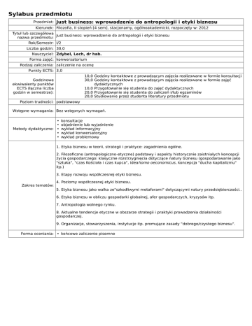 Sylabus przedmiotu Przedmiot: Just business: wprowadzenie do antropologii i etyki biznesu Kierunek: Filozofia, II stopień [4 sem], stacjonarny, ogólnoakademicki, rozpoczęty w: 2012 Tytuł lub szczegółowa Just business: wprowadzenie do antropologii i etyki biznesu nazwa przedmiotu: Rok/Semestr: I/2 Liczba godzin: 30,0 Nauczyciel: Zdybel, Lech, dr hab. Forma zajęć: konwersatorium Rodzaj zaliczenia: zaliczenie na ocenę Punkty ECTS: 3,0 10,0 Godziny kontaktowe z prowadzącym zajęcia realizowane w formie konsultacji 30,0 Godziny kontaktowe z prowadzącym zajęcia realizowane w formie zajęć dydaktycznych 10,0 Przygotowanie się studenta do zajęć dydaktycznych 20,0 Przygotowanie się studenta do zaliczeń i/lub egzaminów 20,0 Studiowanie przez studenta literatury przedmiotu Godzinowe ekwiwalenty punktów ECTS (łączna liczba godzin w semestrze): Poziom trudności: podstawowy Wstępne wymagania: Bez wstępnych wymagań. • • Metody dydaktyczne: • • • konsultacje objaśnienie lub wyjaśnienie wykład informacyjny wykład konwersatoryjny wykład problemowy 1. Etyka biznesu w teorii, strategii i praktyce: zagadnienia ogólne. 2. Filozoficzne (antropologiczno-etyczne) podstawy i aspekty historycznie zaistniałych koncepcji życia gospodarczego: klasyczne rozstrzygnięcia dotyczące natury biznesu (gospodarowanie jako "sztuka", "czas Kościoła i czas kupca", idea homo oeconomicus, koncepcja "ducha kapitalizmu" itp.) 3. Etapy rozwoju współczesnej etyki biznesu. Zakres tematów: 4. Poziomy współczesnej etyki biznesu. 5. Etyka biznesu jako walka ze"szkodliwymi metaforami" dotyczącymi natury przedsiębiorczości.. 6. Etyka biznesu w obliczu gospodarki globalnej, afer gospodarczych, kryzysów itp. 7. Antropologia wolnego rynku. 8. Aktualne tendencje etyczne w obszarze strategii i praktyki prowadzenia działalności gospodarczej. 9. Organizacje, stowarzyszenia, instytucje itp. promujące zasady "dobrego/czystego biznesu". Forma oceniania: • końcowe zaliczenie pisemne 1. Janina Filek,Wprowadzenie do etyki biznesu, Wyd. Akademii Ekonomicznej w Krakowie, Kraków 2001. 2. Mirosława Rybak,Etyka menedżera-społeczna odpowiedzialność przedsiębiorstwa , PWN, Warszawa 2004. 3. Elaine Sternberg,Czysty biznes. Etyka biznesu w działaniu, przeł. P.Łuków, PWN, Warszawa 1998. Literatura: 4.Etyka biznesu "po Enronie", pod red. J. Sójki, Wyd. Fundacji Humaniora, Poznań 2005. 5. Stephen Young,Etyczny kapitalizm. Jak na powrót połączyć prywatny interes z dobrem publicznym, przekład W. Kisiel, METAmorfoza, Wrocław 2005. 6. Michael Schermer,Rynkowy umysł. Empatyczne małpy, konkurujący ludzie i inne opowieści ekonomii ewolucyjnej, tłum. A. E. Eichler i P. J. Szwajer, Wydawnictwo CiS, Warszawa 2009. 7. Wojciech Gasparski,Decyzje i etyka w lobbingu i biznesie, Wydawnictwo Wyższej Szkoły Przedsiębiorczości i Zarządzania im. Leona Koźmińskiego, Warszawa 2003.