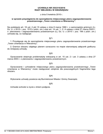 UCHWAŁA NR XXI/215/2016 RADY MIEJSKIEJ W SWARZĘDZU z dnia 5 kwietnia 2016 r. w sprawie przystąpienia do sporządzenia miejscowego planu zagospodarowania przestrzennego „Teren cmentarza w Wierzenicy”. Na podstawie art. 18 ust. 2 pkt 15 ustawy z dnia 8 marca 1990 r. o samorządzie gminnym (t.j. Dz. U. z 2015 r. poz. 1515 z późn. zm.) oraz art. 14 ust. 1, 2 i 4 ustawy z dnia 27 marca 2003 r. o planowaniu i zagospodarowaniu przestrzennym (t.j. Dz. U. z 2015 r. poz. 199 z późn. zm.) uchwala się, co następuje: § 1. 1. Przystępuje się do sporządzenia miejscowego planu zagospodarowania przestrzennego „Teren cmentarza w Wierzenicy”. 2. Granice obszaru objętego planem oznaczono na mapie stanowiącej załącznik graficzny do niniejszej uchwały. § 2. Opracowanie obejmuje problematykę wskazaną w art. 15 ust. 2 i ust. 3 ustawy z dnia 27 marca 2003 r. o planowaniu i zagospodarowaniu przestrzennym. § 3. Opracowanie i uchwalenie miejscowego planu zagospodarowania przestrzennego „Teren cmentarza w Wierzenicy” może następować odrębnie dla poszczególnych fragmentów tego obszaru. § 4. Wykonanie uchwały powierza się Burmistrzowi Miasta i Gminy Swarzędz. § 5. Uchwała wchodzi w życie z dniem podjęcia. Id: 113E436D-C04D-4214-A0AC-9B57D647B040. Podpisany Strona 1 Załącznik do uchwały Rady Miejskiej w Swarzędzu w sprawie przystąpienia do sporządzenia miejscowego planu zagospodarowania przestrzennego "Teren cmentarza w Wierzenicy". . Skala 1 : 2 000 0 50 Metry 200 100 12/5 Załącznik do uchwały Nr XXI/215/2016 Rady Miejskiej w Swarzędzu z dnia 5 kwietnia 2016 r. 13 15/2 8 15/1 113 14/3 37/2 12/4 17 38 37/1 ul. Wie 12/3 18 Oznaczenia r ze nic ka 16 19 Granica obszaru objętego planem. 22 Id: 113E436D-C04D-4214-A0AC-9B57D647B040. Podpisany 34/28 36 Strona 2 Uzasadnienie DO UCHWAŁY NR XXI/215/2016 RADY MIEJSKIEJ W SWARZĘDZU z dnia 5 kwietnia 2016 r. w sprawie przystąpienia do sporządzenia miejscowego planu zagospodarowania przestrzennego „Teren cmentarza w Wierzenicy”. Przystąpienie do sporządzenia miejscowego planu zagospodarowania przestrzennego związane jest z koniecznością pozyskania nowych terenów grzebalnych, wobec czego na wniosek Referatu Geodezji i Nieruchomości Urzędu Miasta i Gminy w Swarzędzu postanowiono powiększyć istniejący cmentarz w Wierzenicy o teren przyległych gruntów stanowiących część działki o nr ewid. 13 w Wierzenicy. Zgodnie z ustaleniami przepisów odrębnych (w tym: art. 3 ustawy z dnia 31 stycznia 1959 r. o cmentarzach i chowaniu zmarłych) cmentarze zakłada się i rozszerza na terenach określonych w miejscowych planach zagospodarowania przestrzennego. W związku z tym, że przedmiotowy teren nie posiada miejscowego planu zagospodarowania przestrzennego, wymagane jest od władz samorządowych przystąpienie do jego sporządzenia celem rozszerzenia terenu cmentarza. Jednocześnie zasadnym jest objęcie procedurą planu całego obszaru, zarówno obejmującego istniejący cmentarz, jak i obszar planowanego rozszerzenia tego cmentarza, albowiem łącznie stanowić on będzie jeden kompleks funkcjonalno-przestrzenny. Obszar objęty uchwałą ma powierzchnię ca. 2,62 ha i położony jest w rejonie ulicy Wierzenickiej w Wierzenicy. Stanowią go działki o nr ewid. 15/1 i 15/2, na których funkcjonuje obecny cmentarz oraz część działki o nr ewid. 13, która użytkowana jest rolniczo. Dla terenu objętego planem wykonano analizy dotyczące zasadności przystąpienia do sporządzenia miejscowego planu zagospodarowania przestrzennego i stopnia zgodności przewidywanych rozwiązań z ustaleniami Studium. Na podstawie powyższych analiz Burmistrz Miasta i Gminy Swarzędz stwierdził, że sposób zagospodarowania terenu objętego uchwałą jest zgodny z ustaleniami obecnie obowiązującego Studium uwarunkowań i kierunków zagospodarowania przestrzennego miasta i gminy Swarzędz, zatwierdzonego Uchwałą Nr X/51/2011 Rady Miejskiej w Swarzędzu z dnia 29 marca 2011 r.), według którego ww. obszar jest wskazywany jako: – teren cmentarzy, oznaczony symbolem ZC, – tereny rolnicze, oznaczone symbolem R, – teren projektowanego oznaczony symbolem ZN3. zespołu przyrodniczo-krajobrazowego „Remizy śródpolne”, Ponad to teren proponowany do objęcia granicą miejscowego planu zagospodarowania przestrzennego określony jest jako Strefa G ochrony korytarzy ekologicznych oraz znajduje się w otulinie Parku Krajobrazowego „Puszcza Zielonka”. Biorąc powyższe pod uwagę, należy uznać za zasadne przyjęcie przedmiotowej uchwały. Id: 113E436D-C04D-4214-A0AC-9B57D647B040. Podpisany Strona 1
