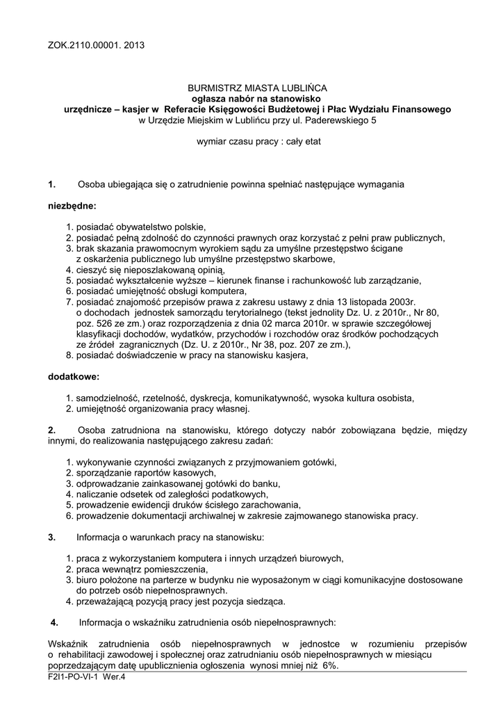 ZOK.2110.00001. 2013 BURMISTRZ MIASTA LUBLIŃCA ogłasza nabór na stanowisko urzędnicze – kasjer w Referacie Księgowości Budżetowej i Płac Wydziału Finansowego w Urzędzie Miejskim w Lublińcu przy ul. Paderewskiego 5 wymiar czasu pracy : cały etat 1. Osoba ubiegająca się o zatrudnienie powinna spełniać następujące wymagania niezbędne: 1. posiadać obywatelstwo polskie, 2. posiadać pełną zdolność do czynności prawnych oraz korzystać z pełni praw publicznych, 3. brak skazania prawomocnym wyrokiem sądu za umyślne przestępstwo ścigane z oskarżenia publicznego lub umyślne przestępstwo skarbowe, 4. cieszyć się nieposzlakowaną opinią, 5. posiadać wykształcenie wyższe – kierunek finanse i rachunkowość lub zarządzanie, 6. posiadać umiejętność obsługi komputera, 7. posiadać znajomość przepisów prawa z zakresu ustawy z dnia 13 listopada 2003r. o dochodach jednostek samorządu terytorialnego (tekst jednolity Dz. U. z 2010r., Nr 80, poz. 526 ze zm.) oraz rozporządzenia z dnia 02 marca 2010r. w sprawie szczegółowej klasyfikacji dochodów, wydatków, przychodów i rozchodów oraz środków pochodzących ze źródeł zagranicznych (Dz. U. z 2010r., Nr 38, poz. 207 ze zm.), 8. posiadać doświadczenie w pracy na stanowisku kasjera, dodatkowe: 1. samodzielność, rzetelność, dyskrecja, komunikatywność, wysoka kultura osobista, 2. umiejętność organizowania pracy własnej. 2. Osoba zatrudniona na stanowisku, którego dotyczy nabór zobowiązana będzie, między innymi, do realizowania następującego zakresu zadań: 1. wykonywanie czynności związanych z przyjmowaniem gotówki, 2. sporządzanie raportów kasowych, 3. odprowadzanie zainkasowanej gotówki do banku, 4. naliczanie odsetek od zaległości podatkowych, 5. prowadzenie ewidencji druków ścisłego zarachowania, 6. prowadzenie dokumentacji archiwalnej w zakresie zajmowanego stanowiska pracy. 3. Informacja o warunkach pracy na stanowisku: 1. praca z wykorzystaniem komputera i innych urządzeń biurowych, 2. praca wewnątrz pomieszczenia, 3. biuro położone na parterze w budynku nie wyposażonym w ciągi komunikacyjne dostosowane do potrzeb osób niepełnosprawnych. 4. przeważającą pozycją pracy jest pozycja siedząca. 4. Informacja o wskaźniku zatrudnienia osób niepełnosprawnych: Wskaźnik zatrudnienia osób niepełnosprawnych w jednostce w rozumieniu przepisów o rehabilitacji zawodowej i społecznej oraz zatrudnianiu osób niepełnosprawnych w miesiącu poprzedzającym datę upublicznienia ogłoszenia wynosi mniej niż 6%. F2I1-PO-VI-1 Wer.4 5. Osoby ubiegające się o zatrudnienie powinny złożyć w zamkniętej kopercie w biurze podawczym Urzędu lub przesłać za pośrednictwem poczty do dnia 24 kwietnia 2013r. oferty pracy zawierające niżej wymienione własnoręcznie podpisane dokumenty: 1. list motywacyjny, 2. życiorys (CV), 3. oświadczenie kandydata o posiadaniu obywatelstwa polskiego, 4. oświadczenie o posiadaniu pełnej zdolności do czynności prawnych, 5. oświadczenie o korzystaniu z pełni praw publicznych, 6. oświadczenie o nie skazaniu prawomocnym wyrokiem sądu za umyślne przestępstwo ścigane z oskarżenia publicznego lub umyślne przestępstwo skarbowe, oraz 7. kopię dokumentu potwierdzającego posiadane wykształcenie (dyplom lub zaświadczenie o ukończeniu studiów), 8. kopie dokumentów potwierdzających doświadczenie zawodowe, 9. kopię dokumentu potwierdzającego niepełnosprawność - w przypadku kandydata, który zamierza skorzystać z uprawnienia, o którym mowa w art. 13a ust.2 ustawy z dnia 21 listopada 2008r. o pracownikach samorządowych ( Dz. U. z 2008r., Nr 223, poz.1458, ze zm.). Koperta winna być opatrzona dopiskiem „Nabór na stanowisko urzędnicze - kasjer w Referacie Księgowości Budżetowej i Płac”. Oferta pracy powinna być opatrzona własnoręcznie podpisaną klauzulą o następującej treści: „Wyrażam zgodę na przetwarzanie moich danych osobowych zawartych w ofercie pracy, zgodnie z ustawą z dnia 29 sierpnia 1997r. o ochronie danych osobowych (tekst jednolity Dz. U. z 2002r., Nr 101, poz. 926 ze zm.)”. 6. Osoby podejmujące zatrudnienie nie mogą naruszać przepisów art. 26 i 30 ustawy 21 listopada 2008r. o pracownikach samorządowych (Dz. U. Nr 223, poz. 1458 ze zm). z dnia 7. Szczegółowe zasady postępowania konkursowego zawiera instrukcja I1-PO-VI-1 Nabór Pracowników – dostęp poprzez stronę www.lubliniec.pl lub w Referacie Kadr Urzędu. Burmistrz Miasta Lublińca Edward Maniura F2I1-PO-VI-1 Wer.4