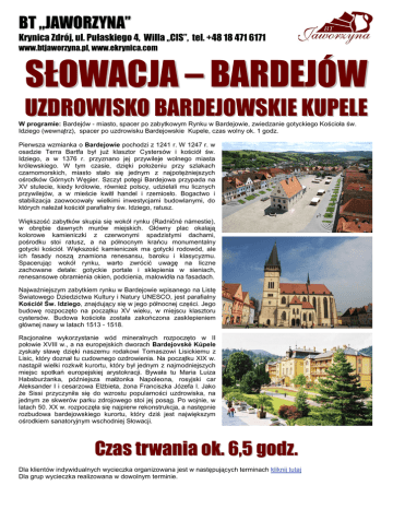 BT „JAWORZYNA” Krynica Zdrój, ul. Pułaskiego 4, Willa „CIS”, tel. +48 18 471 6171 www.btjaworzyna.pl, www.ekrynica.com SŁOWACJA – BARDEJÓW UZDROWISKO BARDEJOWSKIE KUPELE W programie: Bardejów - miasto, spacer po zabytkowym Rynku w Bardejowie, zwiedzanie gotyckiego Kościoła św. Idziego (wewnątrz), spacer po uzdrowisku Bardejowskie Kupele, czas wolny ok. 1 godz. Pierwsza wzmianka o Bardejowie pochodzi z 1241 r. W 1247 r. w osadzie Terra Bartfa był już klasztor Cystersów i kościół św. Idziego, a w 1376 r. przyznano jej przywileje wolnego miasta królewskiego. W tym czasie, dzięki położeniu przy szlakach czarnomorskich, miasto stało się jednym z najpotężniejszych ośrodków Górnych Węgier. Szczyt potęgi Bardejowa przypada na XV stulecie, kiedy królowie, również polscy, udzielali mu licznych przywilejów, a w mieście kwitł handel i rzemiosło. Bogactwo i stabilizacja zaowocowały wielkimi inwestycjami budowlanymi, do których należał kościół parafialny św. Idziego, ratusz. Większość zabytków skupia się wokół rynku (Radničné námestie), w obrębie dawnych murów miejskich. Główny plac okalają kolorowe kamieniczki z czerwonymi spadzistymi dachami, pośrodku stoi ratusz, a na północnym krańcu monumentalny gotycki kościół. Większość kamieniczek ma gotycki rodowód, ale ich fasady noszą znamiona renesansu, baroku i klasycyzmu. Spacerując wokół rynku, warto zwrócić uwagę na liczne zachowane detale: gotyckie portale i sklepienia w sieniach, renesansowe obramienia okien, podcienia, malowidła na fasadach. Najważniejszym zabytkiem rynku w Bardejowie wpisanego na Listę Światowego Dziedzictwa Kultury i Natury UNESCO, jest parafialny Kościół Św. Idziego, znajdujący się w jego północnej części. Jego budowę rozpoczęto na początku XV wieku, w miejscu klasztoru cystersów. Budowa kościoła została zakończona zasklepieniem głównej nawy w latach 1513 - 1518. Racjonalne wykorzystanie wód mineralnych rozpoczęto w II połowie XVIII w., a na europejskich dworach Bardejovské Kúpele zyskały sławę dzięki naszemu rodakowi Tomaszowi Lisickiemu z Lisic, który doznał tu cudownego ozdrowienia. Na początku XIX w. nastąpił wielki rozkwit kurortu, który był jednym z najmodniejszych miejsc spotkań europejskiej arystokracji. Bywała tu Maria Luiza Habsburżanka, późniejsza małżonka Napoleona, rosyjski car Aleksander I i cesarzowa Elżbieta, żona Franciszka Józefa I. Jako że Sissi przyczyniła się do wzrostu popularności uzdrowiska, na jednym ze skwerów parku zdrojowego stoi jej posąg. Po wojnie, w latach 50. XX w. rozpoczęła się najpierw rekonstrukcja, a następnie rozbudowa bardejowskiego kurortu, który dziś jest największym ośrodkiem sanatoryjnym wschodniej Słowacji. Czas trwania ok. 6,5 godz. Dla klientów indywidualnych wycieczka organizowana jest w następujących terminach kliknij tutaj Dla grup wycieczka realizowana w dowolnym terminie.